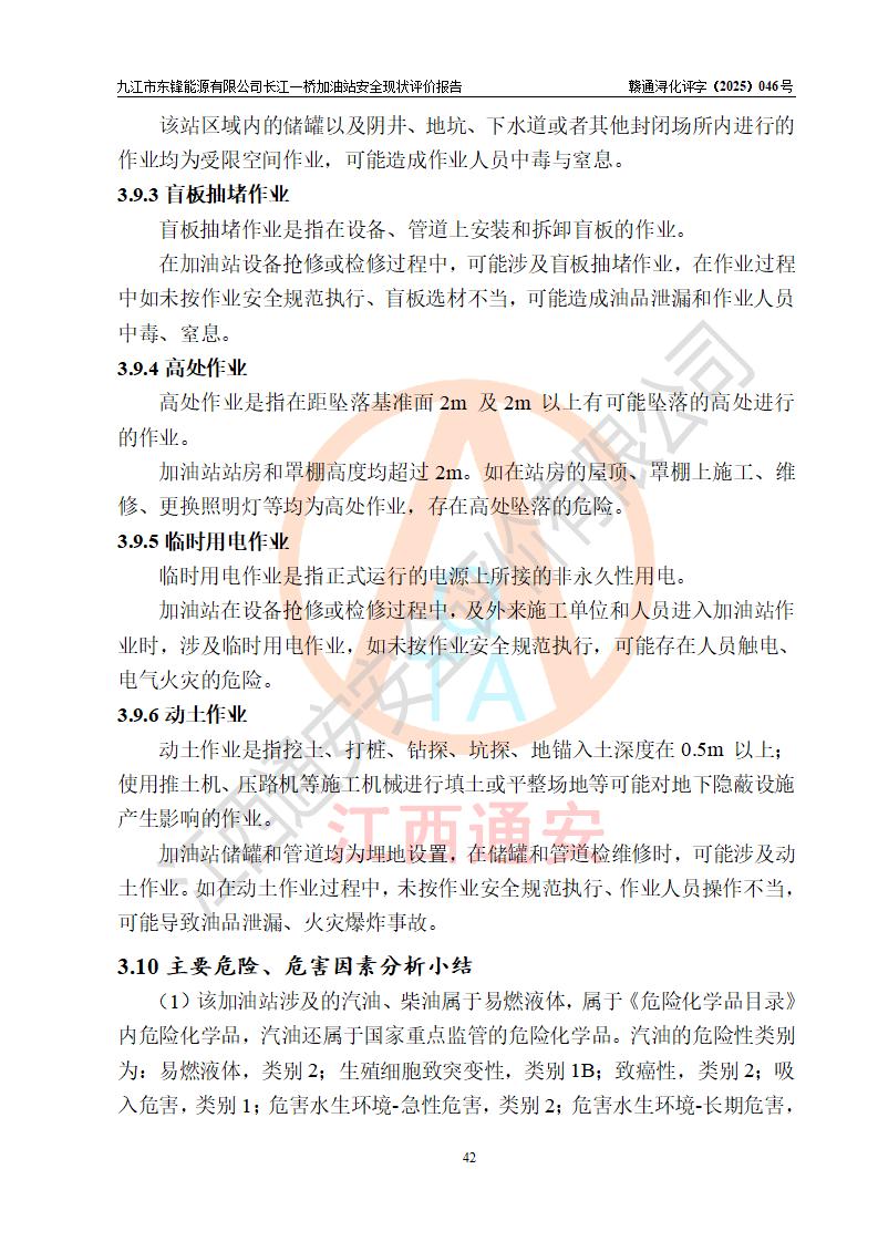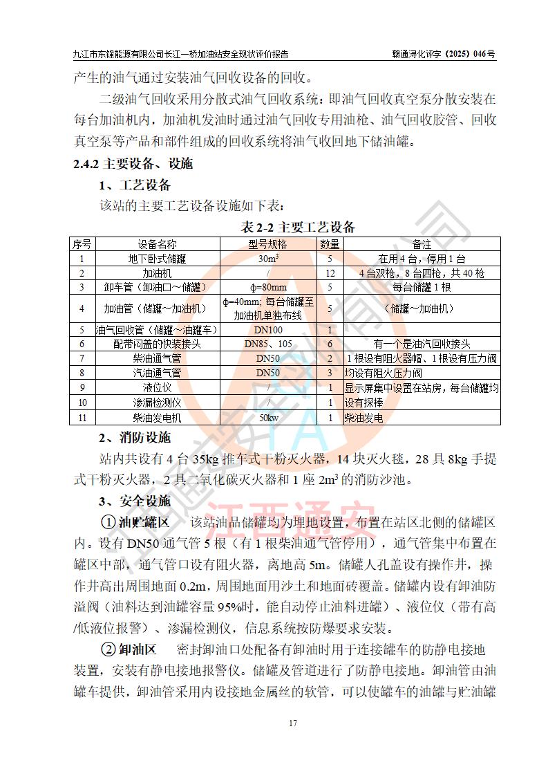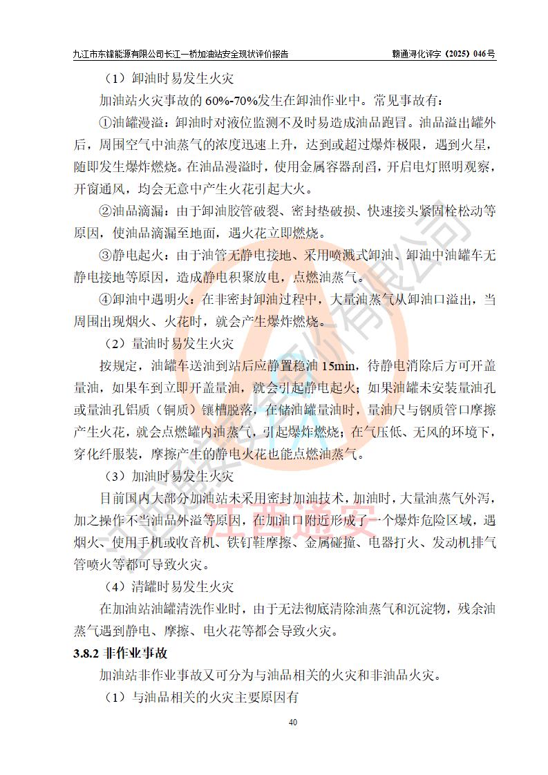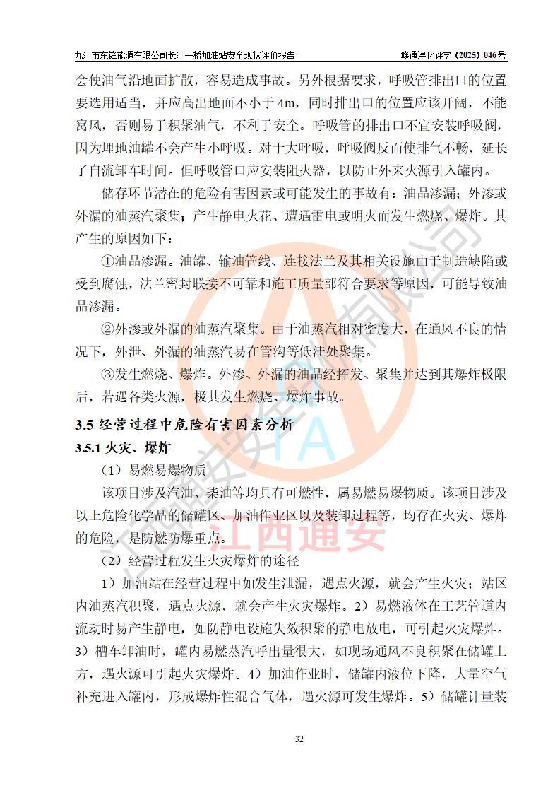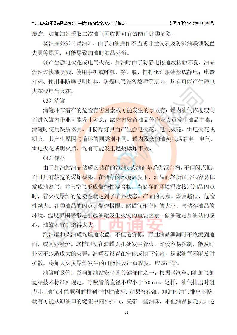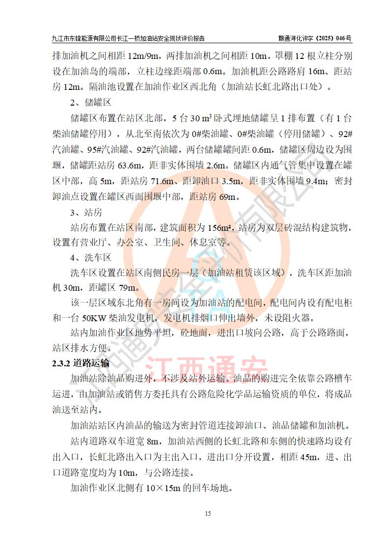 項(xiàng)目簡介 | 九江市東鋒能源有限公司長江一橋加油站是一家由自然人投資或控股的有限責(zé)任公司分公司,于2025年07月18日成立,負(fù)責(zé)人代大智,經(jīng)營場所位于江西省九江市潯陽區(qū)長虹北路16號,經(jīng)營范圍:危險(xiǎn)化學(xué)品經(jīng)營,成品油零售(依法須經(jīng)批準(zhǔn)的項(xiàng)目,經(jīng)相關(guān)部門批準(zhǔn)后在許可**期內(nèi)方可開展經(jīng)營活動,具體經(jīng)營項(xiàng)目和許可期限以相關(guān)部門批準(zhǔn)文件或許可證件為準(zhǔn))。 九江市潯陽區(qū)石油公司第八加油站是一家專門從事成品油零售經(jīng)營的集體分支結(jié)構(gòu)(非法人),經(jīng)營場所位于江西省九江市潯陽區(qū)長虹北路,現(xiàn)有從業(yè)人員33人,加油站負(fù)責(zé)人代大智。 為規(guī)范化、專業(yè)化經(jīng)營管理需要,九江市潯陽區(qū)石油公司第八加油站整體租賃給九江市東鋒能源有限公司長江一橋加油站進(jìn)行經(jīng)營,加油站租賃前后的設(shè)備設(shè)施和人員等均未變動。 該加油站占地面積約5000m2,站區(qū)內(nèi)設(shè)置有4臺雙槍和8臺四槍程控燃油加油機(jī)及配套的工藝管線,設(shè)有SF雙層儲罐5臺(在用4臺,有1臺30m3的0#柴油儲罐已停用),其中30m3的92#汽油儲罐2臺、30m3的95#汽油儲罐1臺、30m3的0#柴油儲罐1臺,油品儲罐總?cè)莘e為120m3(折算成汽油為105m3),按現(xiàn)行《汽車加油加氣加氫站技術(shù)標(biāo)準(zhǔn)》對加油站的等級劃分原則,屬二級加油站。 該站由九江市行政審批局換發(fā)《危險(xiǎn)化學(xué)品經(jīng)營許可證》(證號:贛九行審經(jīng)(甲)字[2022]0000107號),**期限2022年08月26日至2025年08月25日。 | |||