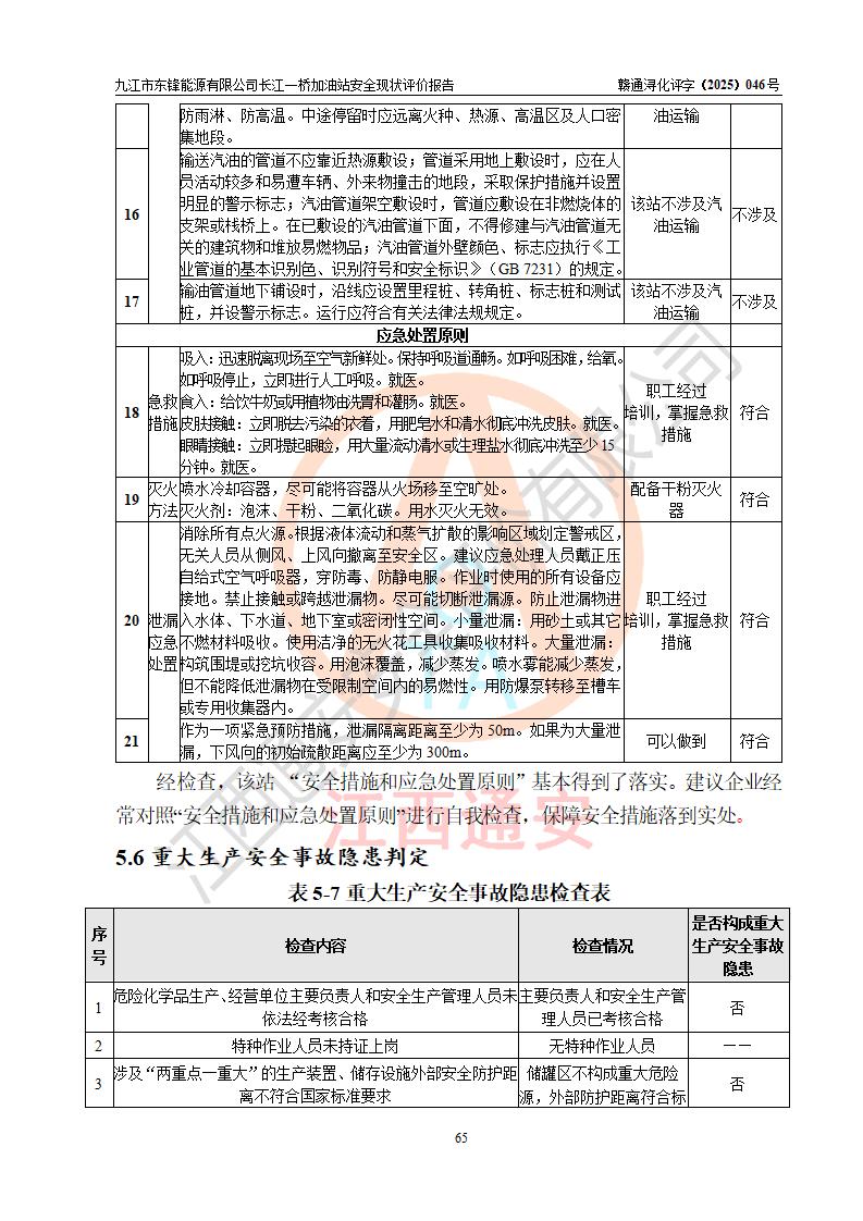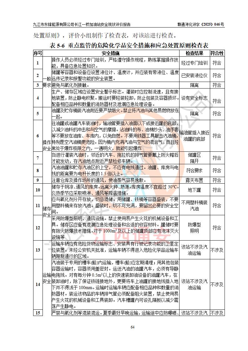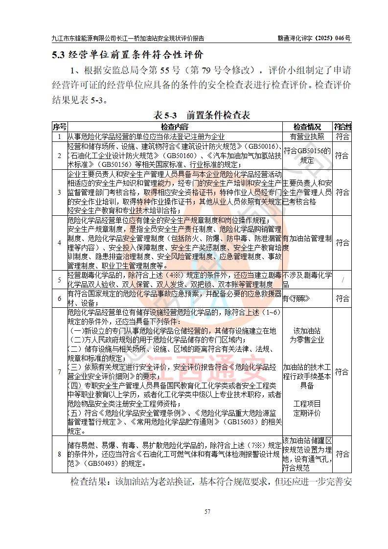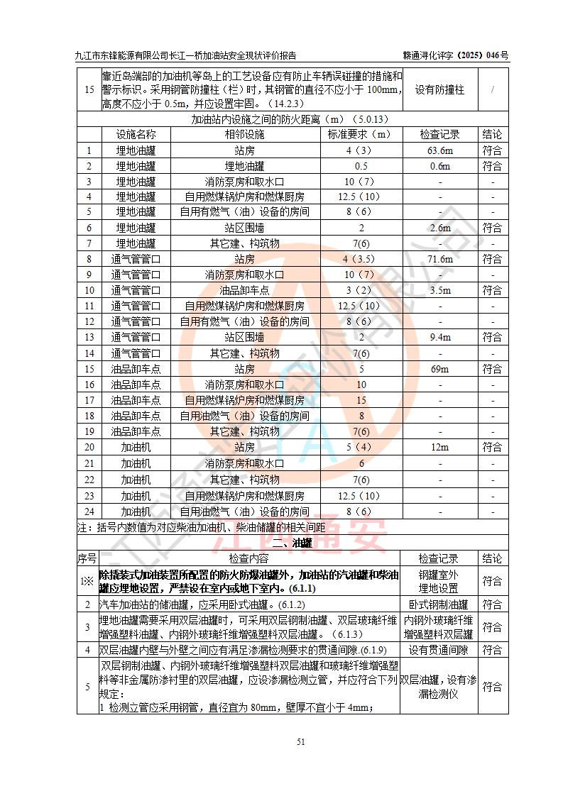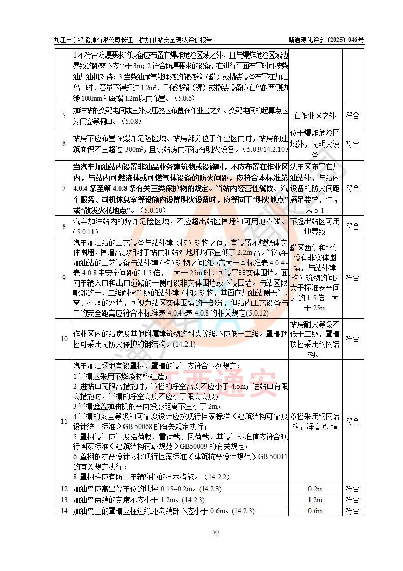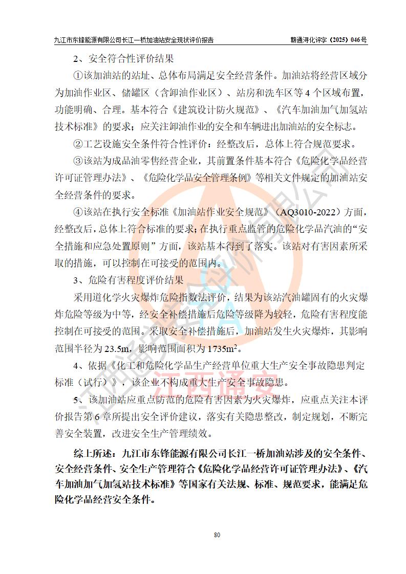 評價(jià)結(jié)論 | 九江市東鋒能源有限公司長江一橋加油站涉及的安全條件、安全經(jīng)營條件、安全生產(chǎn)管理符合《危險(xiǎn)化學(xué)品經(jīng)營許可證管理辦法》、《汽車加油加氣加氫站技術(shù)標(biāo)準(zhǔn)》等**有關(guān)法規(guī)、標(biāo)準(zhǔn)、規(guī)范要求,能滿足危險(xiǎn)化學(xué)品經(jīng)營安全條件。 | |||