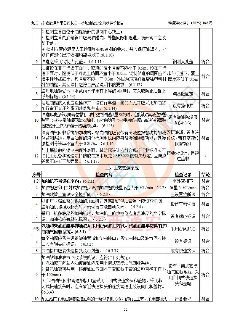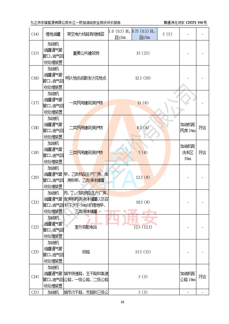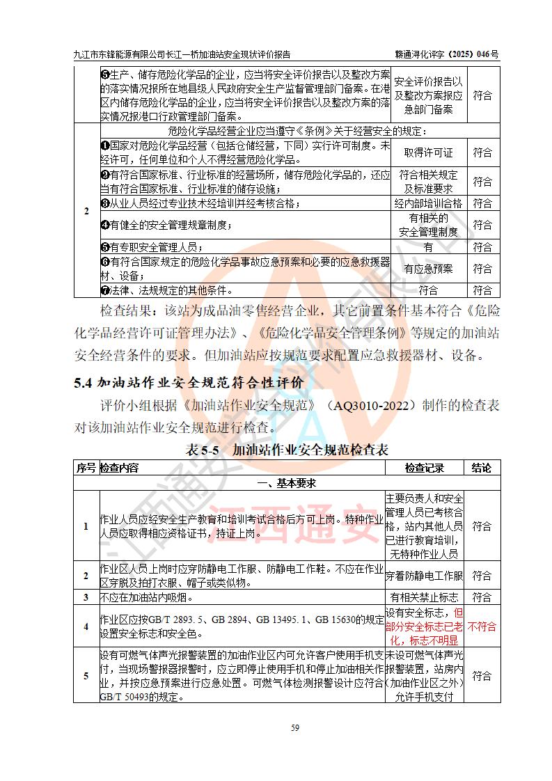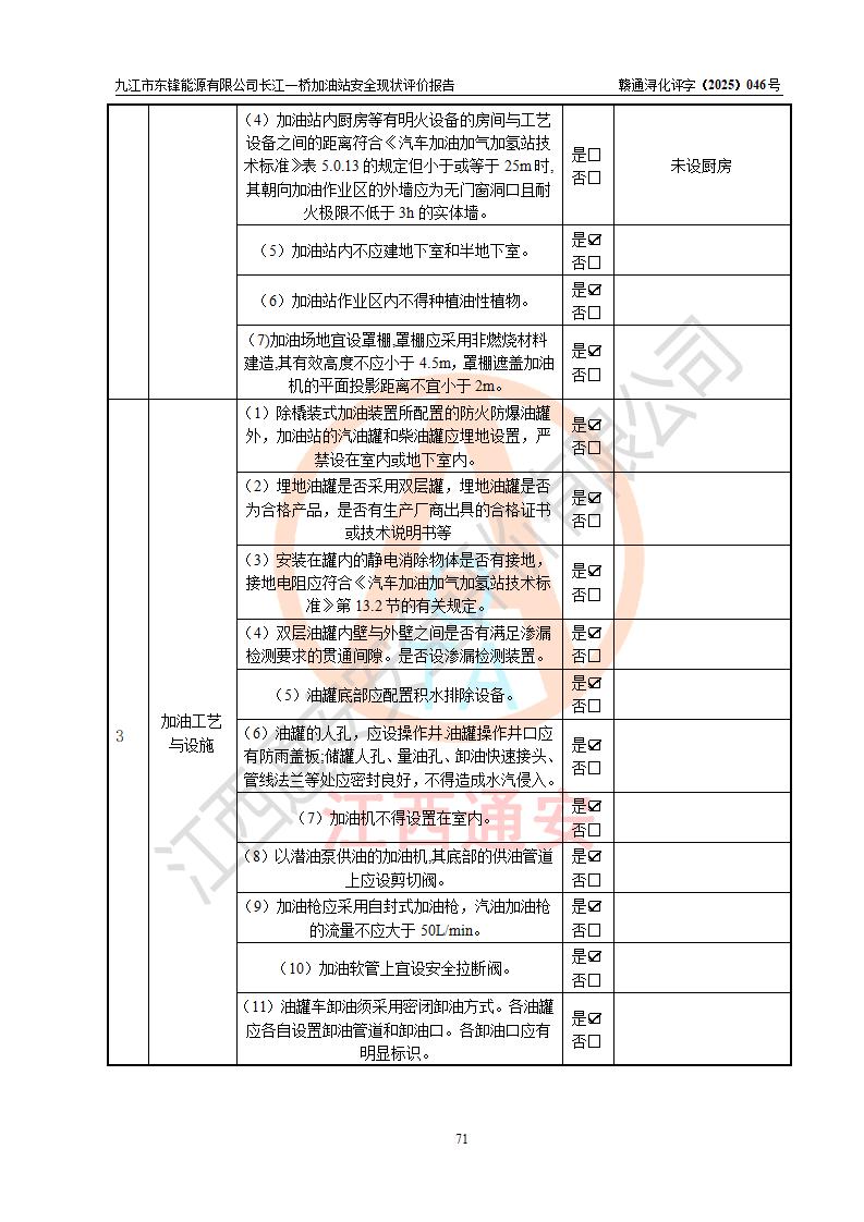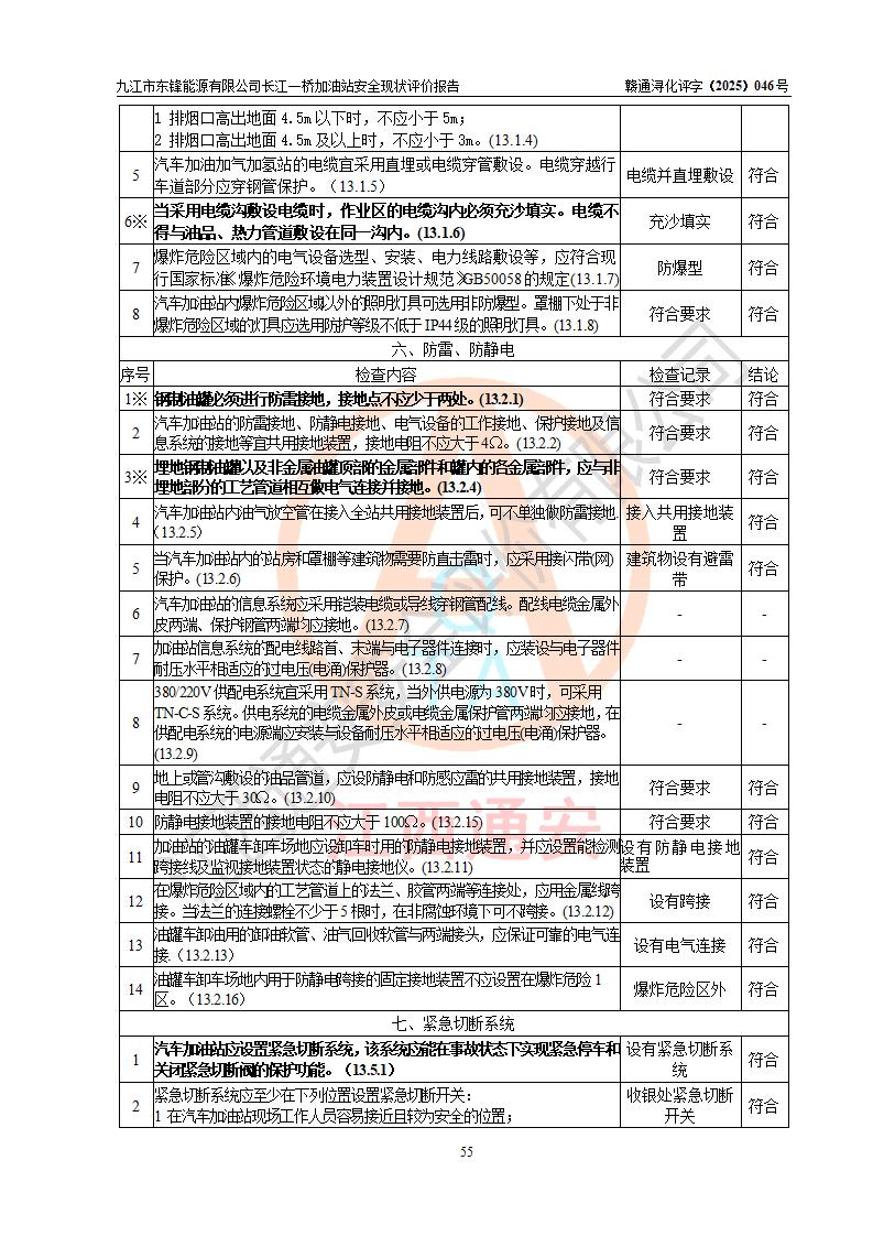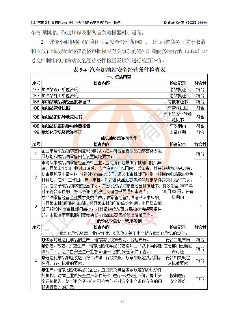 評價(jià)結(jié)論 | 九江市東鋒能源有限公司長江一橋加油站涉及的安全條件、安全經(jīng)營條件、安全生產(chǎn)管理符合《危險(xiǎn)化學(xué)品經(jīng)營許可證管理辦法》、《汽車加油加氣加氫站技術(shù)標(biāo)準(zhǔn)》等**有關(guān)法規(guī)、標(biāo)準(zhǔn)、規(guī)范要求,能滿足危險(xiǎn)化學(xué)品經(jīng)營安全條件。 | |||