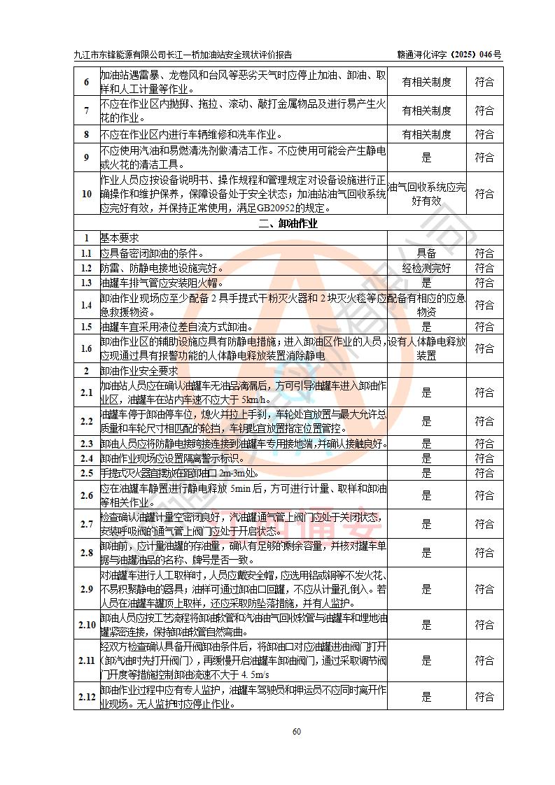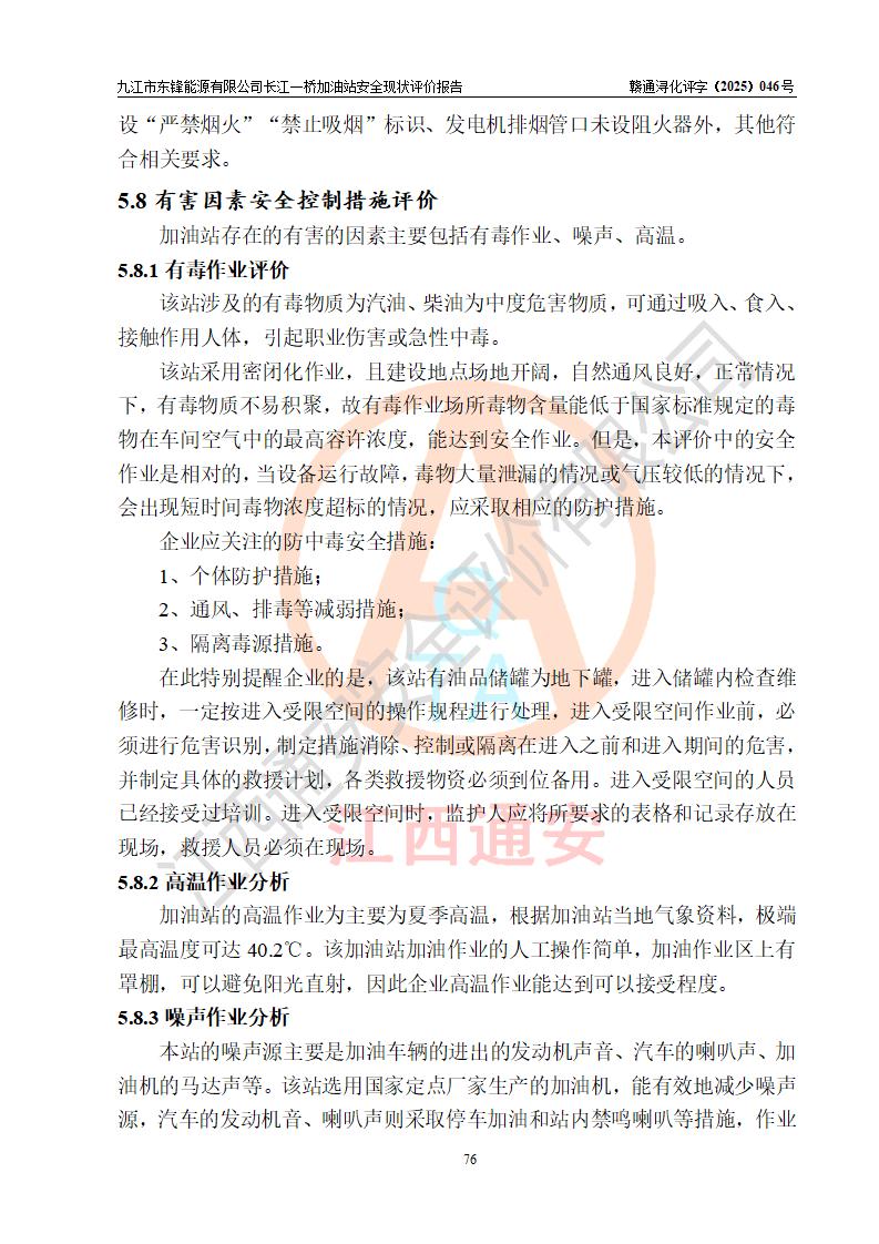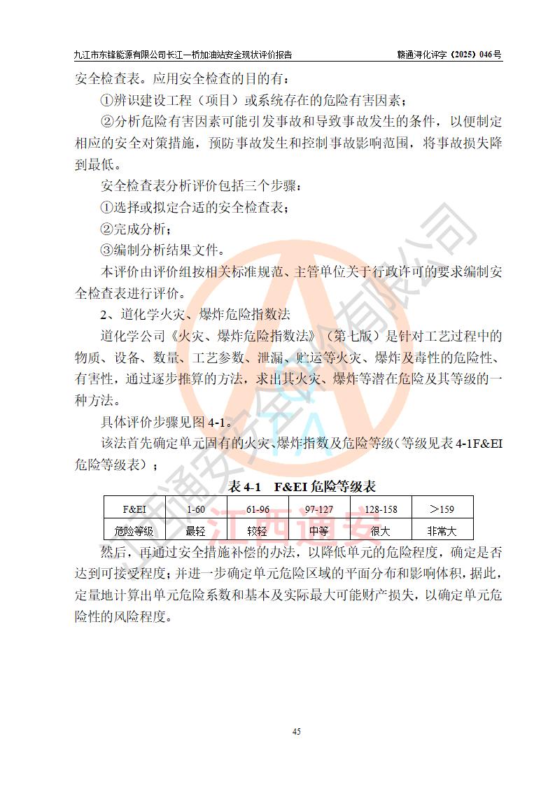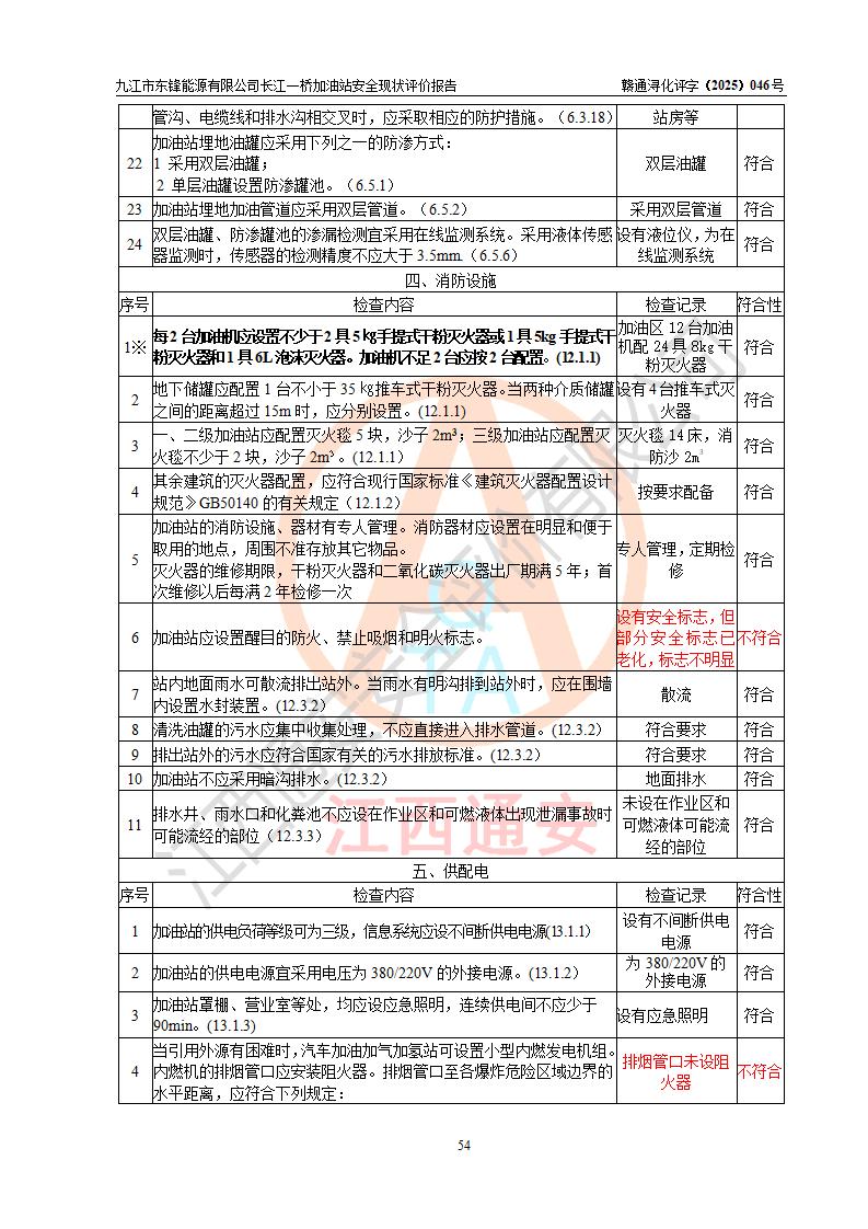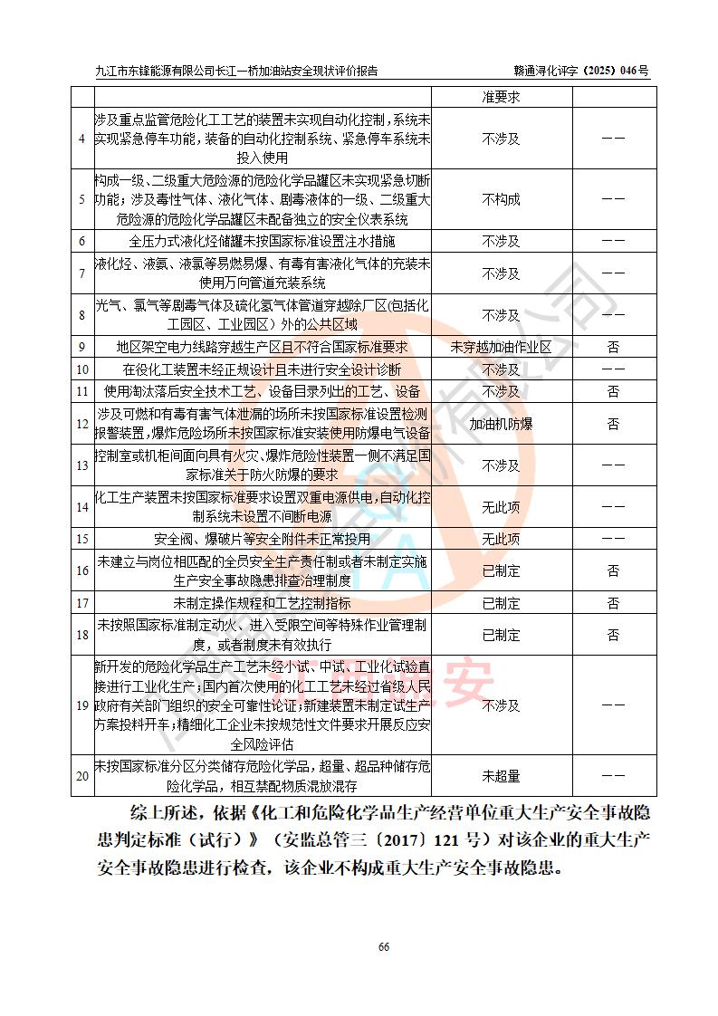 評價(jià)結(jié)論 | 九江市東鋒能源有限公司長江一橋加油站涉及的安全條件、安全經(jīng)營條件、安全生產(chǎn)管理符合《危險(xiǎn)化學(xué)品經(jīng)營許可證管理辦法》、《汽車加油加氣加氫站技術(shù)標(biāo)準(zhǔn)》等**有關(guān)法規(guī)、標(biāo)準(zhǔn)、規(guī)范要求,能滿足危險(xiǎn)化學(xué)品經(jīng)營安全條件。 | |||