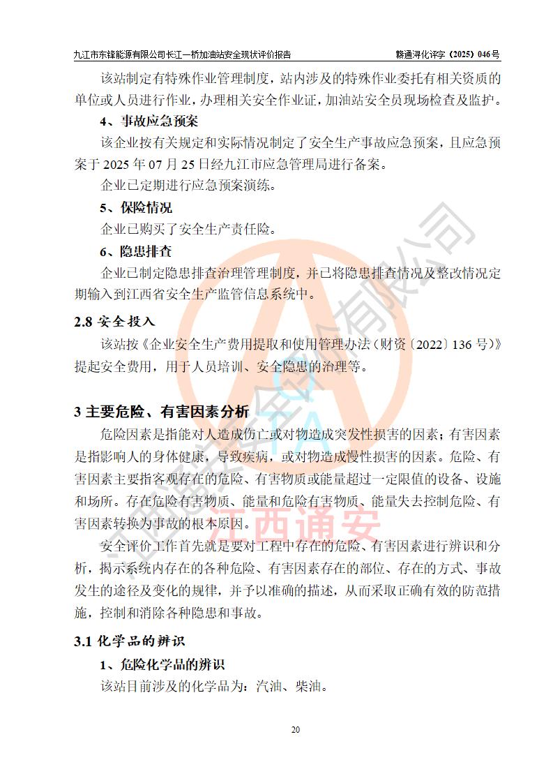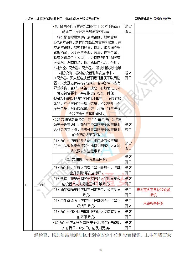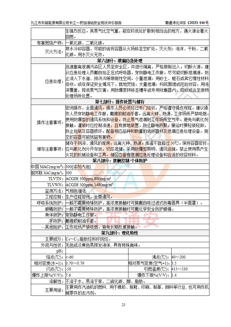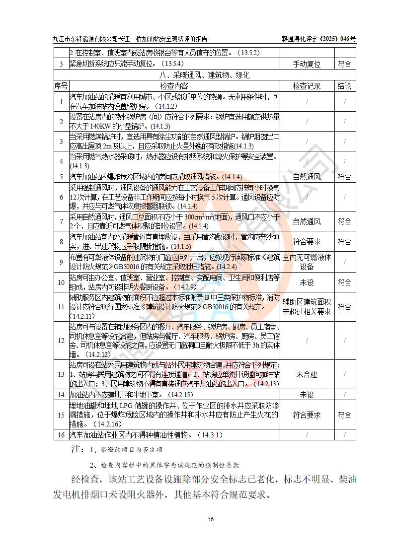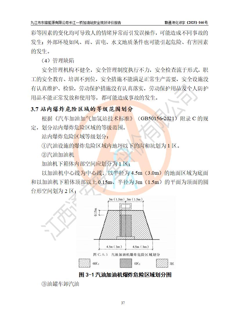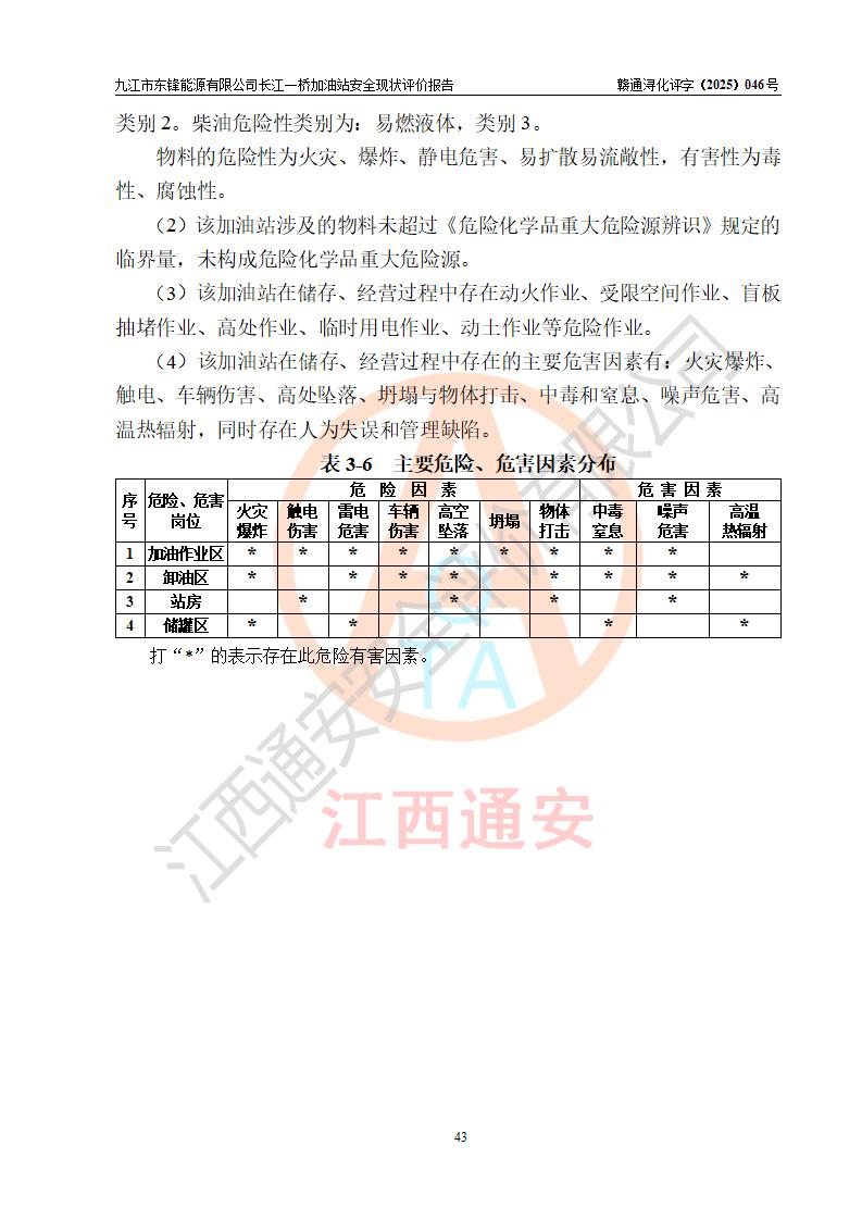 評價(jià)結(jié)論 | 九江市東鋒能源有限公司長江一橋加油站涉及的安全條件、安全經(jīng)營條件、安全生產(chǎn)管理符合《危險(xiǎn)化學(xué)品經(jīng)營許可證管理辦法》、《汽車加油加氣加氫站技術(shù)標(biāo)準(zhǔn)》等**有關(guān)法規(guī)、標(biāo)準(zhǔn)、規(guī)范要求,能滿足危險(xiǎn)化學(xué)品經(jīng)營安全條件。 | |||