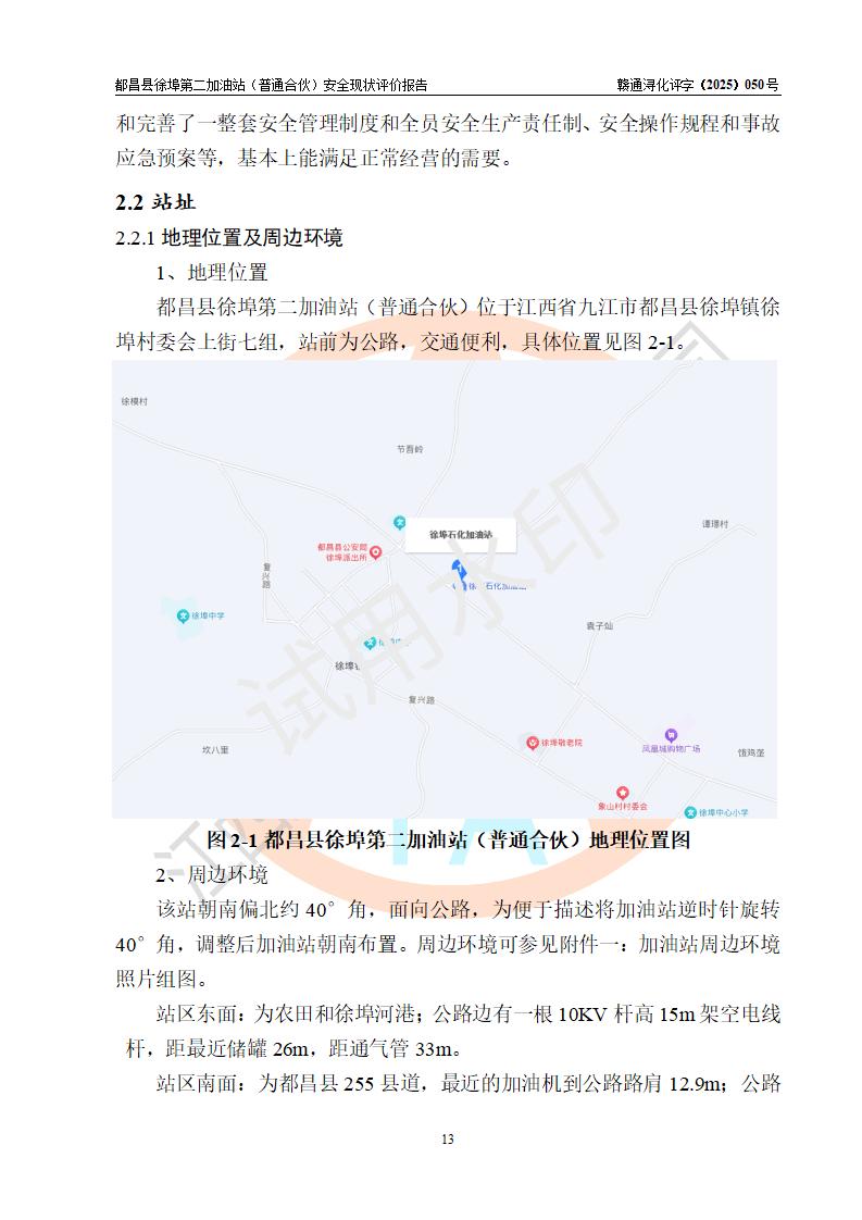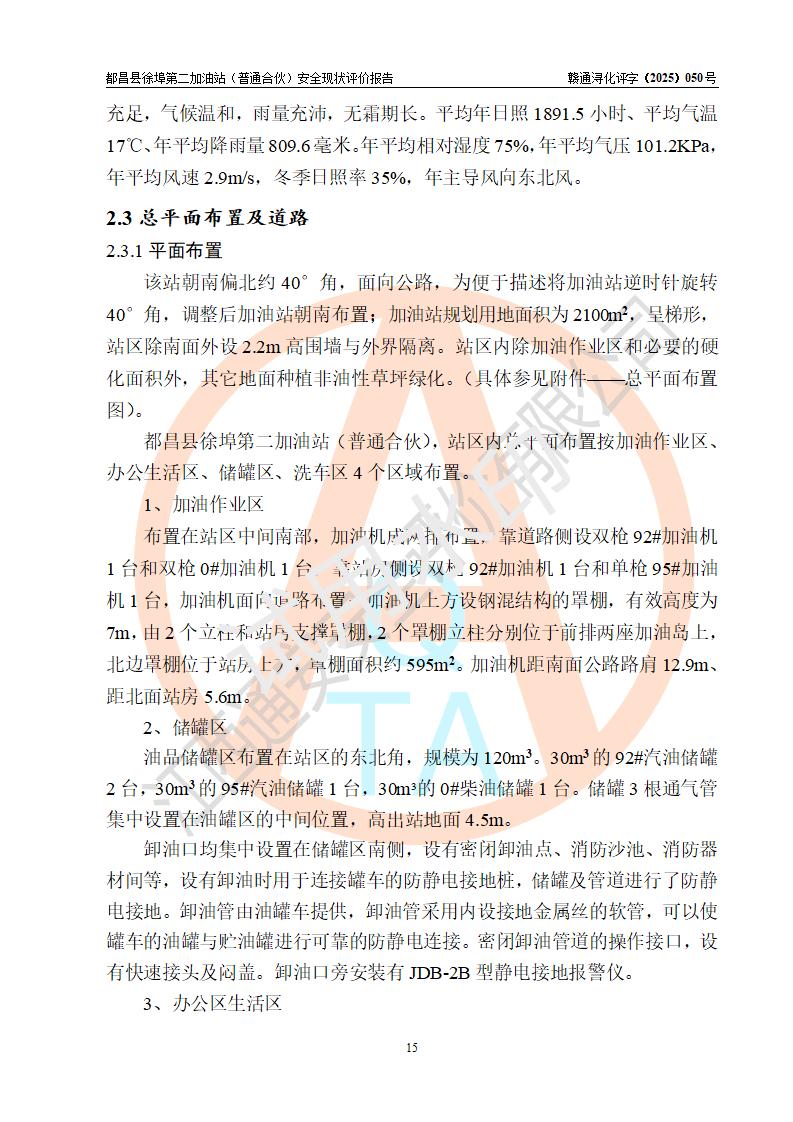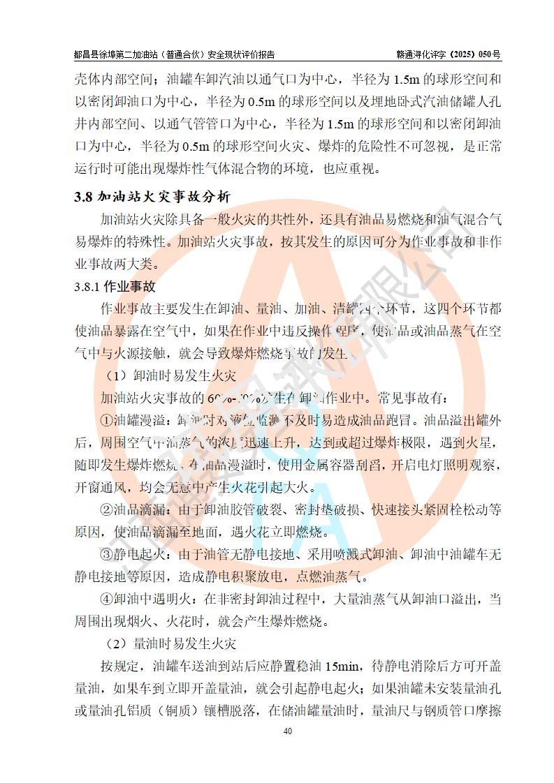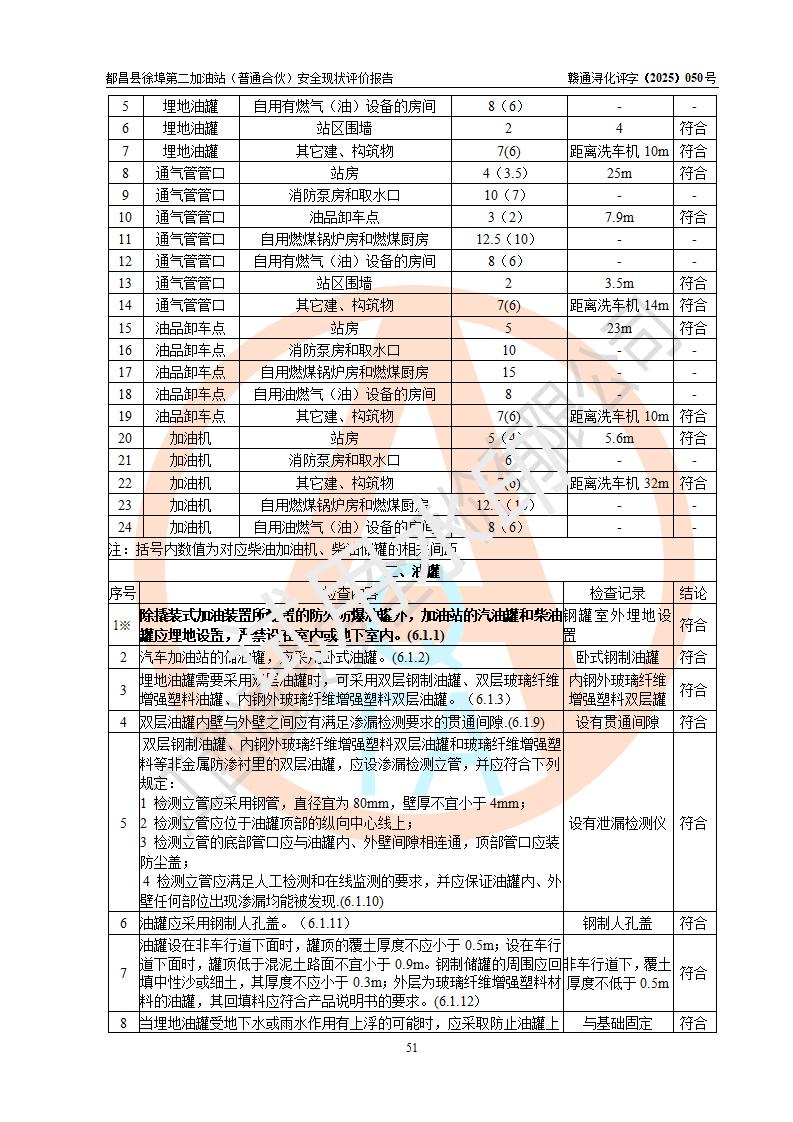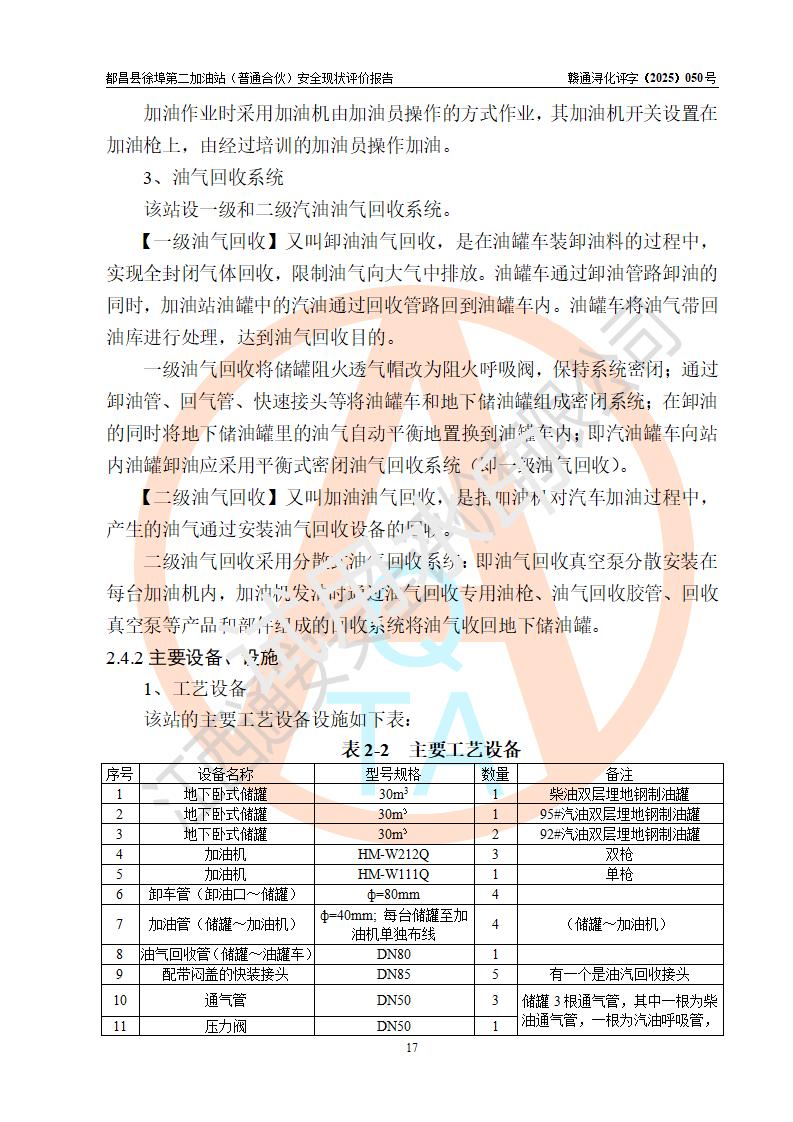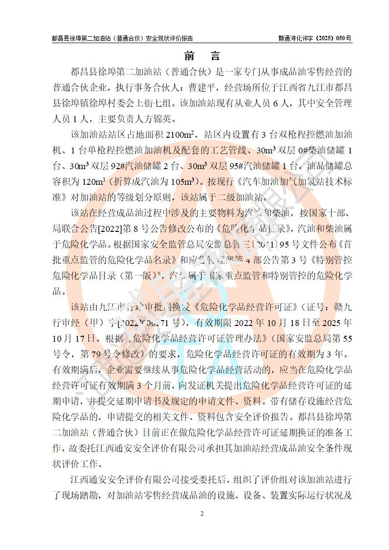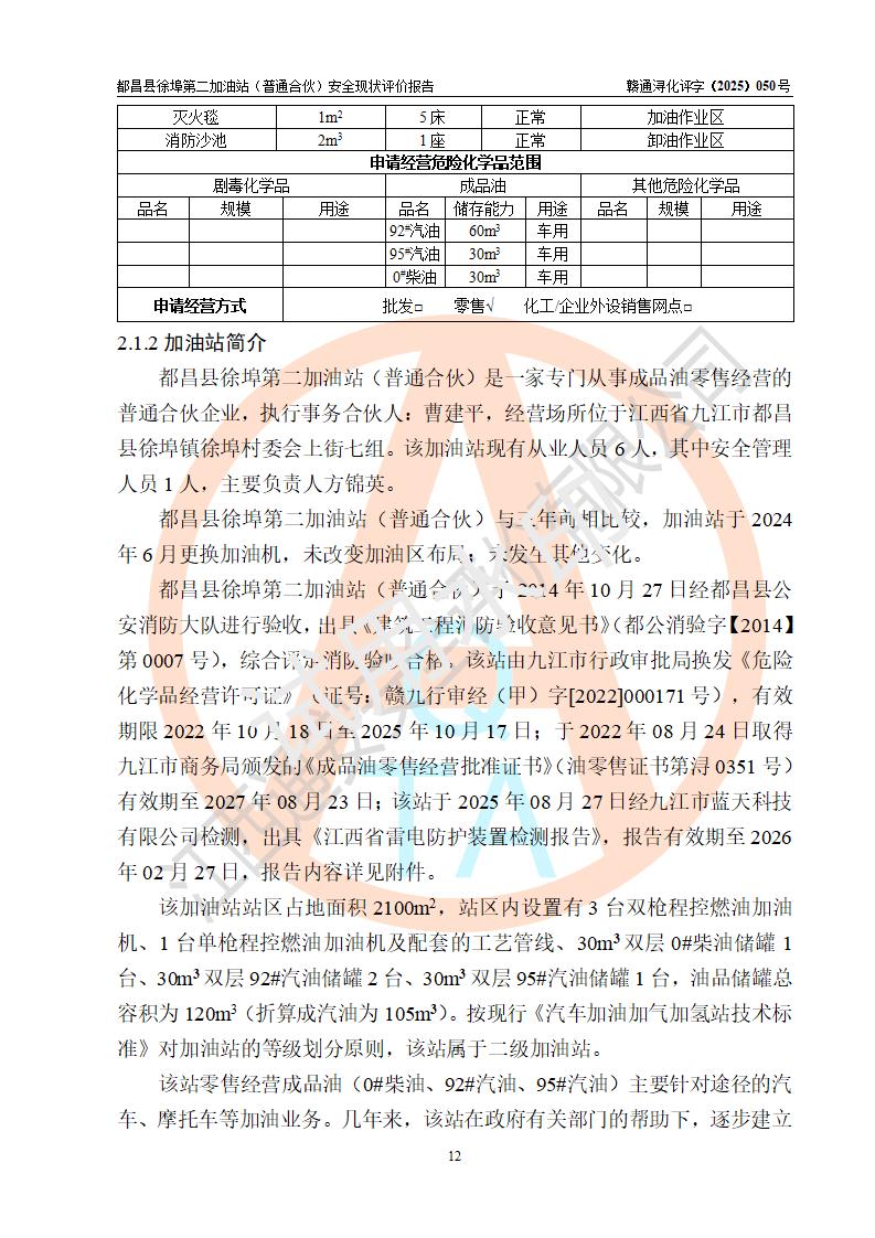 都昌縣徐埠第二加油站(普通合伙)是一家專門從事成品油零售經(jīng)營的普通合伙企業(yè),執(zhí)行事務(wù)合伙人:曹建平,經(jīng)營場所位于江西省九江市都昌縣徐埠鎮(zhèn)徐埠村委會上街七組。該加油站現(xiàn)有從業(yè)人員6人,其中安全管理人員1人,主要負(fù)責(zé)人方錦英。 該加油站站區(qū)占地面積2100m2,站區(qū)內(nèi)設(shè)置有3臺雙槍程控燃油加油機(jī)、1臺單槍程控燃油加油機(jī)及配套的工藝管線、30m3雙層0#柴油儲罐1臺、30m3雙層92#汽油儲罐2臺、30m3雙層95#汽油儲罐1臺,油品儲罐總?cè)莘e為120m3(折算成汽油為105m3)。按現(xiàn)行《汽車加油加氣加氫站技術(shù)標(biāo)準(zhǔn)》對加油站的等級劃分原則,該站屬于二級加油站。 該站由九江市行政審批局換發(fā)《危險化學(xué)品經(jīng)營許可證》(證號:贛九行審經(jīng)(甲)字[2022]000171號),**期限2022年10月18日至2025年10月17日。 |