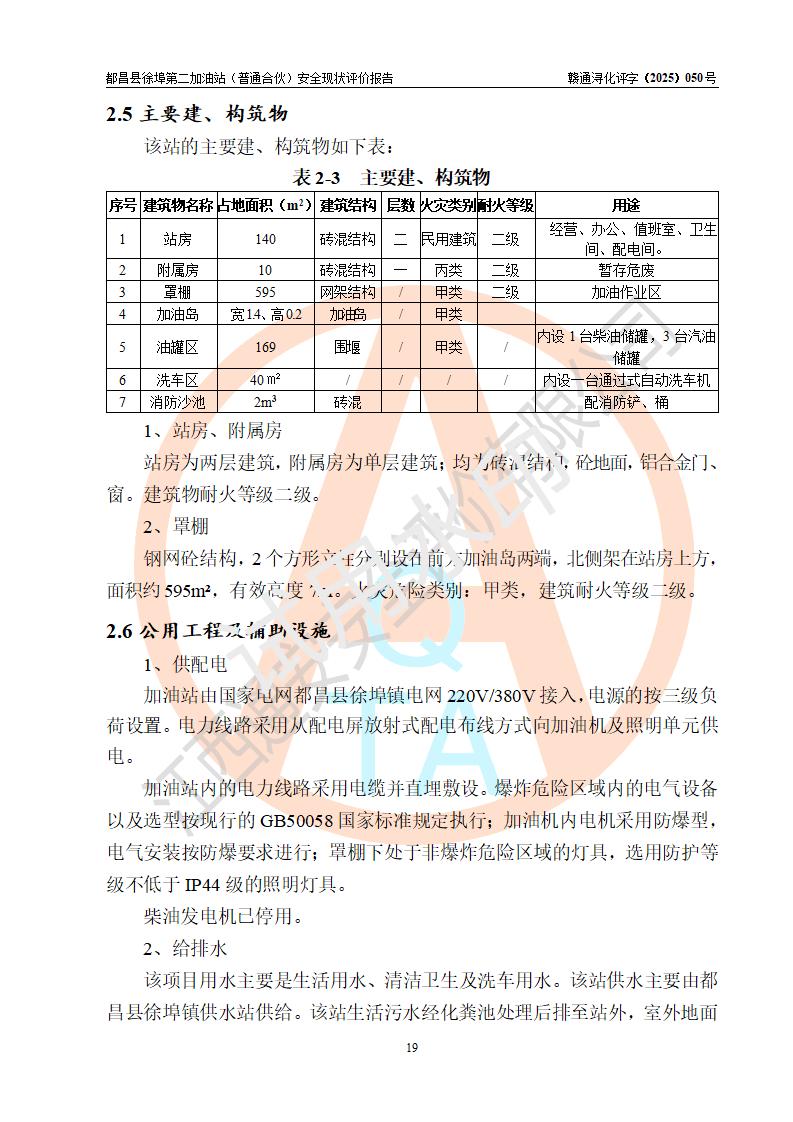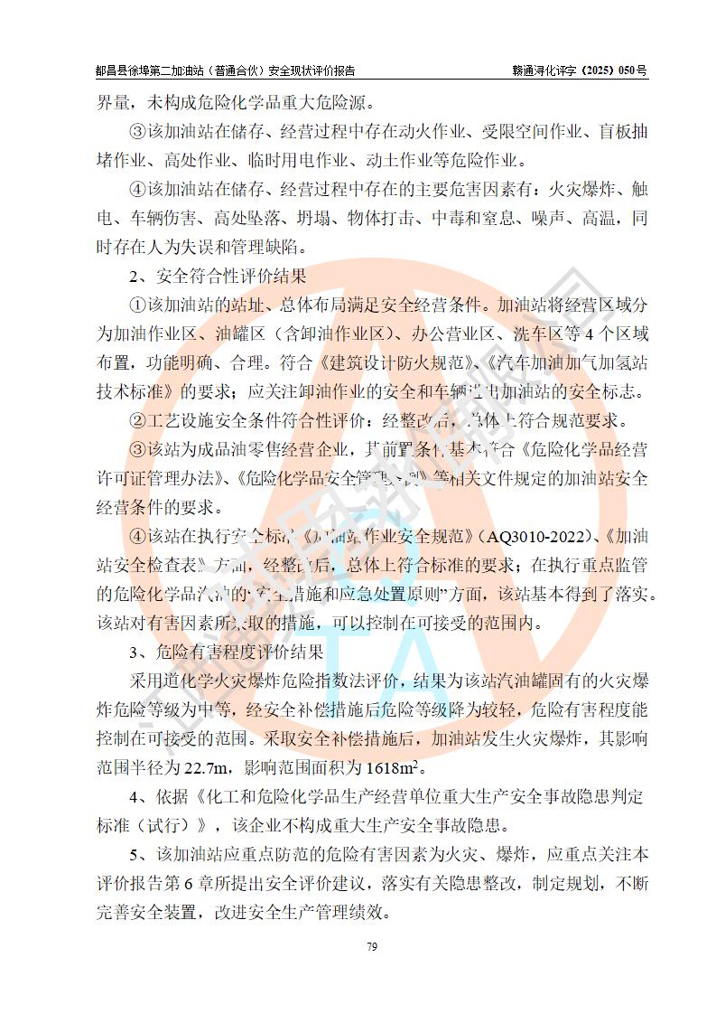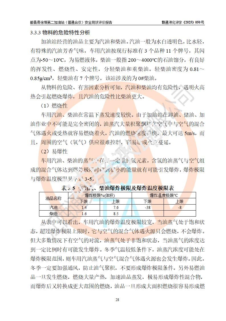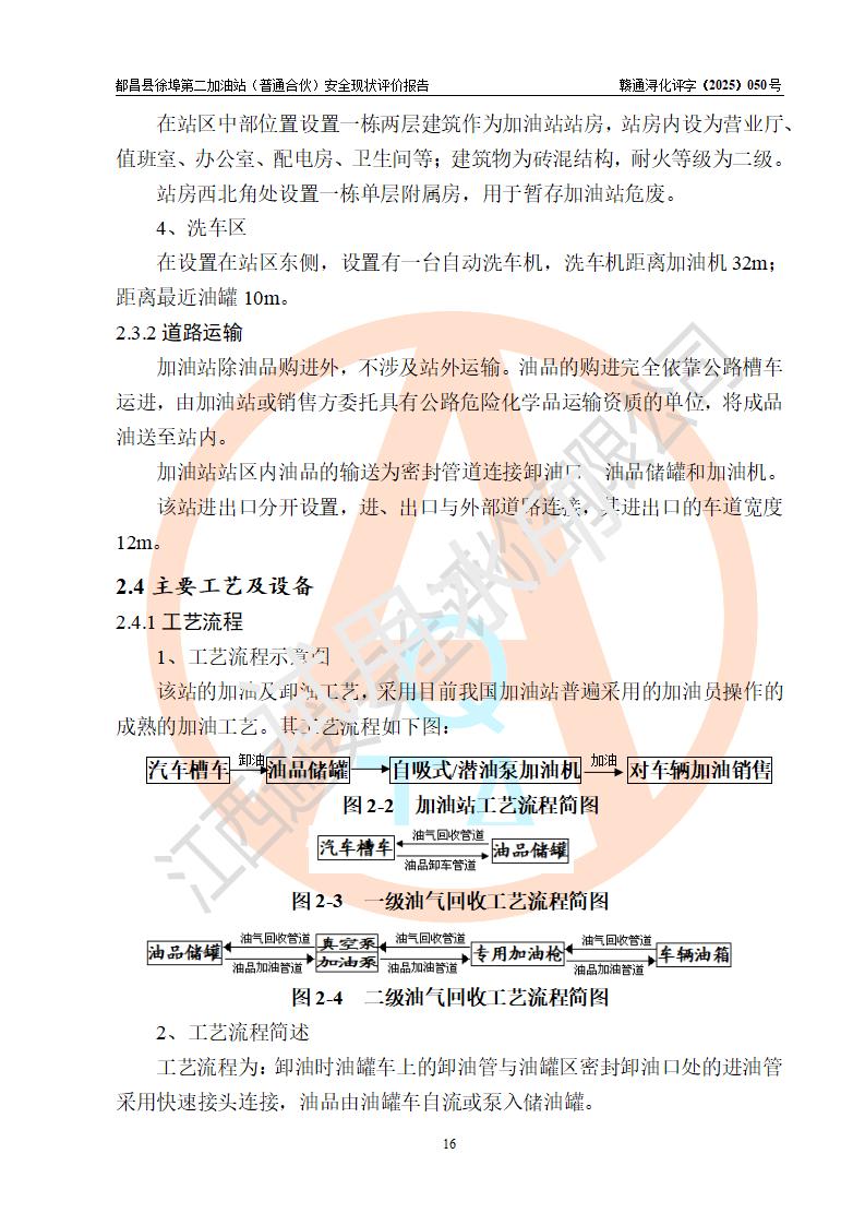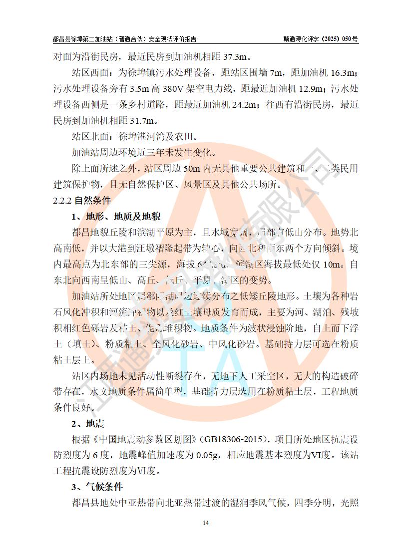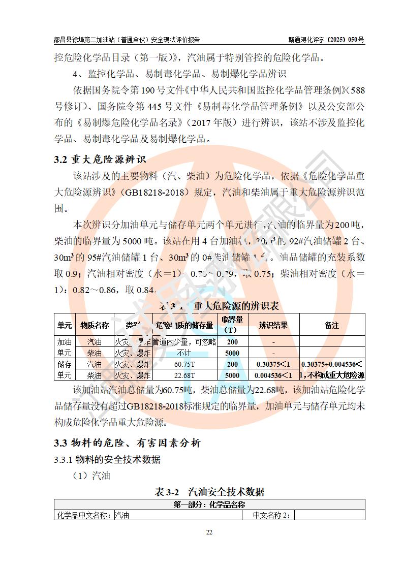 都昌縣徐埠第二加油站(普通合伙)是一家專門從事成品油零售經(jīng)營的普通合伙企業(yè),執(zhí)行事務(wù)合伙人:曹建平,經(jīng)營場所位于江西省九江市都昌縣徐埠鎮(zhèn)徐埠村委會上街七組。該加油站現(xiàn)有從業(yè)人員6人,其中安全管理人員1人,主要負(fù)責(zé)人方錦英。 該加油站站區(qū)占地面積2100m2,站區(qū)內(nèi)設(shè)置有3臺雙槍程控燃油加油機(jī)、1臺單槍程控燃油加油機(jī)及配套的工藝管線、30m3雙層0#柴油儲罐1臺、30m3雙層92#汽油儲罐2臺、30m3雙層95#汽油儲罐1臺,油品儲罐總?cè)莘e為120m3(折算成汽油為105m3)。按現(xiàn)行《汽車加油加氣加氫站技術(shù)標(biāo)準(zhǔn)》對加油站的等級劃分原則,該站屬于二級加油站。 該站由九江市行政審批局換發(fā)《危險化學(xué)品經(jīng)營許可證》(證號:贛九行審經(jīng)(甲)字[2022]000171號),**期限2022年10月18日至2025年10月17日。 |