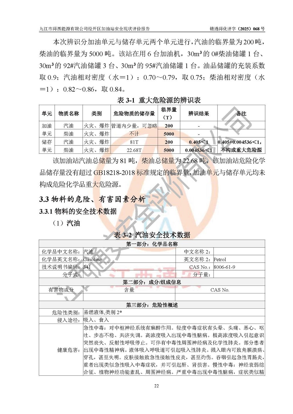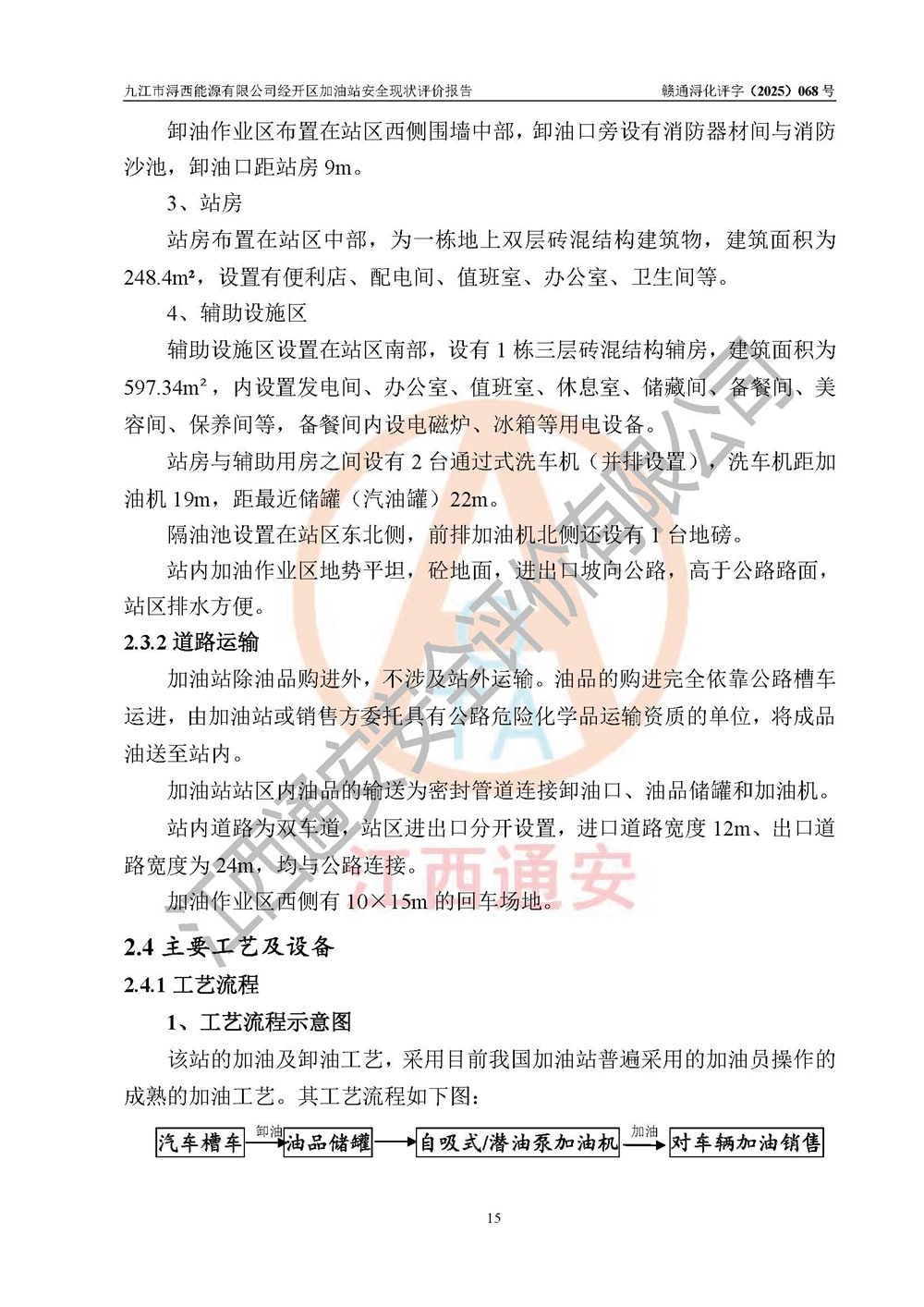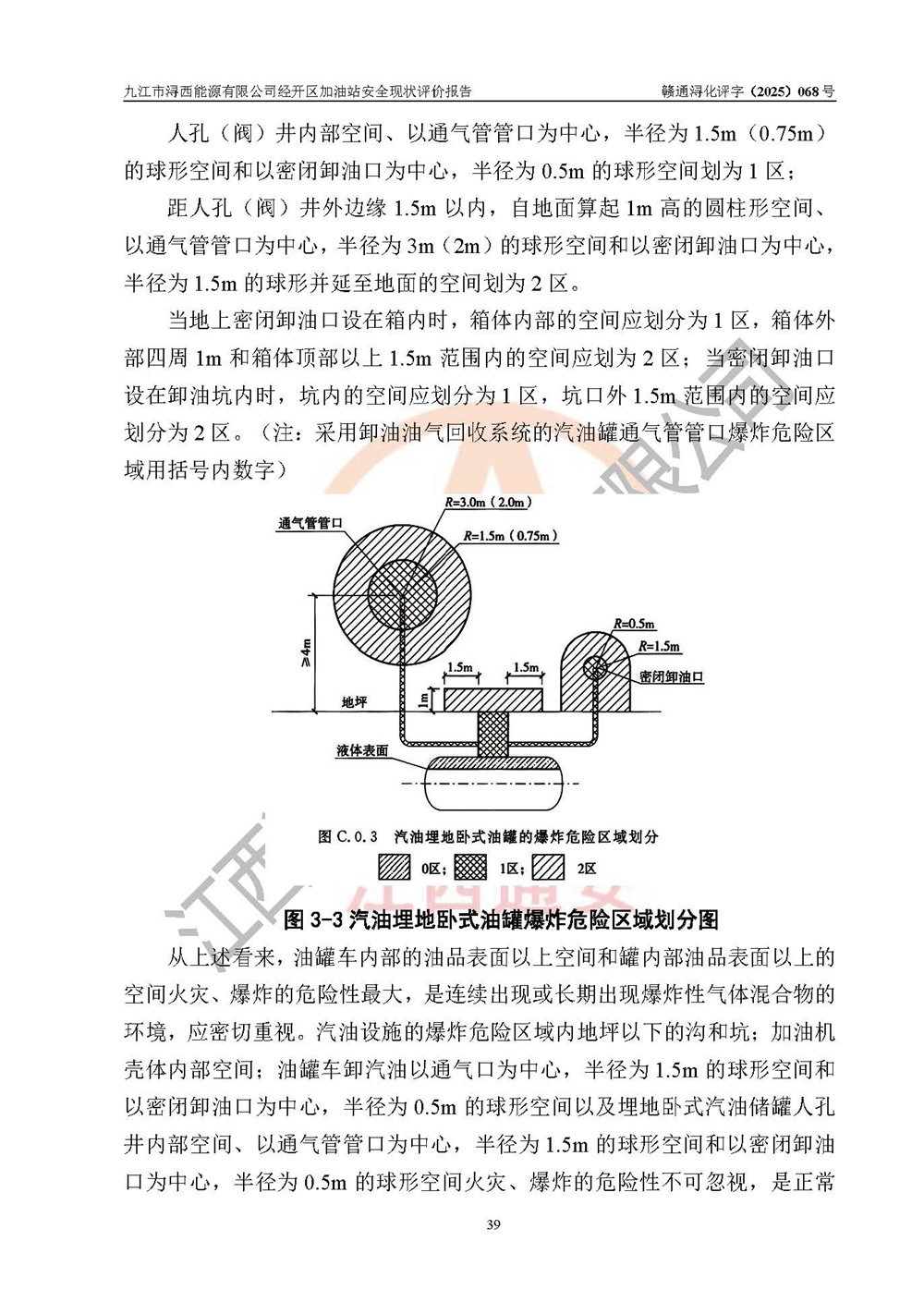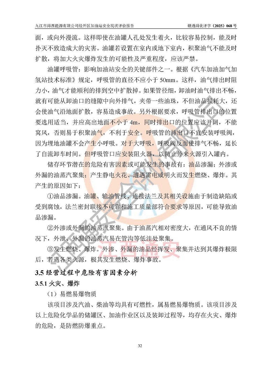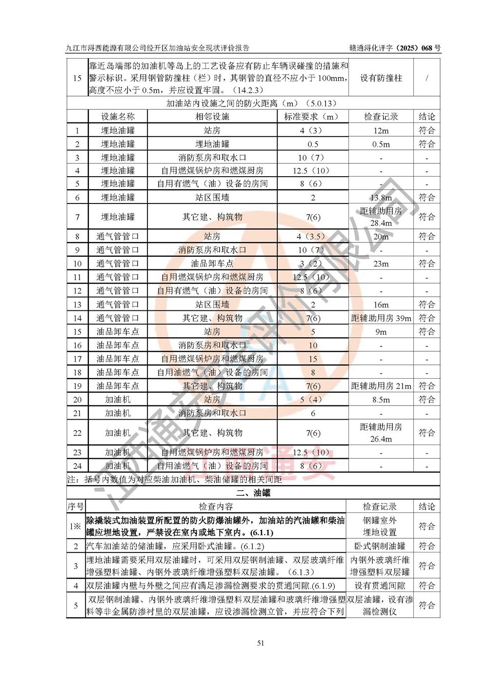 項目簡介 | 九江市潯西能源有限公司經(jīng)開區(qū)加油站是一家專門從事成品油零售經(jīng)營的有限責任公司分公司(自然人投資或控股),經(jīng)營場所位于江西省九江市經(jīng)開區(qū)潯陽西路341號?,F(xiàn)有從業(yè)人員15名,其中安全管理人員1人,加油站負責人黎暉。 該加油站占地面積約3961.66m2,站區(qū)內設置有6臺四槍程控燃油加油機及配套的工藝管線、設有SF雙層儲罐5臺,其中30m3的0#柴油儲罐1臺、30m3的92#汽油儲罐3臺,30m3的95#汽油儲罐1臺,油品儲罐總容積為150m3(折算成汽油為135m3),按現(xiàn)行《汽車加油加氣加氫站技術標準》對加油站的等級劃分原則,屬二級加油站。 該站由九江經(jīng)濟技術開發(fā)區(qū)行政審批局換發(fā)《危險化學品經(jīng)營許可證》(證號:贛九開?;?jīng)字[2022]K00013號),**期限2022年11月23日至2025年11月22日日。 | |||
