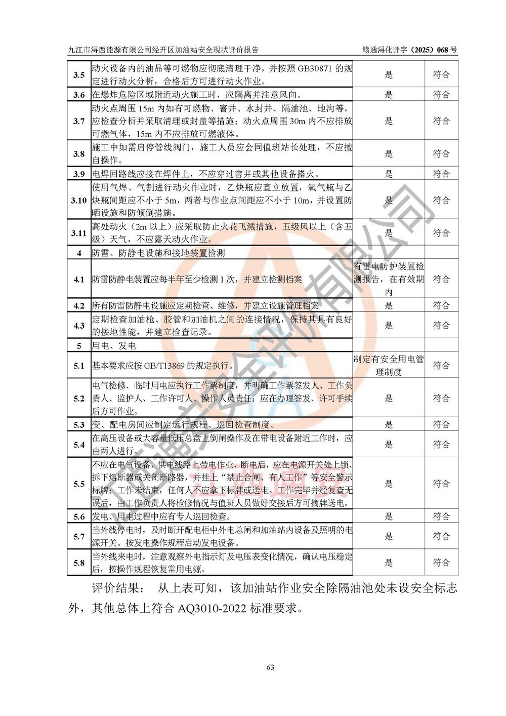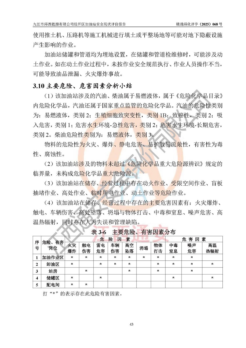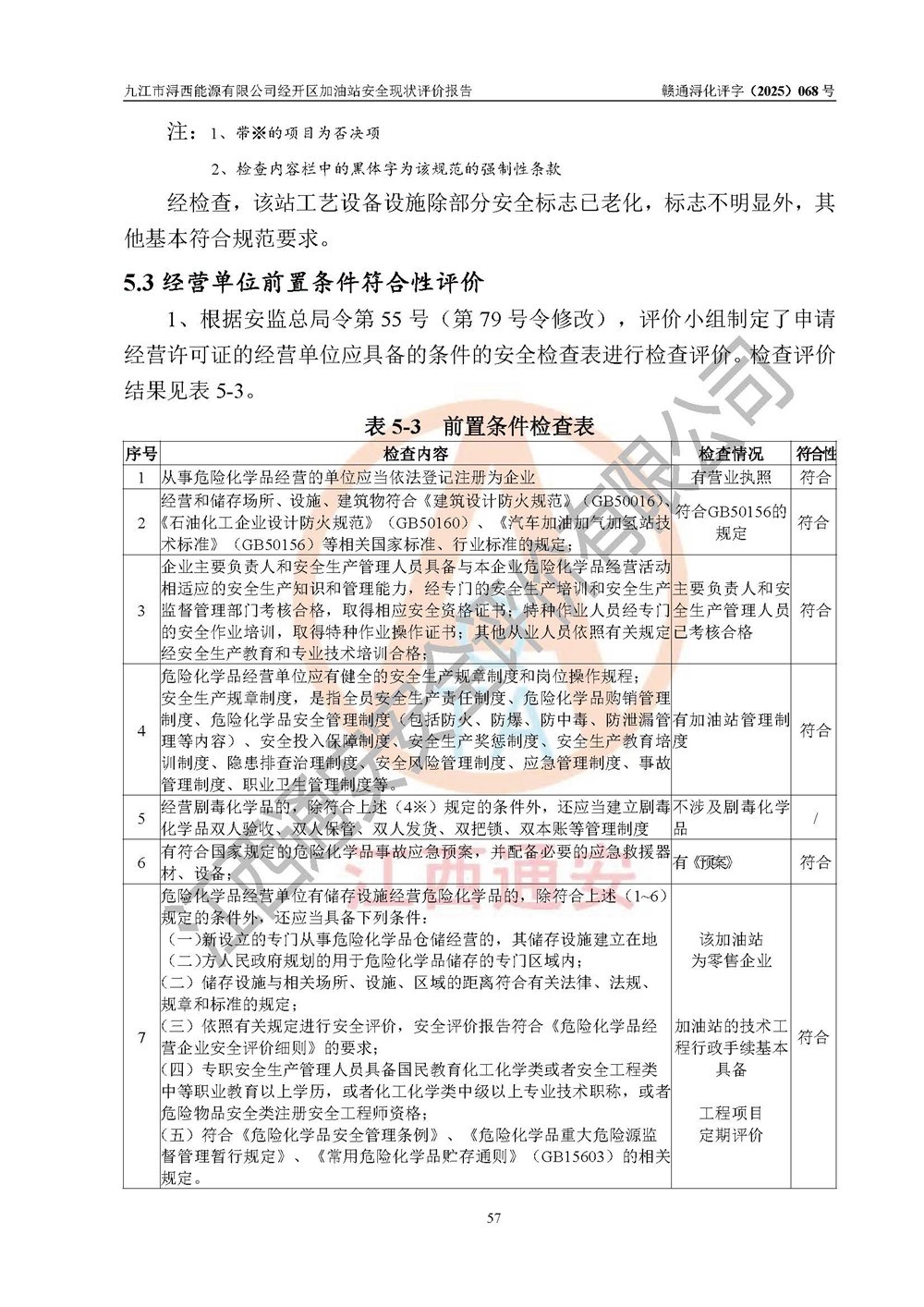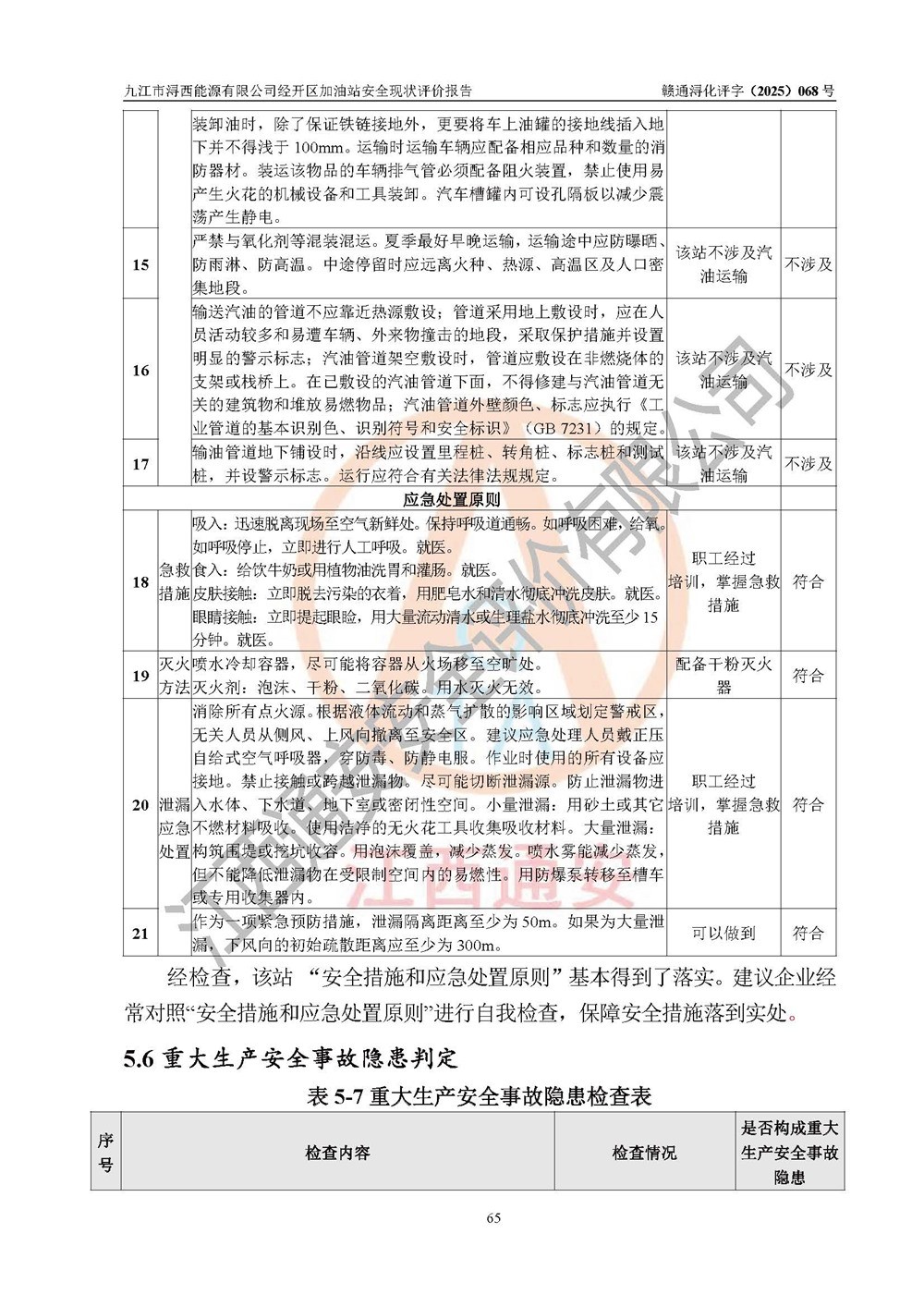 評價結論 | 九江市潯西能源有限公司經(jīng)開區(qū)加油站涉及的安全條件、安全經(jīng)營條件、安全生產(chǎn)管理符合《危險化學品經(jīng)營許可證管理辦法》、《汽車加油加氣加氫站技術標準》等**有關法規(guī)、標準、規(guī)范要求,能滿足危險化學品經(jīng)營安全條件。 | |||