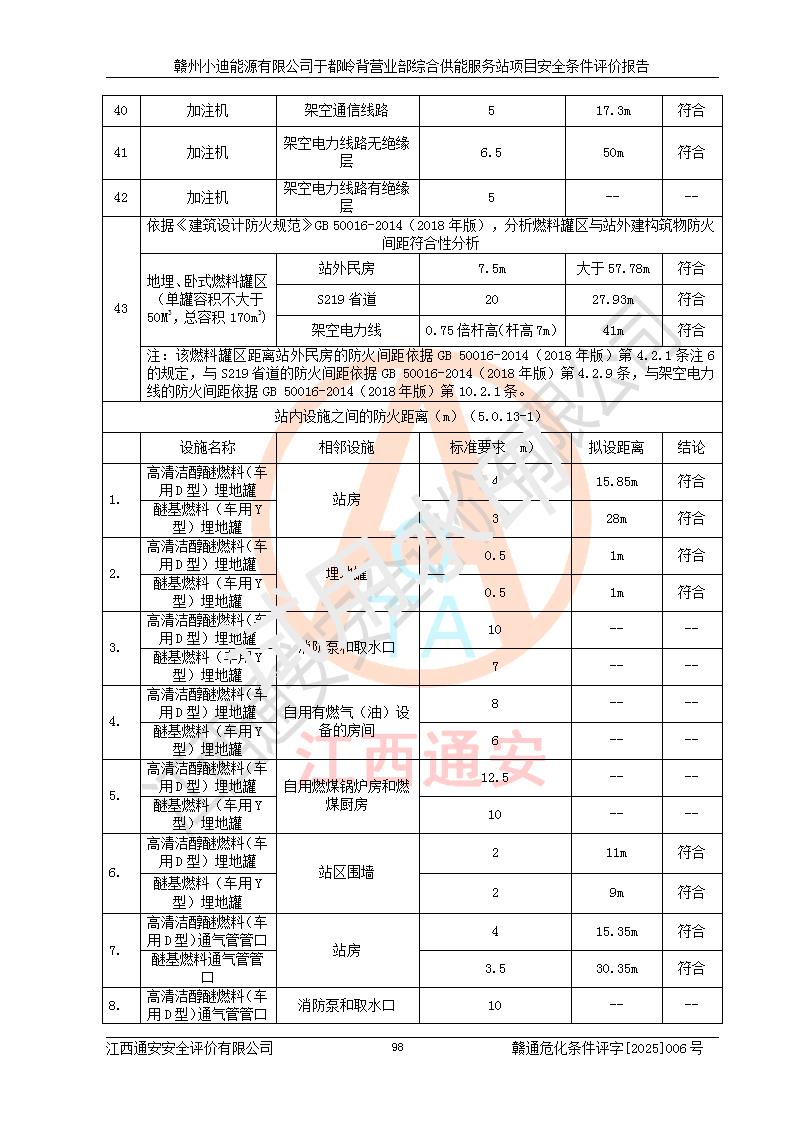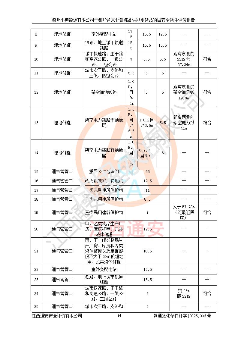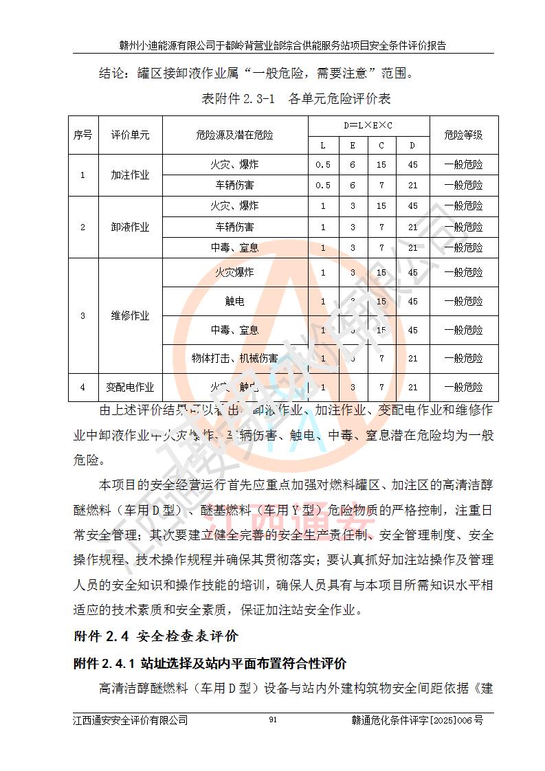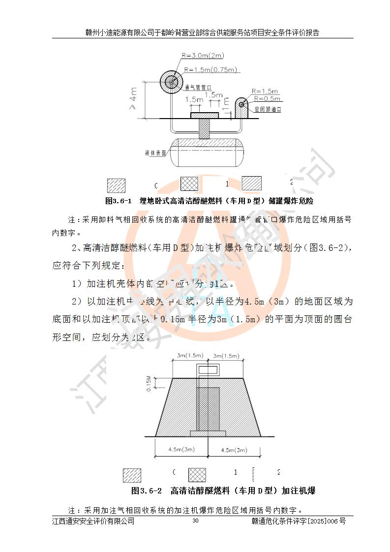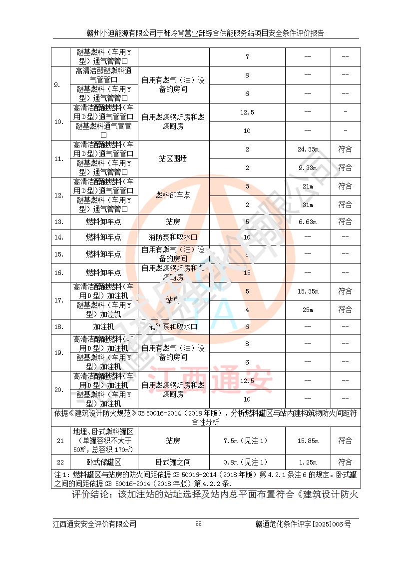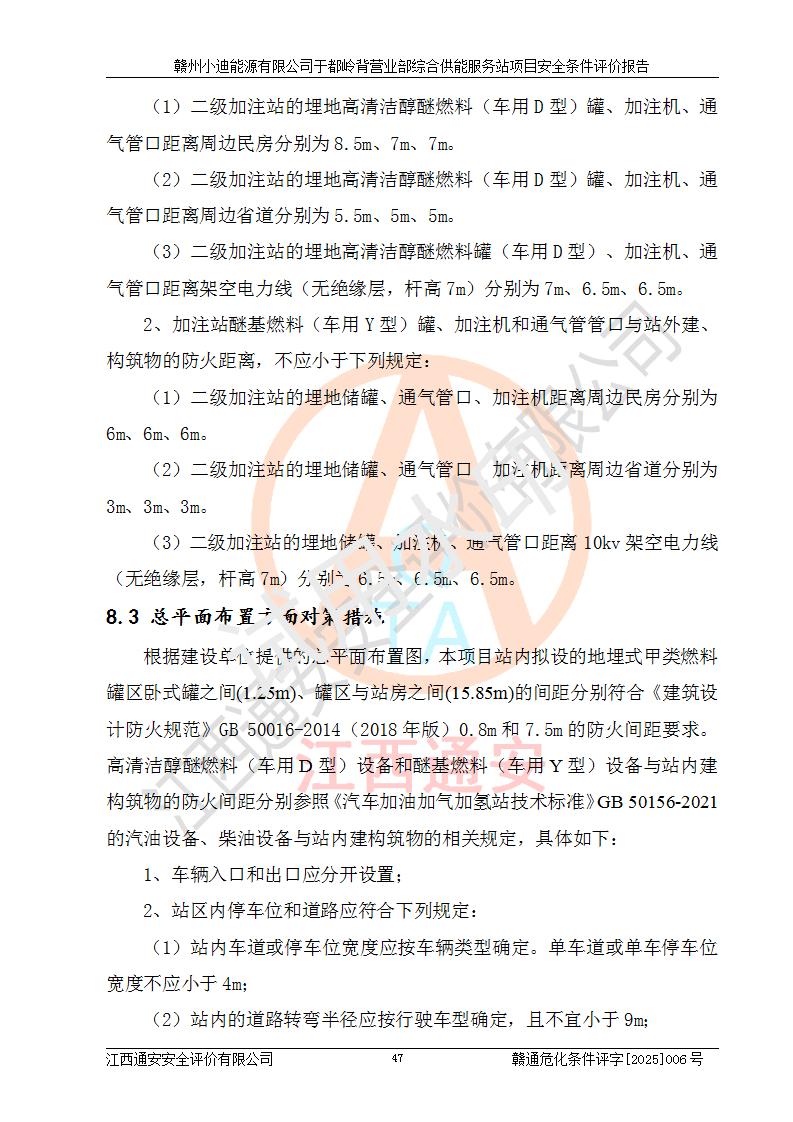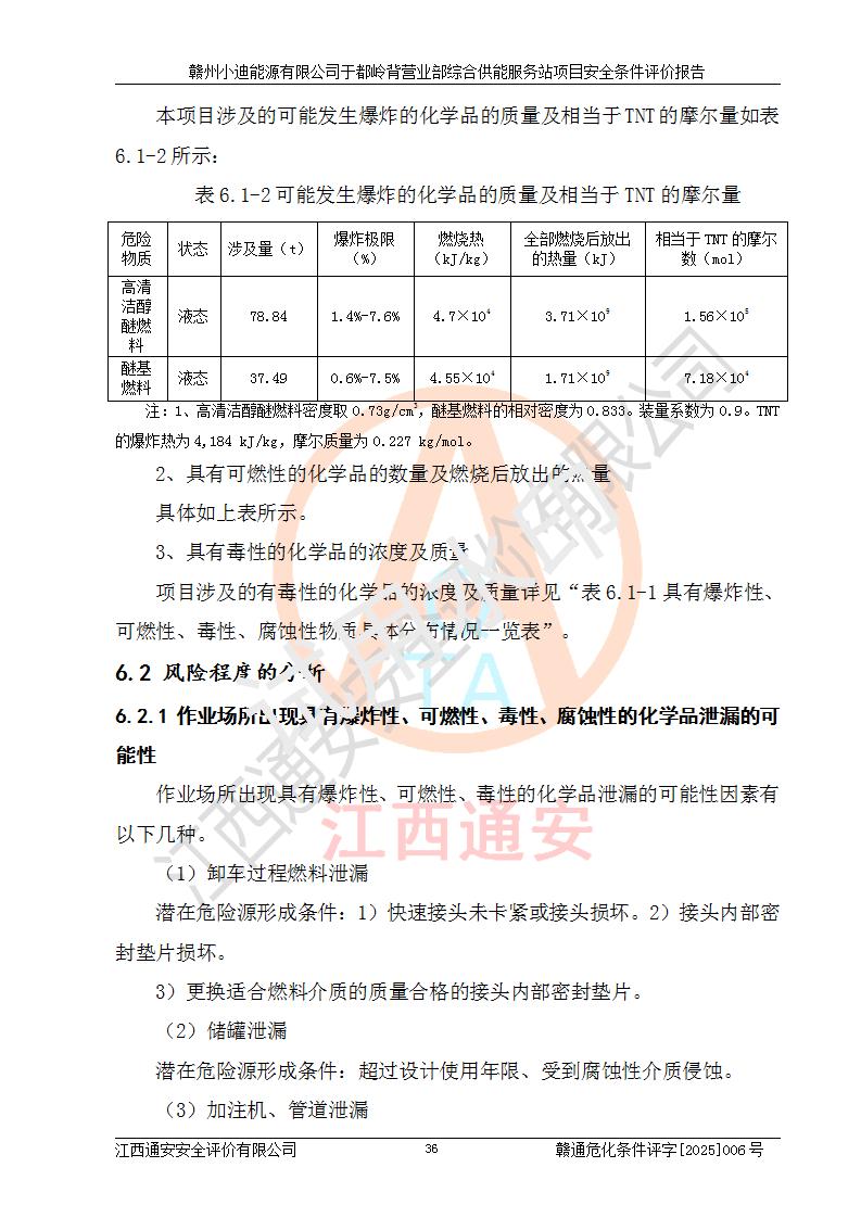 一、安全狀況綜合評(píng)述 通過(guò)對(duì)本項(xiàng)目的危險(xiǎn)、有害因素分析及定性、定量評(píng)價(jià),結(jié)果為: 1)本項(xiàng)目存在的危險(xiǎn)有害因素是火災(zāi)爆炸、**傷害、高處墜落、物體打擊、觸電、機(jī)械傷害、中毒窒息、坍塌等,主要危險(xiǎn)有害因素為火災(zāi)、爆炸等危險(xiǎn)因素。需重點(diǎn)防范的危險(xiǎn)有害因素為火災(zāi)、爆炸。本項(xiàng)目未構(gòu)成危險(xiǎn)化學(xué)品重大危險(xiǎn)源,也不存在劇毒、監(jiān)控、易制毒、易制爆化學(xué)品及高毒物品,高清潔醇醚燃料主要成分甲醇和石腦油為重點(diǎn)監(jiān)管危險(xiǎn)化學(xué)品,應(yīng)按照重點(diǎn)監(jiān)管危險(xiǎn)化學(xué)品相關(guān)規(guī)定管理。 2)預(yù)先危險(xiǎn)性分析表明該加注站儲(chǔ)存、經(jīng)營(yíng)過(guò)程中火災(zāi)、爆炸、觸電的危險(xiǎn)等級(jí)為Ⅲ級(jí),**傷害、高處墜落和中毒窒息等危險(xiǎn)等級(jí)為Ⅱ級(jí)。 3)從作業(yè)條件危險(xiǎn)性分析結(jié)果可以看出,在選定的評(píng)價(jià)單元中卸液作業(yè)、加注作業(yè)、變配電作業(yè)和維修作業(yè)中卸液作業(yè)中火災(zāi)爆炸、**傷害、觸電、中毒、窒息潛在危險(xiǎn)均為一般危險(xiǎn)。 4)從危險(xiǎn)度分析結(jié)果可以看出,燃料罐區(qū)屬中度危險(xiǎn)。 5)根據(jù)選址與總平面布置安全檢查表,該加注站符合《建筑設(shè)計(jì)防火規(guī)范》GB 50016-2014(2018年版)、《汽車加油加氣加氫站技術(shù)標(biāo)準(zhǔn)》GB50156-2021及《車用甲醇燃料加注站建設(shè)規(guī)范》(工信廳節(jié)〔2015〕129號(hào))等有關(guān)標(biāo)準(zhǔn)、規(guī)范的規(guī)定。該站與站外建筑物距離符合規(guī)范要求,站外50m內(nèi)無(wú)重要建筑物和明火設(shè)施。 6)根據(jù)立項(xiàng)批文及于都縣自然資源局出具的建設(shè)用地規(guī)劃許可證,該加注站符合有關(guān)部門的審批。 7)本項(xiàng)目采用成熟的工藝設(shè)備,項(xiàng)目在嚴(yán)格按照**相關(guān)法律、法規(guī)及技術(shù)標(biāo)準(zhǔn)制造、安裝、檢測(cè)檢驗(yàn)的情況下,其安全生產(chǎn)風(fēng)險(xiǎn)程度在可接受范圍。 8)本項(xiàng)目危害物質(zhì)為高清潔醇醚燃料(車用D型,甲類)和醚基燃料(車用Y型,丙類),應(yīng)重點(diǎn)注意火災(zāi)、爆炸危害,做好防火防靜電措施。**加注站罐區(qū)、加注區(qū)無(wú)明火產(chǎn)生;卸液口應(yīng)設(shè)置防靜電報(bào)警器,罐區(qū)法蘭應(yīng)跨接,防止靜電引起火災(zāi)爆炸事故。 四、評(píng)價(jià)結(jié)論 贛州小迪能源有限公司于都嶺背營(yíng)業(yè)部綜合供能服務(wù)站項(xiàng)目總平面布置符合相關(guān)規(guī)范的要求。在項(xiàng)目建設(shè)和運(yùn)行階段,總平面布置設(shè)計(jì)、施工圖設(shè)計(jì)和建設(shè)施工、安裝調(diào)試及生產(chǎn)運(yùn)行中,應(yīng)嚴(yán)格執(zhí)行**有關(guān)安全生產(chǎn)法律、法規(guī)和有關(guān)標(biāo)準(zhǔn)、規(guī)范,將本報(bào)告中提出的安全對(duì)策措施落實(shí)到位,真正做到安全設(shè)施與主體工程同時(shí)設(shè)計(jì)、同時(shí)施工、同時(shí)投入生產(chǎn)和使用,項(xiàng)目建成后危險(xiǎn)、有害因素可以得到**控制,安全風(fēng)險(xiǎn)在可接受范圍,擬建的贛州小迪能源有限公司于都嶺背營(yíng)業(yè)部綜合供能服務(wù)站項(xiàng)目符合法律法規(guī)、標(biāo)準(zhǔn)、規(guī)章和規(guī)范的要求。 |