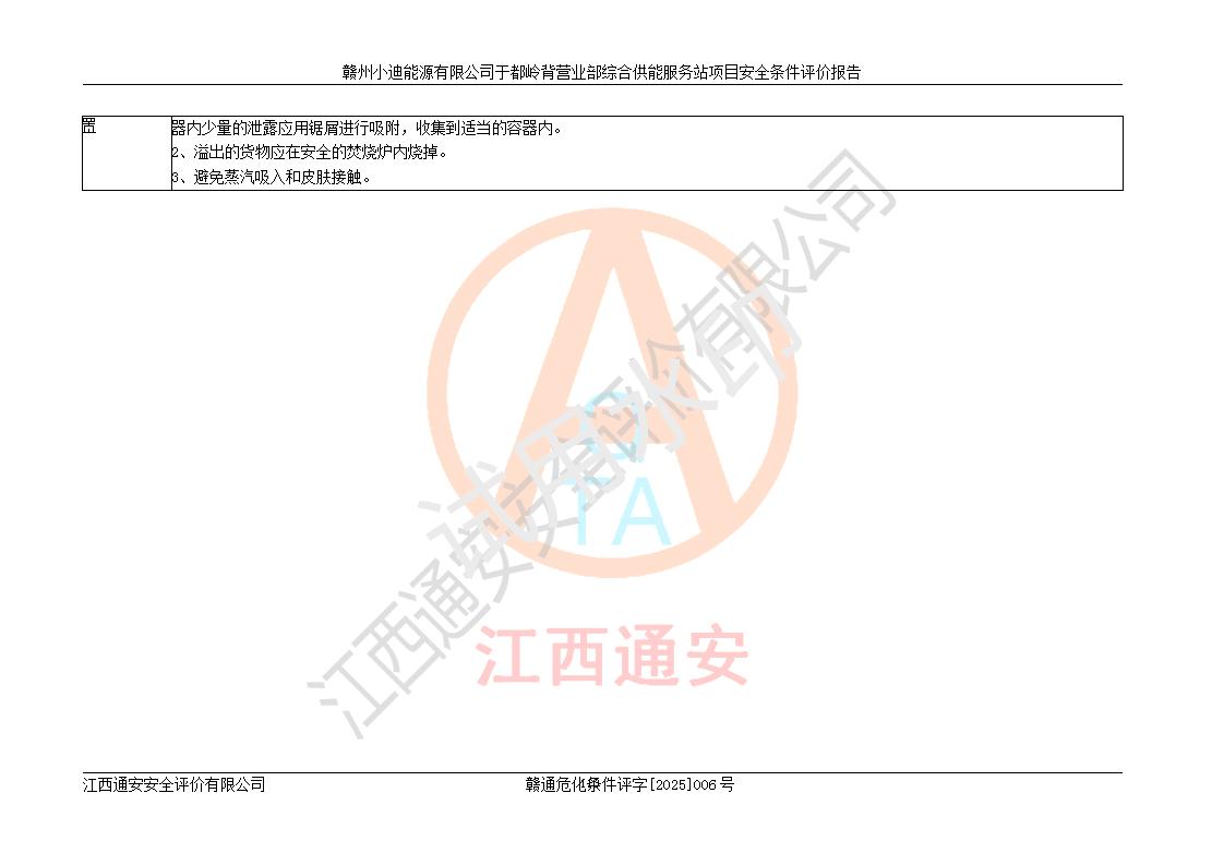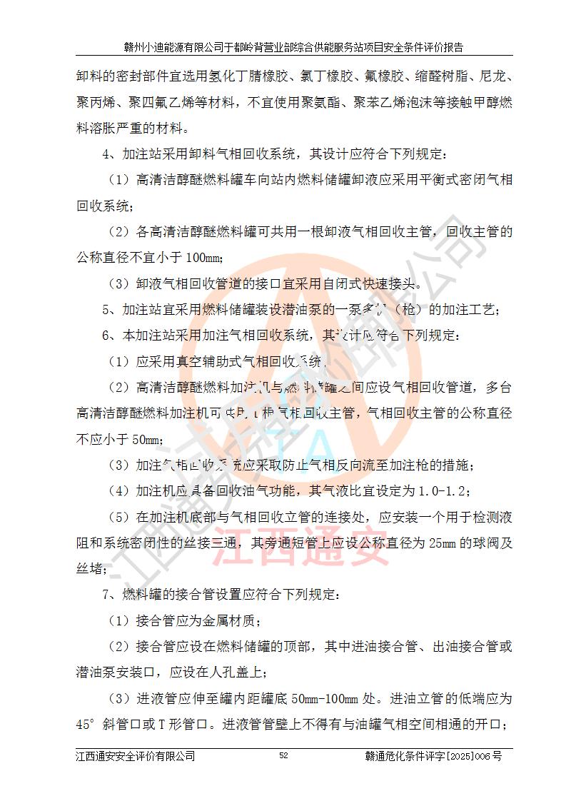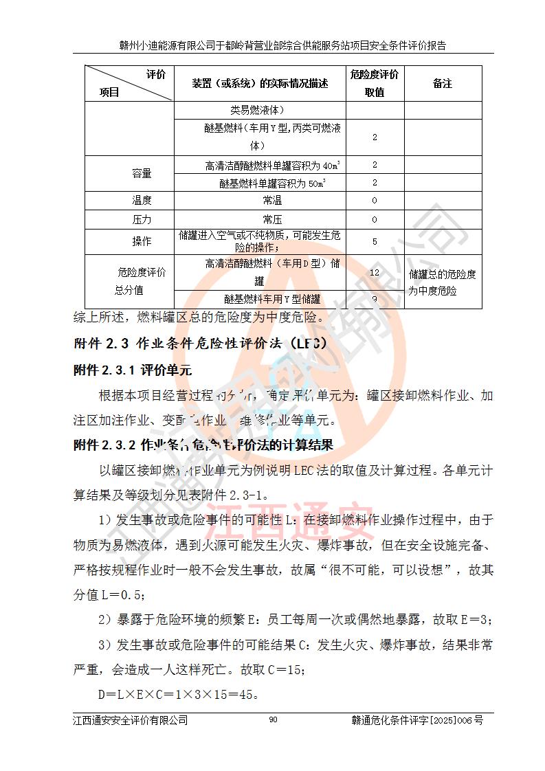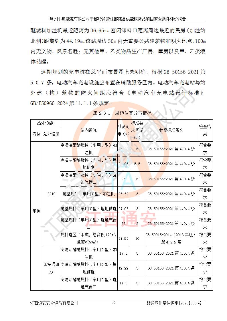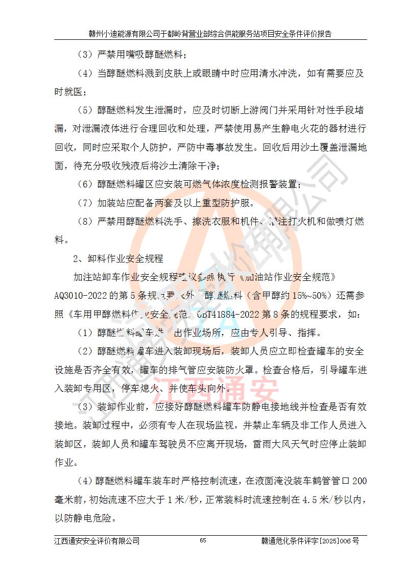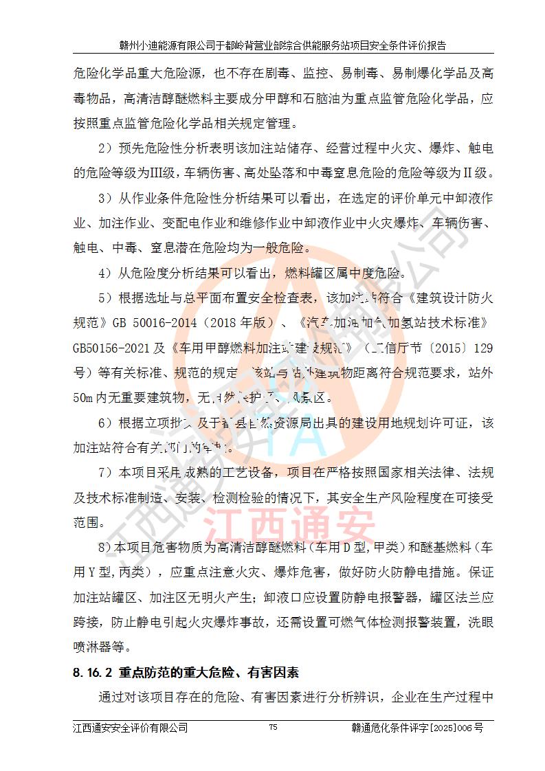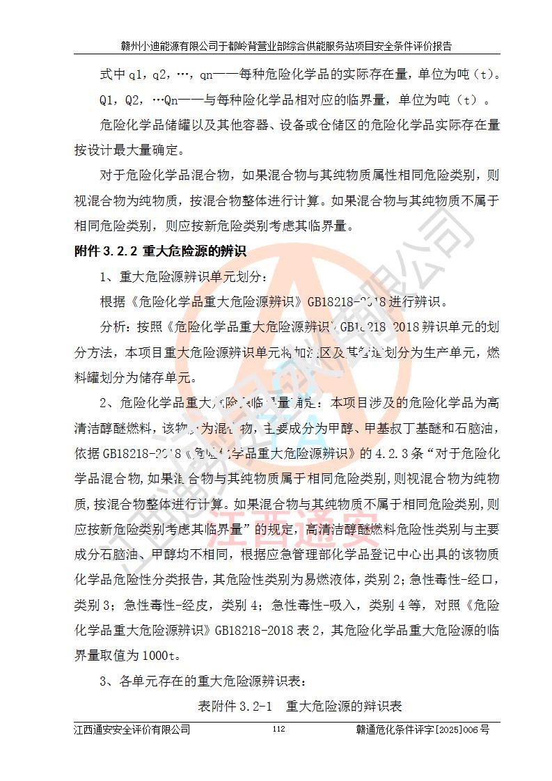 一、安全狀況綜合評(píng)述 通過(guò)對(duì)本項(xiàng)目的危險(xiǎn)、有害因素分析及定性、定量評(píng)價(jià),結(jié)果為: 1)本項(xiàng)目存在的危險(xiǎn)有害因素是火災(zāi)爆炸、**傷害、高處墜落、物體打擊、觸電、機(jī)械傷害、中毒窒息、坍塌等,主要危險(xiǎn)有害因素為火災(zāi)、爆炸等危險(xiǎn)因素。需重點(diǎn)防范的危險(xiǎn)有害因素為火災(zāi)、爆炸。本項(xiàng)目未構(gòu)成危險(xiǎn)化學(xué)品重大危險(xiǎn)源,也不存在劇毒、監(jiān)控、易制毒、易制爆化學(xué)品及高毒物品,高清潔醇醚燃料主要成分甲醇和石腦油為重點(diǎn)監(jiān)管危險(xiǎn)化學(xué)品,應(yīng)按照重點(diǎn)監(jiān)管危險(xiǎn)化學(xué)品相關(guān)規(guī)定管理。 2)預(yù)先危險(xiǎn)性分析表明該加注站儲(chǔ)存、經(jīng)營(yíng)過(guò)程中火災(zāi)、爆炸、觸電的危險(xiǎn)等級(jí)為Ⅲ級(jí),**傷害、高處墜落和中毒窒息等危險(xiǎn)等級(jí)為Ⅱ級(jí)。 3)從作業(yè)條件危險(xiǎn)性分析結(jié)果可以看出,在選定的評(píng)價(jià)單元中卸液作業(yè)、加注作業(yè)、變配電作業(yè)和維修作業(yè)中卸液作業(yè)中火災(zāi)爆炸、**傷害、觸電、中毒、窒息潛在危險(xiǎn)均為一般危險(xiǎn)。 4)從危險(xiǎn)度分析結(jié)果可以看出,燃料罐區(qū)屬中度危險(xiǎn)。 5)根據(jù)選址與總平面布置安全檢查表,該加注站符合《建筑設(shè)計(jì)防火規(guī)范》GB 50016-2014(2018年版)、《汽車加油加氣加氫站技術(shù)標(biāo)準(zhǔn)》GB50156-2021及《車用甲醇燃料加注站建設(shè)規(guī)范》(工信廳節(jié)〔2015〕129號(hào))等有關(guān)標(biāo)準(zhǔn)、規(guī)范的規(guī)定。該站與站外建筑物距離符合規(guī)范要求,站外50m內(nèi)無(wú)重要建筑物和明火設(shè)施。 6)根據(jù)立項(xiàng)批文及于都縣自然資源局出具的建設(shè)用地規(guī)劃許可證,該加注站符合有關(guān)部門的審批。 7)本項(xiàng)目采用成熟的工藝設(shè)備,項(xiàng)目在嚴(yán)格按照**相關(guān)法律、法規(guī)及技術(shù)標(biāo)準(zhǔn)制造、安裝、檢測(cè)檢驗(yàn)的情況下,其安全生產(chǎn)風(fēng)險(xiǎn)程度在可接受范圍。 8)本項(xiàng)目危害物質(zhì)為高清潔醇醚燃料(車用D型,甲類)和醚基燃料(車用Y型,丙類),應(yīng)重點(diǎn)注意火災(zāi)、爆炸危害,做好防火防靜電措施。**加注站罐區(qū)、加注區(qū)無(wú)明火產(chǎn)生;卸液口應(yīng)設(shè)置防靜電報(bào)警器,罐區(qū)法蘭應(yīng)跨接,防止靜電引起火災(zāi)爆炸事故。 四、評(píng)價(jià)結(jié)論 贛州小迪能源有限公司于都嶺背營(yíng)業(yè)部綜合供能服務(wù)站項(xiàng)目總平面布置符合相關(guān)規(guī)范的要求。在項(xiàng)目建設(shè)和運(yùn)行階段,總平面布置設(shè)計(jì)、施工圖設(shè)計(jì)和建設(shè)施工、安裝調(diào)試及生產(chǎn)運(yùn)行中,應(yīng)嚴(yán)格執(zhí)行**有關(guān)安全生產(chǎn)法律、法規(guī)和有關(guān)標(biāo)準(zhǔn)、規(guī)范,將本報(bào)告中提出的安全對(duì)策措施落實(shí)到位,真正做到安全設(shè)施與主體工程同時(shí)設(shè)計(jì)、同時(shí)施工、同時(shí)投入生產(chǎn)和使用,項(xiàng)目建成后危險(xiǎn)、有害因素可以得到**控制,安全風(fēng)險(xiǎn)在可接受范圍,擬建的贛州小迪能源有限公司于都嶺背營(yíng)業(yè)部綜合供能服務(wù)站項(xiàng)目符合法律法規(guī)、標(biāo)準(zhǔn)、規(guī)章和規(guī)范的要求。 |