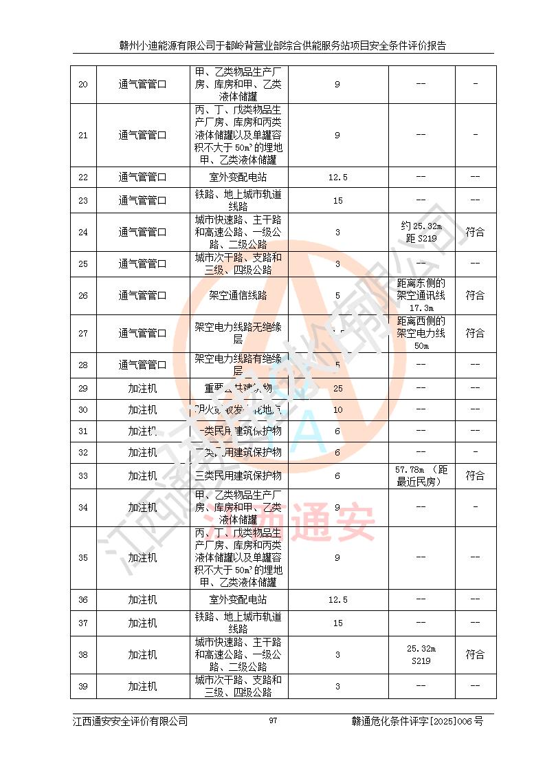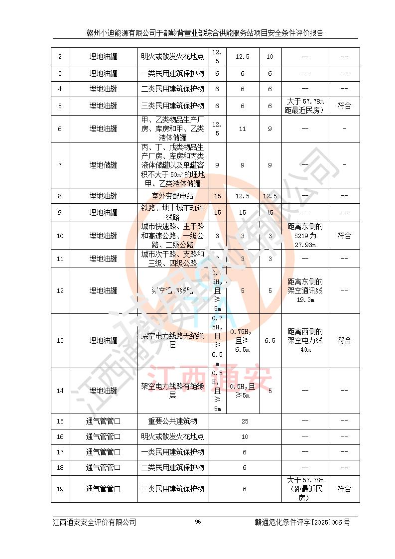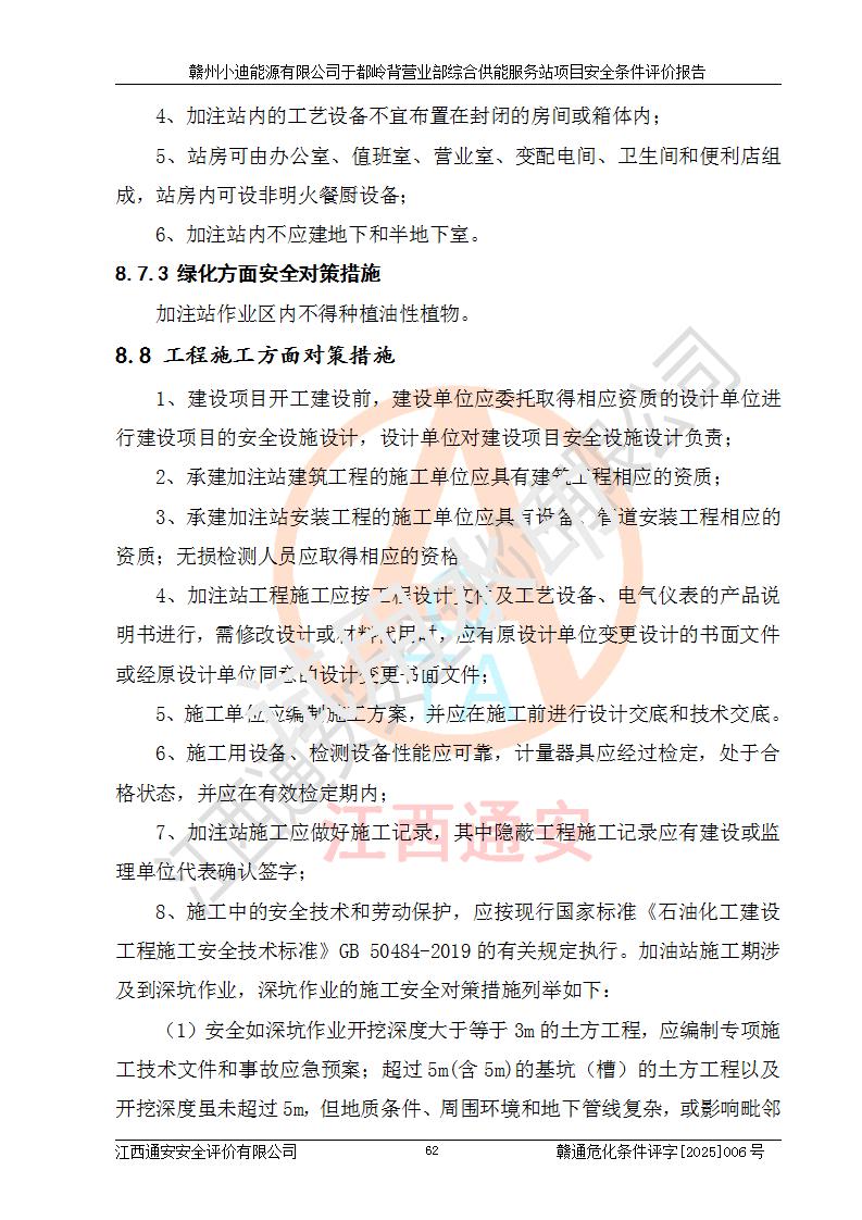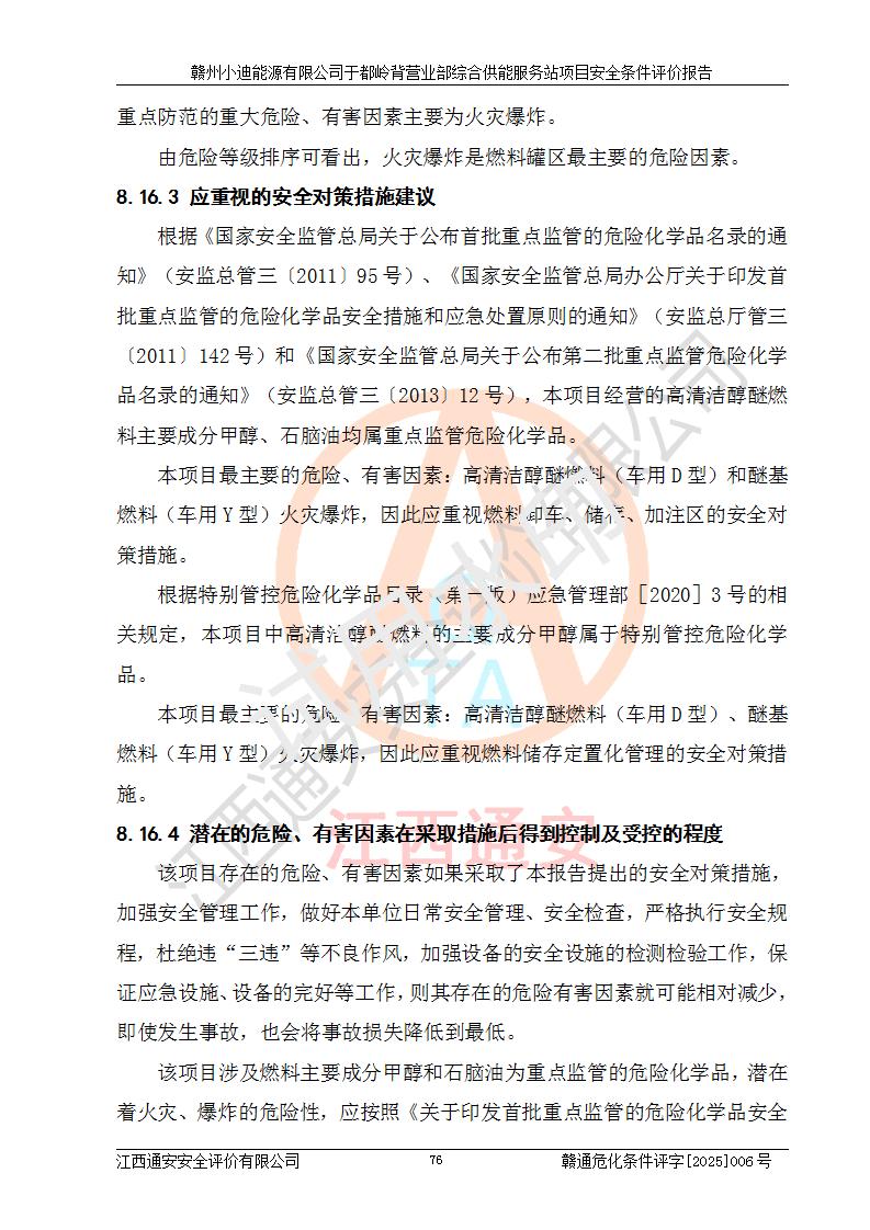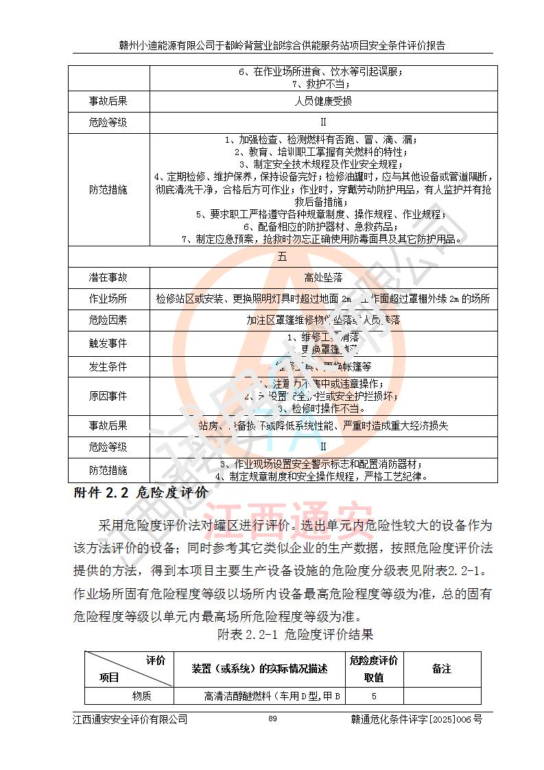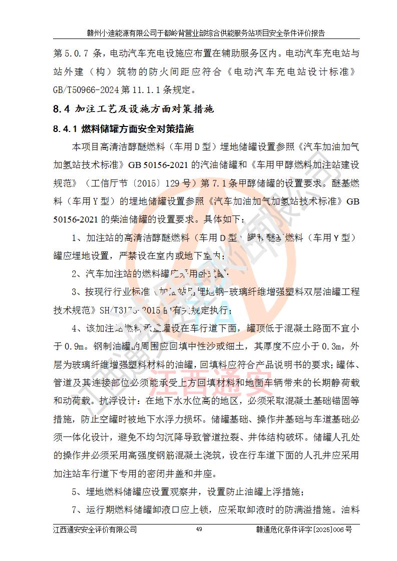一、安全狀況綜合評(píng)述 通過(guò)對(duì)本項(xiàng)目的危險(xiǎn)、有害因素分析及定性、定量評(píng)價(jià),結(jié)果為: 1)本項(xiàng)目存在的危險(xiǎn)有害因素是火災(zāi)爆炸、**傷害、高處墜落、物體打擊、觸電、機(jī)械傷害、中毒窒息、坍塌等,主要危險(xiǎn)有害因素為火災(zāi)、爆炸等危險(xiǎn)因素。需重點(diǎn)防范的危險(xiǎn)有害因素為火災(zāi)、爆炸。本項(xiàng)目未構(gòu)成危險(xiǎn)化學(xué)品重大危險(xiǎn)源,也不存在劇毒、監(jiān)控、易制毒、易制爆化學(xué)品及高毒物品,高清潔醇醚燃料主要成分甲醇和石腦油為重點(diǎn)監(jiān)管危險(xiǎn)化學(xué)品,應(yīng)按照重點(diǎn)監(jiān)管危險(xiǎn)化學(xué)品相關(guān)規(guī)定管理。 2)預(yù)先危險(xiǎn)性分析表明該加注站儲(chǔ)存、經(jīng)營(yíng)過(guò)程中火災(zāi)、爆炸、觸電的危險(xiǎn)等級(jí)為Ⅲ級(jí),**傷害、高處墜落和中毒窒息等危險(xiǎn)等級(jí)為Ⅱ級(jí)。 3)從作業(yè)條件危險(xiǎn)性分析結(jié)果可以看出,在選定的評(píng)價(jià)單元中卸液作業(yè)、加注作業(yè)、變配電作業(yè)和維修作業(yè)中卸液作業(yè)中火災(zāi)爆炸、**傷害、觸電、中毒、窒息潛在危險(xiǎn)均為一般危險(xiǎn)。 4)從危險(xiǎn)度分析結(jié)果可以看出,燃料罐區(qū)屬中度危險(xiǎn)。 5)根據(jù)選址與總平面布置安全檢查表,該加注站符合《建筑設(shè)計(jì)防火規(guī)范》GB 50016-2014(2018年版)、《汽車加油加氣加氫站技術(shù)標(biāo)準(zhǔn)》GB50156-2021及《車用甲醇燃料加注站建設(shè)規(guī)范》(工信廳節(jié)〔2015〕129號(hào))等有關(guān)標(biāo)準(zhǔn)、規(guī)范的規(guī)定。該站與站外建筑物距離符合規(guī)范要求,站外50m內(nèi)無(wú)重要建筑物和明火設(shè)施。 6)根據(jù)立項(xiàng)批文及于都縣自然資源局出具的建設(shè)用地規(guī)劃許可證,該加注站符合有關(guān)部門的審批。 7)本項(xiàng)目采用成熟的工藝設(shè)備,項(xiàng)目在嚴(yán)格按照**相關(guān)法律、法規(guī)及技術(shù)標(biāo)準(zhǔn)制造、安裝、檢測(cè)檢驗(yàn)的情況下,其安全生產(chǎn)風(fēng)險(xiǎn)程度在可接受范圍。 8)本項(xiàng)目危害物質(zhì)為高清潔醇醚燃料(車用D型,甲類)和醚基燃料(車用Y型,丙類),應(yīng)重點(diǎn)注意火災(zāi)、爆炸危害,做好防火防靜電措施。**加注站罐區(qū)、加注區(qū)無(wú)明火產(chǎn)生;卸液口應(yīng)設(shè)置防靜電報(bào)警器,罐區(qū)法蘭應(yīng)跨接,防止靜電引起火災(zāi)爆炸事故。 四、評(píng)價(jià)結(jié)論 贛州小迪能源有限公司于都嶺背營(yíng)業(yè)部綜合供能服務(wù)站項(xiàng)目總平面布置符合相關(guān)規(guī)范的要求。在項(xiàng)目建設(shè)和運(yùn)行階段,總平面布置設(shè)計(jì)、施工圖設(shè)計(jì)和建設(shè)施工、安裝調(diào)試及生產(chǎn)運(yùn)行中,應(yīng)嚴(yán)格執(zhí)行**有關(guān)安全生產(chǎn)法律、法規(guī)和有關(guān)標(biāo)準(zhǔn)、規(guī)范,將本報(bào)告中提出的安全對(duì)策措施落實(shí)到位,真正做到安全設(shè)施與主體工程同時(shí)設(shè)計(jì)、同時(shí)施工、同時(shí)投入生產(chǎn)和使用,項(xiàng)目建成后危險(xiǎn)、有害因素可以得到**控制,安全風(fēng)險(xiǎn)在可接受范圍,擬建的贛州小迪能源有限公司于都嶺背營(yíng)業(yè)部綜合供能服務(wù)站項(xiàng)目符合法律法規(guī)、標(biāo)準(zhǔn)、規(guī)章和規(guī)范的要求。 |