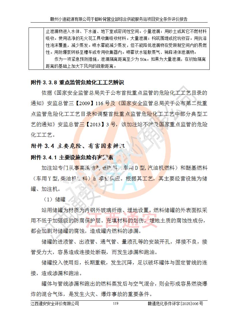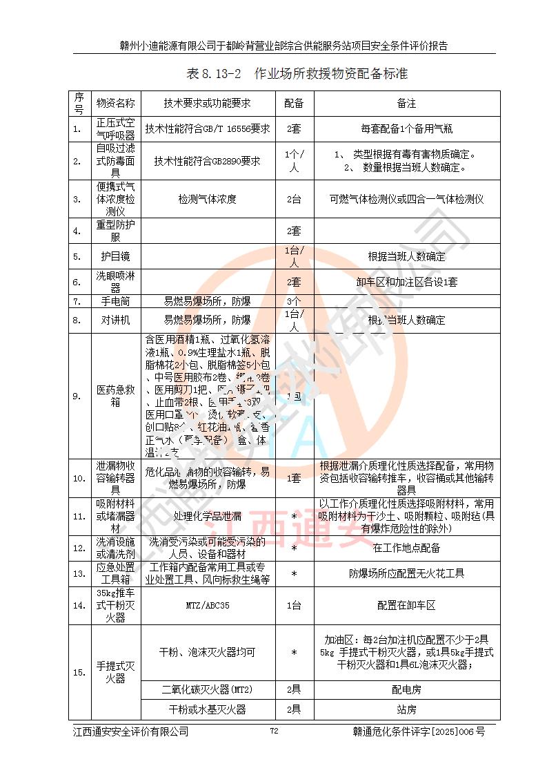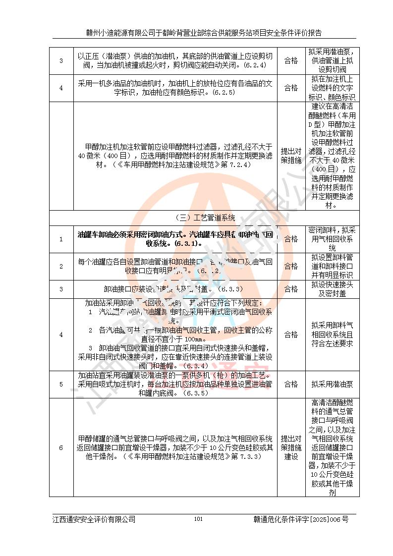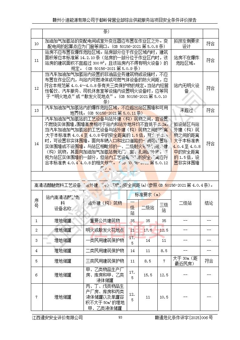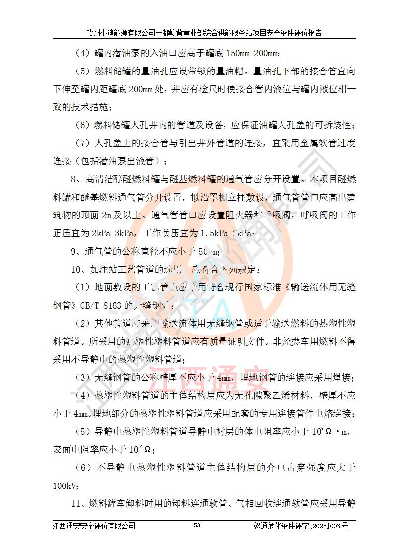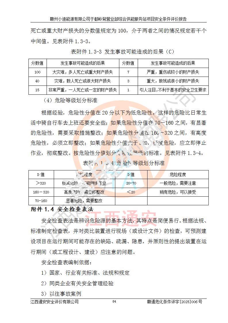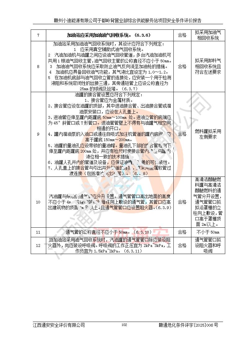 一、安全狀況綜合評(píng)述 通過(guò)對(duì)本項(xiàng)目的危險(xiǎn)、有害因素分析及定性、定量評(píng)價(jià),結(jié)果為: 1)本項(xiàng)目存在的危險(xiǎn)有害因素是火災(zāi)爆炸、**傷害、高處墜落、物體打擊、觸電、機(jī)械傷害、中毒窒息、坍塌等,主要危險(xiǎn)有害因素為火災(zāi)、爆炸等危險(xiǎn)因素。需重點(diǎn)防范的危險(xiǎn)有害因素為火災(zāi)、爆炸。本項(xiàng)目未構(gòu)成危險(xiǎn)化學(xué)品重大危險(xiǎn)源,也不存在劇毒、監(jiān)控、易制毒、易制爆化學(xué)品及高毒物品,高清潔醇醚燃料主要成分甲醇和石腦油為重點(diǎn)監(jiān)管危險(xiǎn)化學(xué)品,應(yīng)按照重點(diǎn)監(jiān)管危險(xiǎn)化學(xué)品相關(guān)規(guī)定管理。 2)預(yù)先危險(xiǎn)性分析表明該加注站儲(chǔ)存、經(jīng)營(yíng)過(guò)程中火災(zāi)、爆炸、觸電的危險(xiǎn)等級(jí)為Ⅲ級(jí),**傷害、高處墜落和中毒窒息等危險(xiǎn)等級(jí)為Ⅱ級(jí)。 3)從作業(yè)條件危險(xiǎn)性分析結(jié)果可以看出,在選定的評(píng)價(jià)單元中卸液作業(yè)、加注作業(yè)、變配電作業(yè)和維修作業(yè)中卸液作業(yè)中火災(zāi)爆炸、**傷害、觸電、中毒、窒息潛在危險(xiǎn)均為一般危險(xiǎn)。 4)從危險(xiǎn)度分析結(jié)果可以看出,燃料罐區(qū)屬中度危險(xiǎn)。 5)根據(jù)選址與總平面布置安全檢查表,該加注站符合《建筑設(shè)計(jì)防火規(guī)范》GB 50016-2014(2018年版)、《汽車加油加氣加氫站技術(shù)標(biāo)準(zhǔn)》GB50156-2021及《車用甲醇燃料加注站建設(shè)規(guī)范》(工信廳節(jié)〔2015〕129號(hào))等有關(guān)標(biāo)準(zhǔn)、規(guī)范的規(guī)定。該站與站外建筑物距離符合規(guī)范要求,站外50m內(nèi)無(wú)重要建筑物和明火設(shè)施。 6)根據(jù)立項(xiàng)批文及于都縣自然資源局出具的建設(shè)用地規(guī)劃許可證,該加注站符合有關(guān)部門的審批。 7)本項(xiàng)目采用成熟的工藝設(shè)備,項(xiàng)目在嚴(yán)格按照**相關(guān)法律、法規(guī)及技術(shù)標(biāo)準(zhǔn)制造、安裝、檢測(cè)檢驗(yàn)的情況下,其安全生產(chǎn)風(fēng)險(xiǎn)程度在可接受范圍。 8)本項(xiàng)目危害物質(zhì)為高清潔醇醚燃料(車用D型,甲類)和醚基燃料(車用Y型,丙類),應(yīng)重點(diǎn)注意火災(zāi)、爆炸危害,做好防火防靜電措施。**加注站罐區(qū)、加注區(qū)無(wú)明火產(chǎn)生;卸液口應(yīng)設(shè)置防靜電報(bào)警器,罐區(qū)法蘭應(yīng)跨接,防止靜電引起火災(zāi)爆炸事故。 四、評(píng)價(jià)結(jié)論 贛州小迪能源有限公司于都嶺背營(yíng)業(yè)部綜合供能服務(wù)站項(xiàng)目總平面布置符合相關(guān)規(guī)范的要求。在項(xiàng)目建設(shè)和運(yùn)行階段,總平面布置設(shè)計(jì)、施工圖設(shè)計(jì)和建設(shè)施工、安裝調(diào)試及生產(chǎn)運(yùn)行中,應(yīng)嚴(yán)格執(zhí)行**有關(guān)安全生產(chǎn)法律、法規(guī)和有關(guān)標(biāo)準(zhǔn)、規(guī)范,將本報(bào)告中提出的安全對(duì)策措施落實(shí)到位,真正做到安全設(shè)施與主體工程同時(shí)設(shè)計(jì)、同時(shí)施工、同時(shí)投入生產(chǎn)和使用,項(xiàng)目建成后危險(xiǎn)、有害因素可以得到**控制,安全風(fēng)險(xiǎn)在可接受范圍,擬建的贛州小迪能源有限公司于都嶺背營(yíng)業(yè)部綜合供能服務(wù)站項(xiàng)目符合法律法規(guī)、標(biāo)準(zhǔn)、規(guī)章和規(guī)范的要求。 |