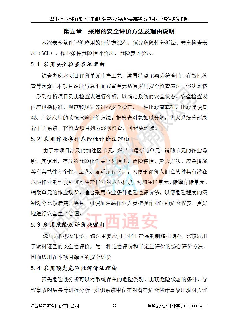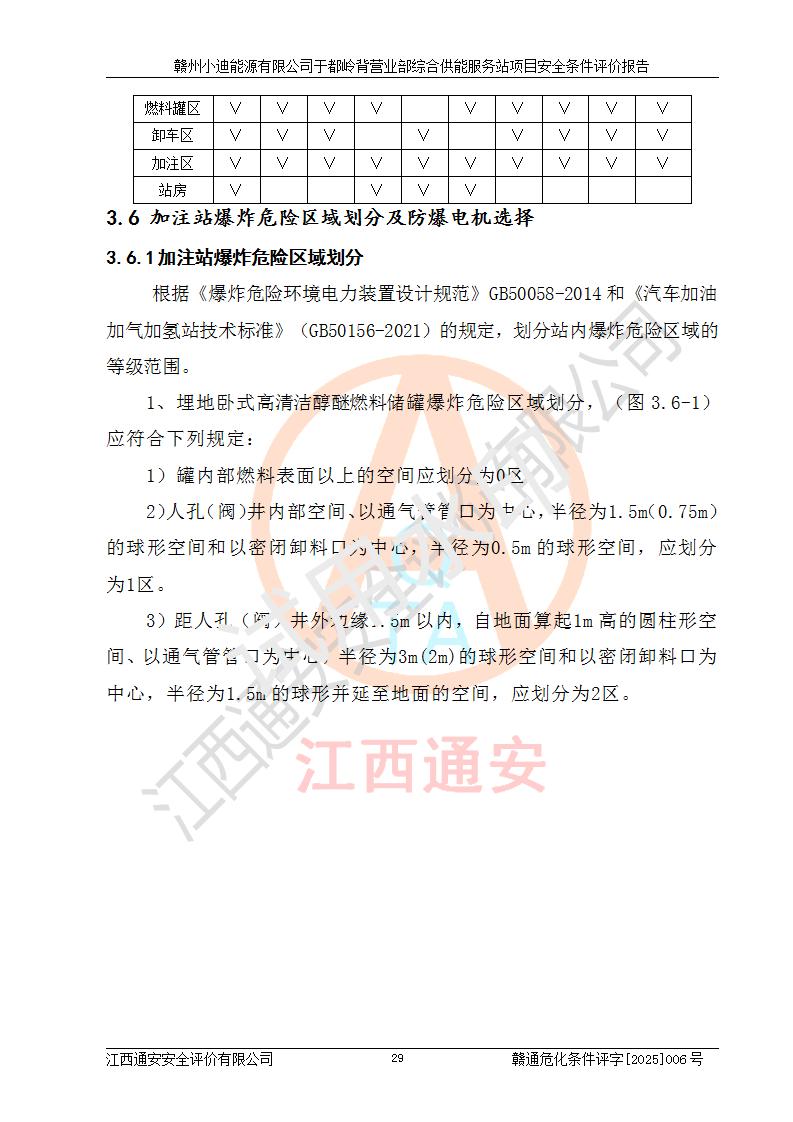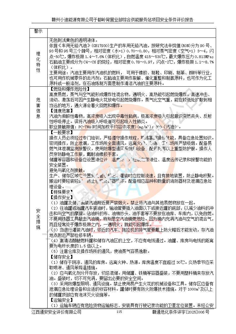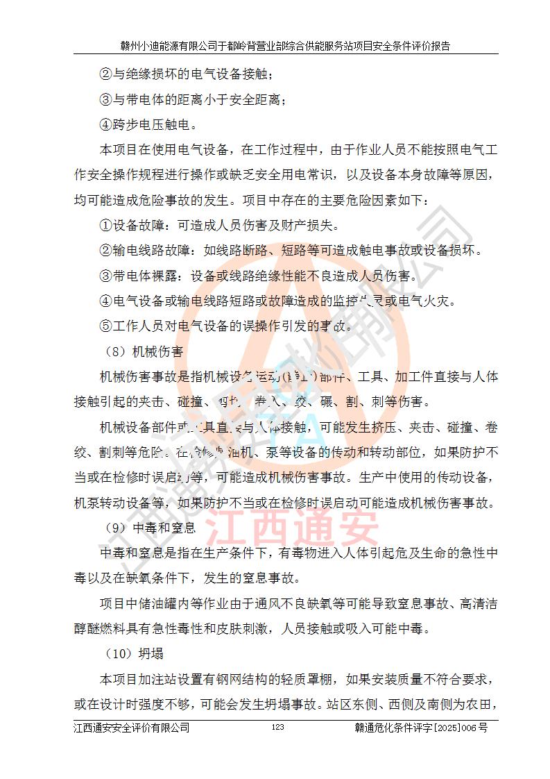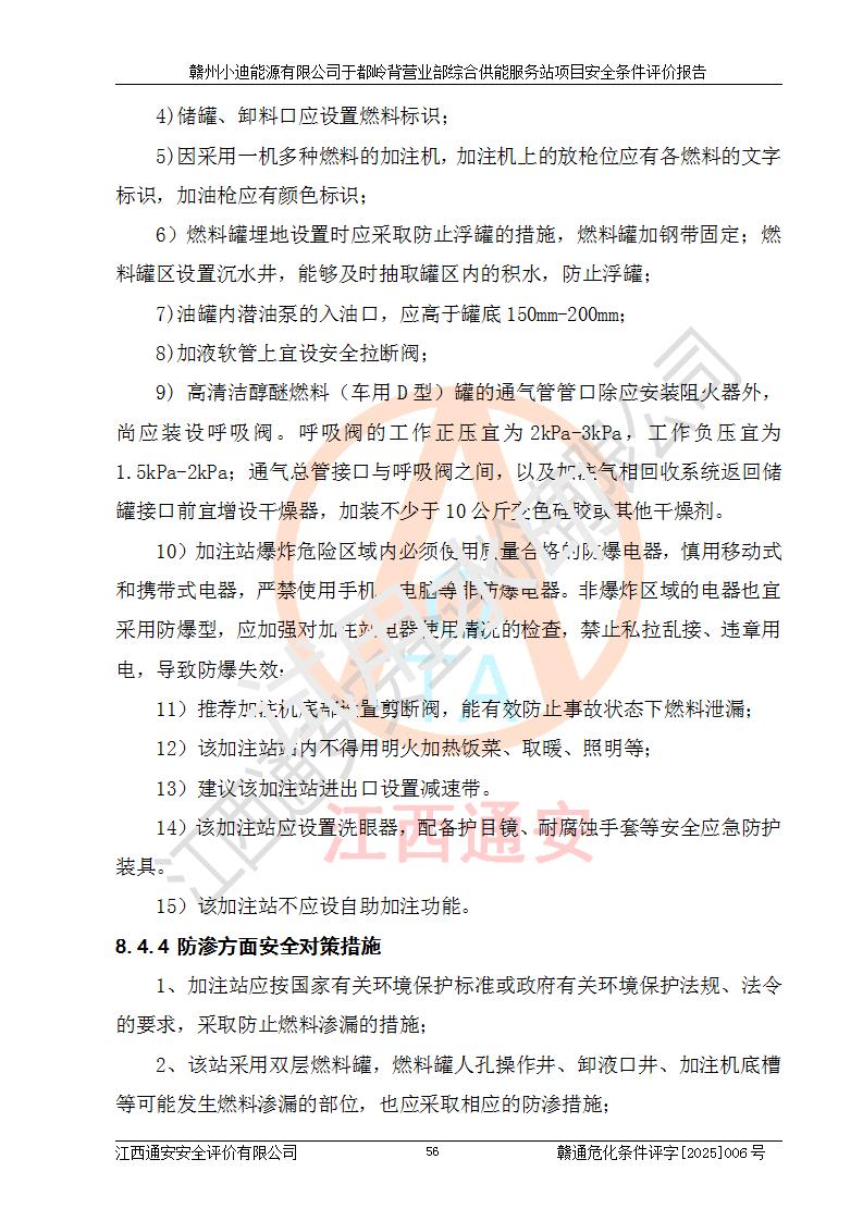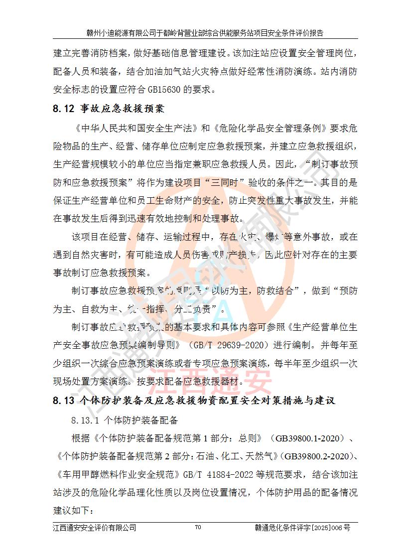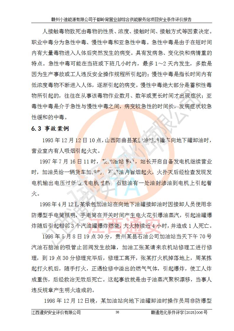 一、安全狀況綜合評(píng)述 通過(guò)對(duì)本項(xiàng)目的危險(xiǎn)、有害因素分析及定性、定量評(píng)價(jià),結(jié)果為: 1)本項(xiàng)目存在的危險(xiǎn)有害因素是火災(zāi)爆炸、**傷害、高處墜落、物體打擊、觸電、機(jī)械傷害、中毒窒息、坍塌等,主要危險(xiǎn)有害因素為火災(zāi)、爆炸等危險(xiǎn)因素。需重點(diǎn)防范的危險(xiǎn)有害因素為火災(zāi)、爆炸。本項(xiàng)目未構(gòu)成危險(xiǎn)化學(xué)品重大危險(xiǎn)源,也不存在劇毒、監(jiān)控、易制毒、易制爆化學(xué)品及高毒物品,高清潔醇醚燃料主要成分甲醇和石腦油為重點(diǎn)監(jiān)管危險(xiǎn)化學(xué)品,應(yīng)按照重點(diǎn)監(jiān)管危險(xiǎn)化學(xué)品相關(guān)規(guī)定管理。 2)預(yù)先危險(xiǎn)性分析表明該加注站儲(chǔ)存、經(jīng)營(yíng)過(guò)程中火災(zāi)、爆炸、觸電的危險(xiǎn)等級(jí)為Ⅲ級(jí),**傷害、高處墜落和中毒窒息等危險(xiǎn)等級(jí)為Ⅱ級(jí)。 3)從作業(yè)條件危險(xiǎn)性分析結(jié)果可以看出,在選定的評(píng)價(jià)單元中卸液作業(yè)、加注作業(yè)、變配電作業(yè)和維修作業(yè)中卸液作業(yè)中火災(zāi)爆炸、**傷害、觸電、中毒、窒息潛在危險(xiǎn)均為一般危險(xiǎn)。 4)從危險(xiǎn)度分析結(jié)果可以看出,燃料罐區(qū)屬中度危險(xiǎn)。 5)根據(jù)選址與總平面布置安全檢查表,該加注站符合《建筑設(shè)計(jì)防火規(guī)范》GB 50016-2014(2018年版)、《汽車加油加氣加氫站技術(shù)標(biāo)準(zhǔn)》GB50156-2021及《車用甲醇燃料加注站建設(shè)規(guī)范》(工信廳節(jié)〔2015〕129號(hào))等有關(guān)標(biāo)準(zhǔn)、規(guī)范的規(guī)定。該站與站外建筑物距離符合規(guī)范要求,站外50m內(nèi)無(wú)重要建筑物和明火設(shè)施。 6)根據(jù)立項(xiàng)批文及于都縣自然資源局出具的建設(shè)用地規(guī)劃許可證,該加注站符合有關(guān)部門的審批。 7)本項(xiàng)目采用成熟的工藝設(shè)備,項(xiàng)目在嚴(yán)格按照**相關(guān)法律、法規(guī)及技術(shù)標(biāo)準(zhǔn)制造、安裝、檢測(cè)檢驗(yàn)的情況下,其安全生產(chǎn)風(fēng)險(xiǎn)程度在可接受范圍。 8)本項(xiàng)目危害物質(zhì)為高清潔醇醚燃料(車用D型,甲類)和醚基燃料(車用Y型,丙類),應(yīng)重點(diǎn)注意火災(zāi)、爆炸危害,做好防火防靜電措施。**加注站罐區(qū)、加注區(qū)無(wú)明火產(chǎn)生;卸液口應(yīng)設(shè)置防靜電報(bào)警器,罐區(qū)法蘭應(yīng)跨接,防止靜電引起火災(zāi)爆炸事故。 四、評(píng)價(jià)結(jié)論 贛州小迪能源有限公司于都嶺背營(yíng)業(yè)部綜合供能服務(wù)站項(xiàng)目總平面布置符合相關(guān)規(guī)范的要求。在項(xiàng)目建設(shè)和運(yùn)行階段,總平面布置設(shè)計(jì)、施工圖設(shè)計(jì)和建設(shè)施工、安裝調(diào)試及生產(chǎn)運(yùn)行中,應(yīng)嚴(yán)格執(zhí)行**有關(guān)安全生產(chǎn)法律、法規(guī)和有關(guān)標(biāo)準(zhǔn)、規(guī)范,將本報(bào)告中提出的安全對(duì)策措施落實(shí)到位,真正做到安全設(shè)施與主體工程同時(shí)設(shè)計(jì)、同時(shí)施工、同時(shí)投入生產(chǎn)和使用,項(xiàng)目建成后危險(xiǎn)、有害因素可以得到**控制,安全風(fēng)險(xiǎn)在可接受范圍,擬建的贛州小迪能源有限公司于都嶺背營(yíng)業(yè)部綜合供能服務(wù)站項(xiàng)目符合法律法規(guī)、標(biāo)準(zhǔn)、規(guī)章和規(guī)范的要求。 |