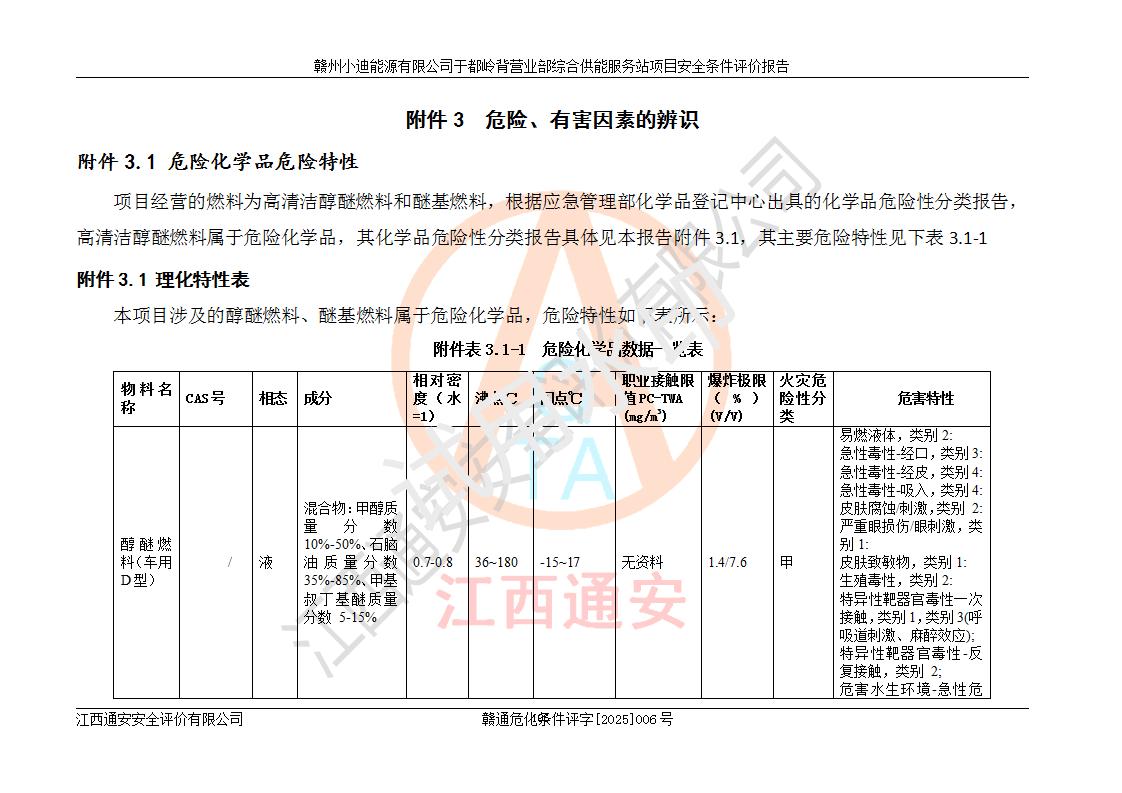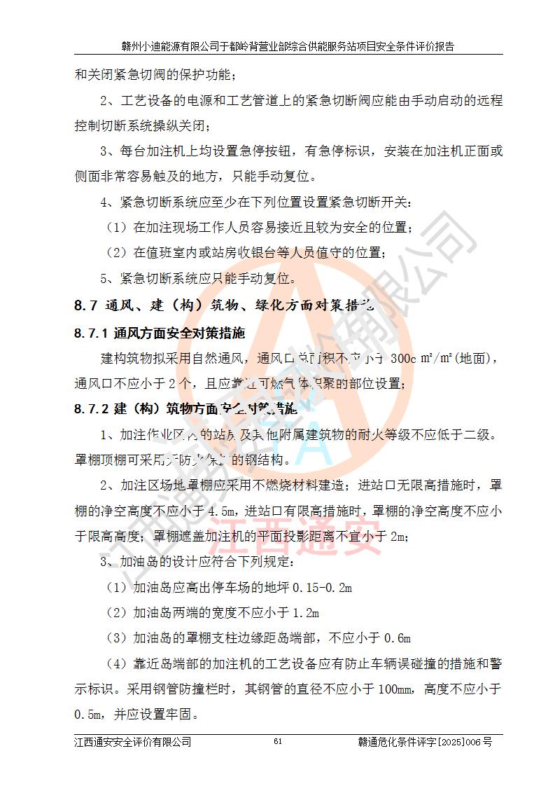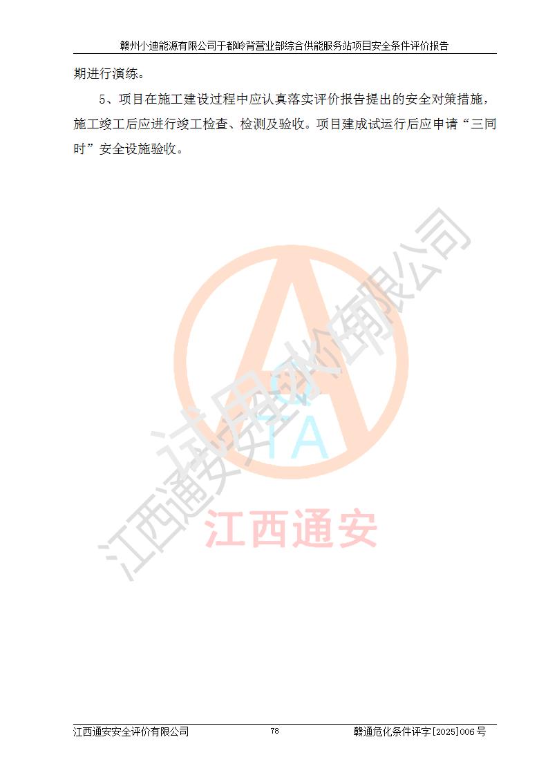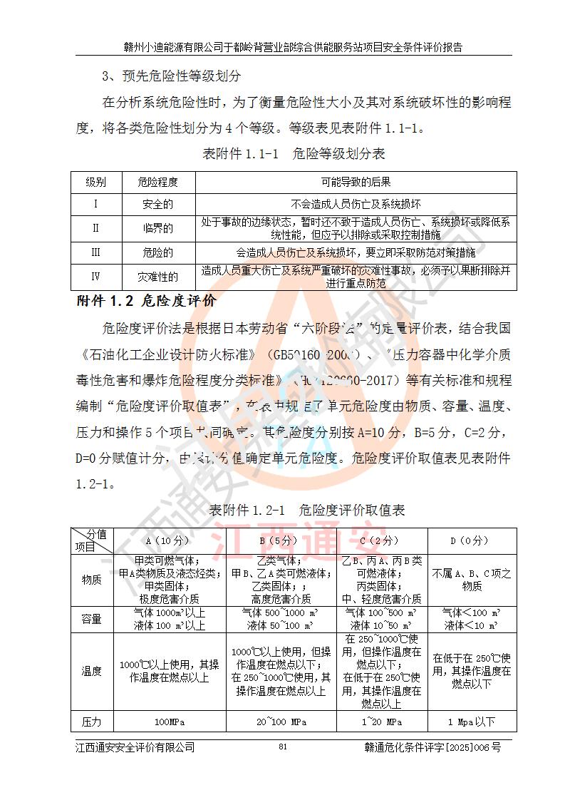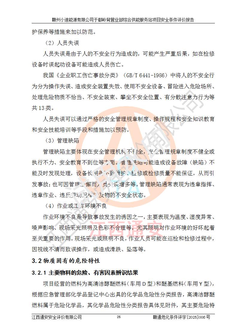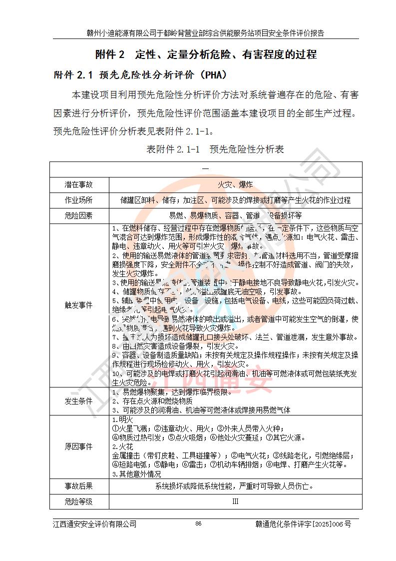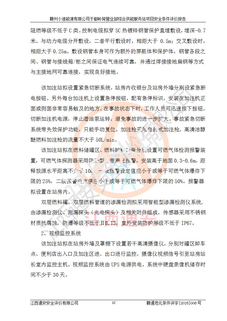 一、安全狀況綜合評(píng)述 通過(guò)對(duì)本項(xiàng)目的危險(xiǎn)、有害因素分析及定性、定量評(píng)價(jià),結(jié)果為: 1)本項(xiàng)目存在的危險(xiǎn)有害因素是火災(zāi)爆炸、**傷害、高處墜落、物體打擊、觸電、機(jī)械傷害、中毒窒息、坍塌等,主要危險(xiǎn)有害因素為火災(zāi)、爆炸等危險(xiǎn)因素。需重點(diǎn)防范的危險(xiǎn)有害因素為火災(zāi)、爆炸。本項(xiàng)目未構(gòu)成危險(xiǎn)化學(xué)品重大危險(xiǎn)源,也不存在劇毒、監(jiān)控、易制毒、易制爆化學(xué)品及高毒物品,高清潔醇醚燃料主要成分甲醇和石腦油為重點(diǎn)監(jiān)管危險(xiǎn)化學(xué)品,應(yīng)按照重點(diǎn)監(jiān)管危險(xiǎn)化學(xué)品相關(guān)規(guī)定管理。 2)預(yù)先危險(xiǎn)性分析表明該加注站儲(chǔ)存、經(jīng)營(yíng)過(guò)程中火災(zāi)、爆炸、觸電的危險(xiǎn)等級(jí)為Ⅲ級(jí),**傷害、高處墜落和中毒窒息等危險(xiǎn)等級(jí)為Ⅱ級(jí)。 3)從作業(yè)條件危險(xiǎn)性分析結(jié)果可以看出,在選定的評(píng)價(jià)單元中卸液作業(yè)、加注作業(yè)、變配電作業(yè)和維修作業(yè)中卸液作業(yè)中火災(zāi)爆炸、**傷害、觸電、中毒、窒息潛在危險(xiǎn)均為一般危險(xiǎn)。 4)從危險(xiǎn)度分析結(jié)果可以看出,燃料罐區(qū)屬中度危險(xiǎn)。 5)根據(jù)選址與總平面布置安全檢查表,該加注站符合《建筑設(shè)計(jì)防火規(guī)范》GB 50016-2014(2018年版)、《汽車加油加氣加氫站技術(shù)標(biāo)準(zhǔn)》GB50156-2021及《車用甲醇燃料加注站建設(shè)規(guī)范》(工信廳節(jié)〔2015〕129號(hào))等有關(guān)標(biāo)準(zhǔn)、規(guī)范的規(guī)定。該站與站外建筑物距離符合規(guī)范要求,站外50m內(nèi)無(wú)重要建筑物和明火設(shè)施。 6)根據(jù)立項(xiàng)批文及于都縣自然資源局出具的建設(shè)用地規(guī)劃許可證,該加注站符合有關(guān)部門的審批。 7)本項(xiàng)目采用成熟的工藝設(shè)備,項(xiàng)目在嚴(yán)格按照**相關(guān)法律、法規(guī)及技術(shù)標(biāo)準(zhǔn)制造、安裝、檢測(cè)檢驗(yàn)的情況下,其安全生產(chǎn)風(fēng)險(xiǎn)程度在可接受范圍。 8)本項(xiàng)目危害物質(zhì)為高清潔醇醚燃料(車用D型,甲類)和醚基燃料(車用Y型,丙類),應(yīng)重點(diǎn)注意火災(zāi)、爆炸危害,做好防火防靜電措施。**加注站罐區(qū)、加注區(qū)無(wú)明火產(chǎn)生;卸液口應(yīng)設(shè)置防靜電報(bào)警器,罐區(qū)法蘭應(yīng)跨接,防止靜電引起火災(zāi)爆炸事故。 四、評(píng)價(jià)結(jié)論 贛州小迪能源有限公司于都嶺背營(yíng)業(yè)部綜合供能服務(wù)站項(xiàng)目總平面布置符合相關(guān)規(guī)范的要求。在項(xiàng)目建設(shè)和運(yùn)行階段,總平面布置設(shè)計(jì)、施工圖設(shè)計(jì)和建設(shè)施工、安裝調(diào)試及生產(chǎn)運(yùn)行中,應(yīng)嚴(yán)格執(zhí)行**有關(guān)安全生產(chǎn)法律、法規(guī)和有關(guān)標(biāo)準(zhǔn)、規(guī)范,將本報(bào)告中提出的安全對(duì)策措施落實(shí)到位,真正做到安全設(shè)施與主體工程同時(shí)設(shè)計(jì)、同時(shí)施工、同時(shí)投入生產(chǎn)和使用,項(xiàng)目建成后危險(xiǎn)、有害因素可以得到**控制,安全風(fēng)險(xiǎn)在可接受范圍,擬建的贛州小迪能源有限公司于都嶺背營(yíng)業(yè)部綜合供能服務(wù)站項(xiàng)目符合法律法規(guī)、標(biāo)準(zhǔn)、規(guī)章和規(guī)范的要求。 |