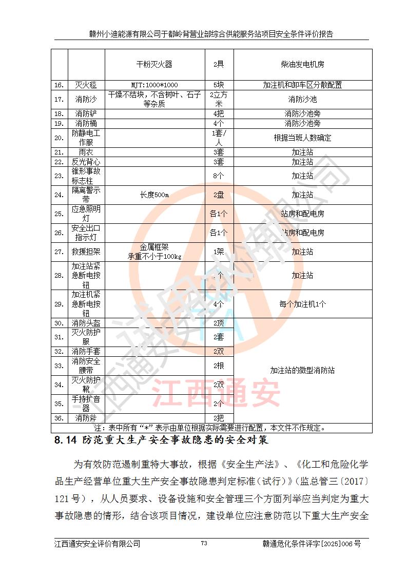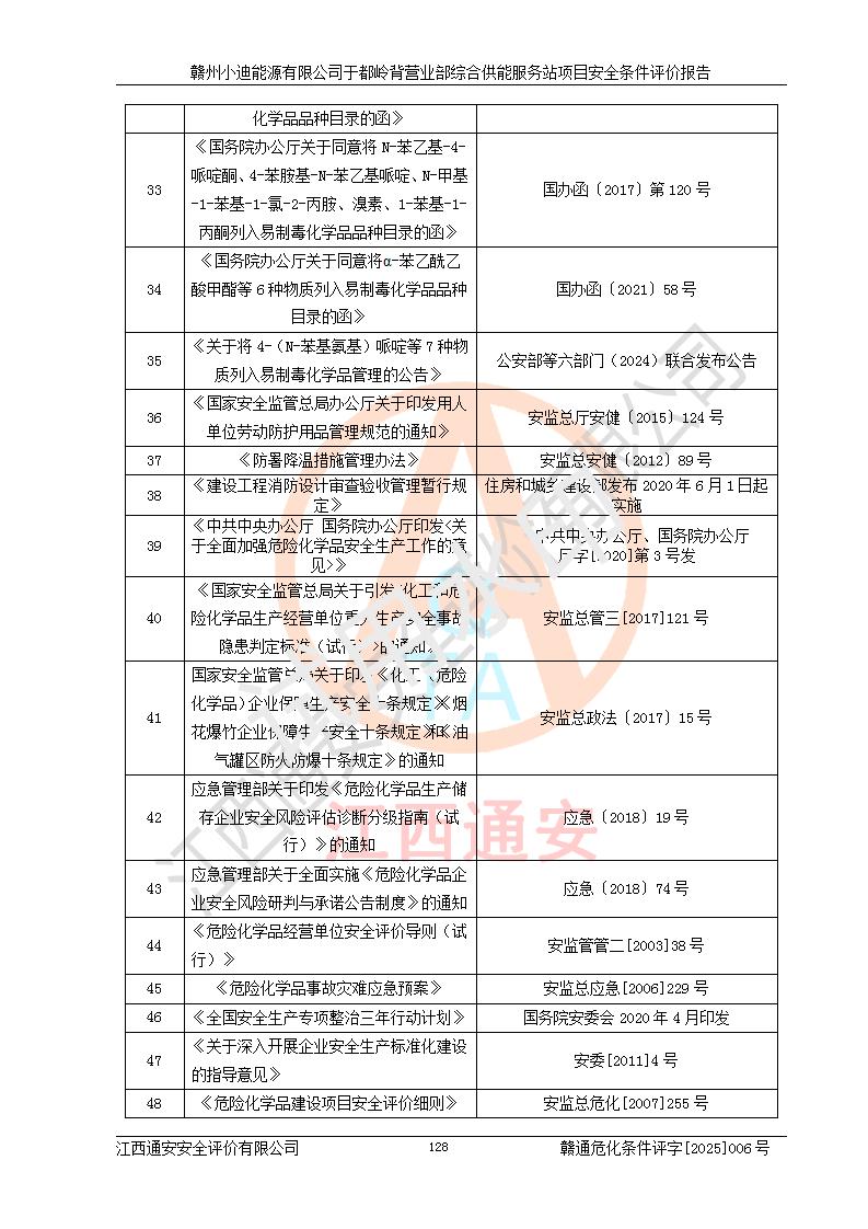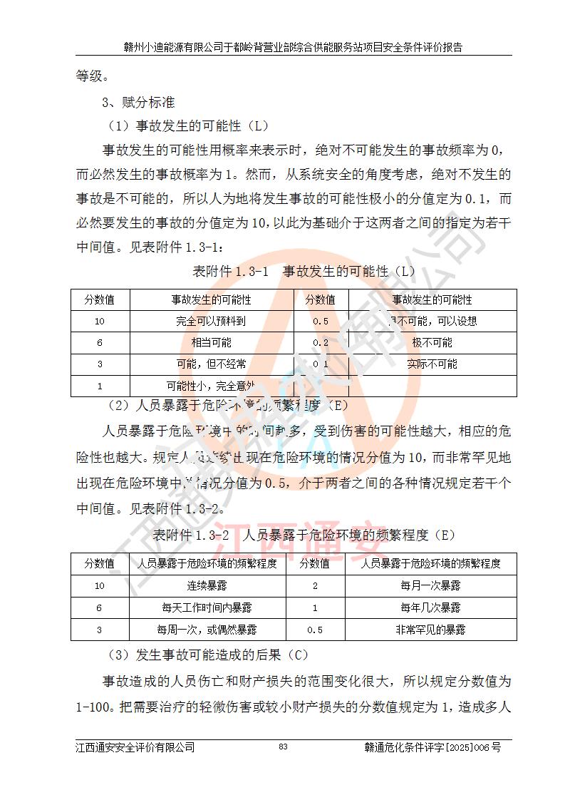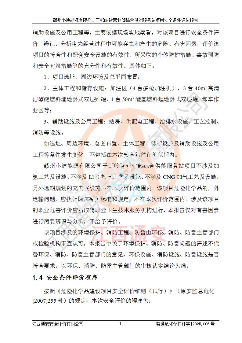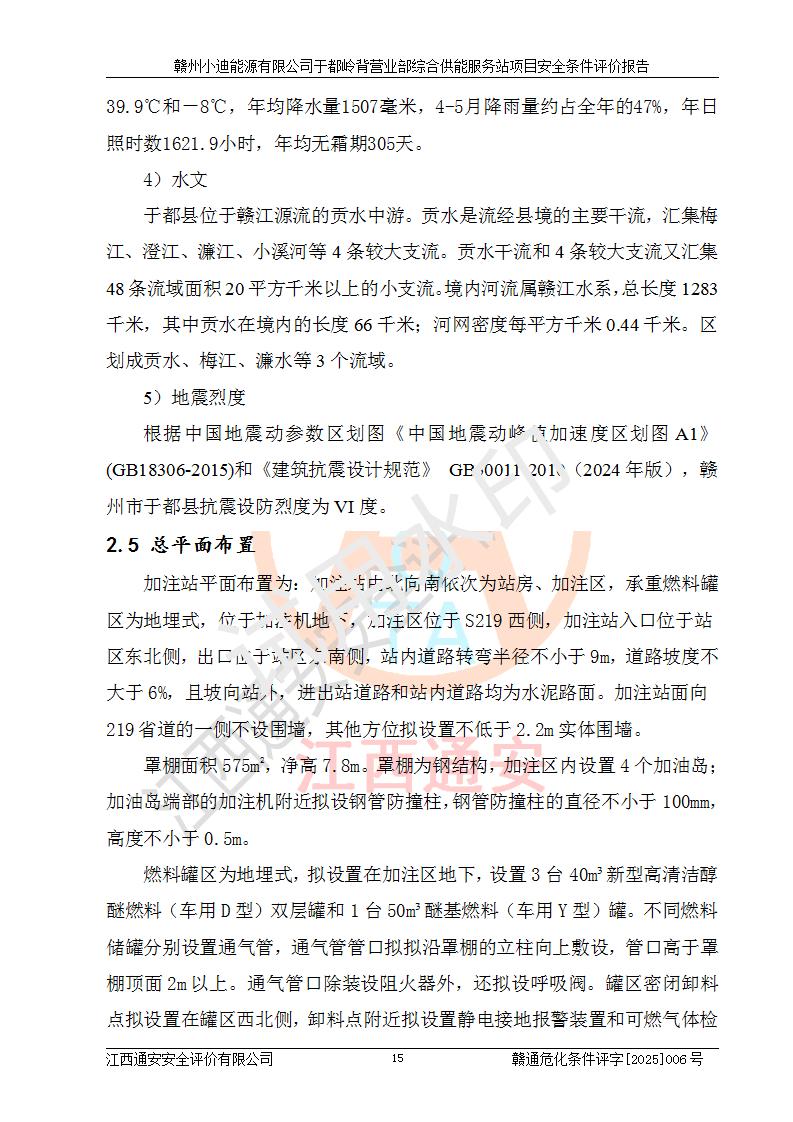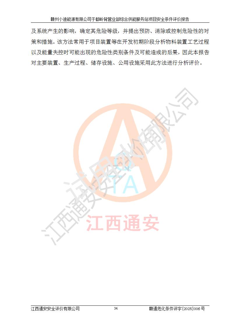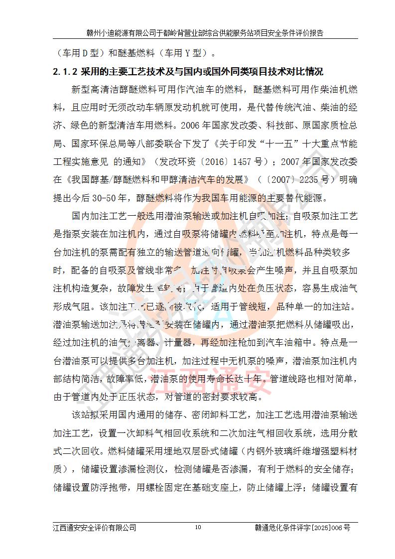 一、安全狀況綜合評(píng)述 通過(guò)對(duì)本項(xiàng)目的危險(xiǎn)、有害因素分析及定性、定量評(píng)價(jià),結(jié)果為: 1)本項(xiàng)目存在的危險(xiǎn)有害因素是火災(zāi)爆炸、**傷害、高處墜落、物體打擊、觸電、機(jī)械傷害、中毒窒息、坍塌等,主要危險(xiǎn)有害因素為火災(zāi)、爆炸等危險(xiǎn)因素。需重點(diǎn)防范的危險(xiǎn)有害因素為火災(zāi)、爆炸。本項(xiàng)目未構(gòu)成危險(xiǎn)化學(xué)品重大危險(xiǎn)源,也不存在劇毒、監(jiān)控、易制毒、易制爆化學(xué)品及高毒物品,高清潔醇醚燃料主要成分甲醇和石腦油為重點(diǎn)監(jiān)管危險(xiǎn)化學(xué)品,應(yīng)按照重點(diǎn)監(jiān)管危險(xiǎn)化學(xué)品相關(guān)規(guī)定管理。 2)預(yù)先危險(xiǎn)性分析表明該加注站儲(chǔ)存、經(jīng)營(yíng)過(guò)程中火災(zāi)、爆炸、觸電的危險(xiǎn)等級(jí)為Ⅲ級(jí),**傷害、高處墜落和中毒窒息等危險(xiǎn)等級(jí)為Ⅱ級(jí)。 3)從作業(yè)條件危險(xiǎn)性分析結(jié)果可以看出,在選定的評(píng)價(jià)單元中卸液作業(yè)、加注作業(yè)、變配電作業(yè)和維修作業(yè)中卸液作業(yè)中火災(zāi)爆炸、**傷害、觸電、中毒、窒息潛在危險(xiǎn)均為一般危險(xiǎn)。 4)從危險(xiǎn)度分析結(jié)果可以看出,燃料罐區(qū)屬中度危險(xiǎn)。 5)根據(jù)選址與總平面布置安全檢查表,該加注站符合《建筑設(shè)計(jì)防火規(guī)范》GB 50016-2014(2018年版)、《汽車加油加氣加氫站技術(shù)標(biāo)準(zhǔn)》GB50156-2021及《車用甲醇燃料加注站建設(shè)規(guī)范》(工信廳節(jié)〔2015〕129號(hào))等有關(guān)標(biāo)準(zhǔn)、規(guī)范的規(guī)定。該站與站外建筑物距離符合規(guī)范要求,站外50m內(nèi)無(wú)重要建筑物和明火設(shè)施。 6)根據(jù)立項(xiàng)批文及于都縣自然資源局出具的建設(shè)用地規(guī)劃許可證,該加注站符合有關(guān)部門的審批。 7)本項(xiàng)目采用成熟的工藝設(shè)備,項(xiàng)目在嚴(yán)格按照**相關(guān)法律、法規(guī)及技術(shù)標(biāo)準(zhǔn)制造、安裝、檢測(cè)檢驗(yàn)的情況下,其安全生產(chǎn)風(fēng)險(xiǎn)程度在可接受范圍。 8)本項(xiàng)目危害物質(zhì)為高清潔醇醚燃料(車用D型,甲類)和醚基燃料(車用Y型,丙類),應(yīng)重點(diǎn)注意火災(zāi)、爆炸危害,做好防火防靜電措施。**加注站罐區(qū)、加注區(qū)無(wú)明火產(chǎn)生;卸液口應(yīng)設(shè)置防靜電報(bào)警器,罐區(qū)法蘭應(yīng)跨接,防止靜電引起火災(zāi)爆炸事故。 四、評(píng)價(jià)結(jié)論 贛州小迪能源有限公司于都嶺背營(yíng)業(yè)部綜合供能服務(wù)站項(xiàng)目總平面布置符合相關(guān)規(guī)范的要求。在項(xiàng)目建設(shè)和運(yùn)行階段,總平面布置設(shè)計(jì)、施工圖設(shè)計(jì)和建設(shè)施工、安裝調(diào)試及生產(chǎn)運(yùn)行中,應(yīng)嚴(yán)格執(zhí)行**有關(guān)安全生產(chǎn)法律、法規(guī)和有關(guān)標(biāo)準(zhǔn)、規(guī)范,將本報(bào)告中提出的安全對(duì)策措施落實(shí)到位,真正做到安全設(shè)施與主體工程同時(shí)設(shè)計(jì)、同時(shí)施工、同時(shí)投入生產(chǎn)和使用,項(xiàng)目建成后危險(xiǎn)、有害因素可以得到**控制,安全風(fēng)險(xiǎn)在可接受范圍,擬建的贛州小迪能源有限公司于都嶺背營(yíng)業(yè)部綜合供能服務(wù)站項(xiàng)目符合法律法規(guī)、標(biāo)準(zhǔn)、規(guī)章和規(guī)范的要求。 |