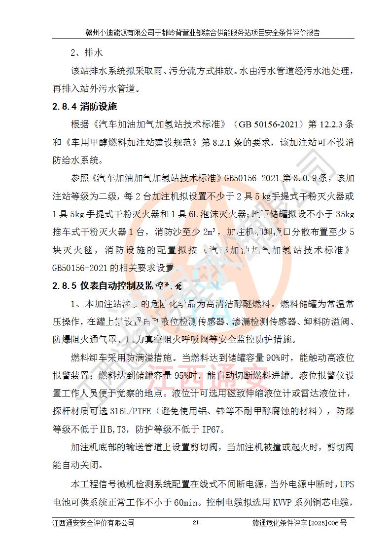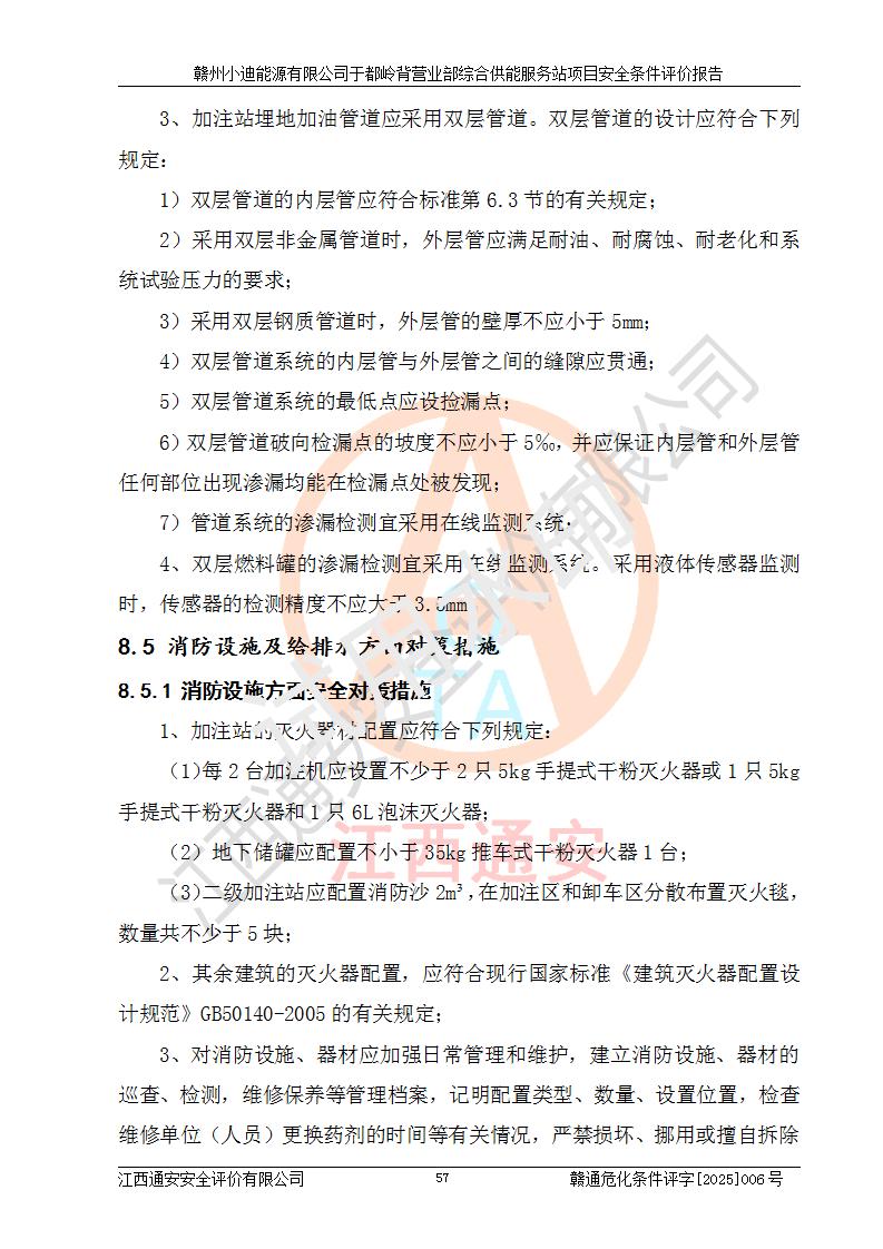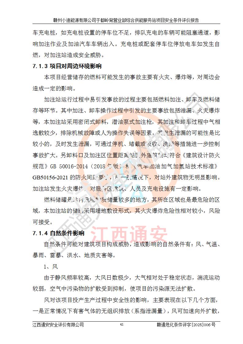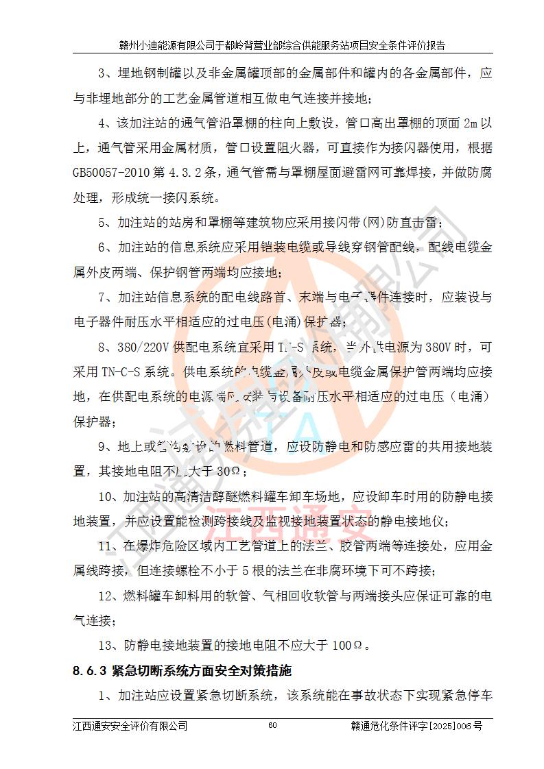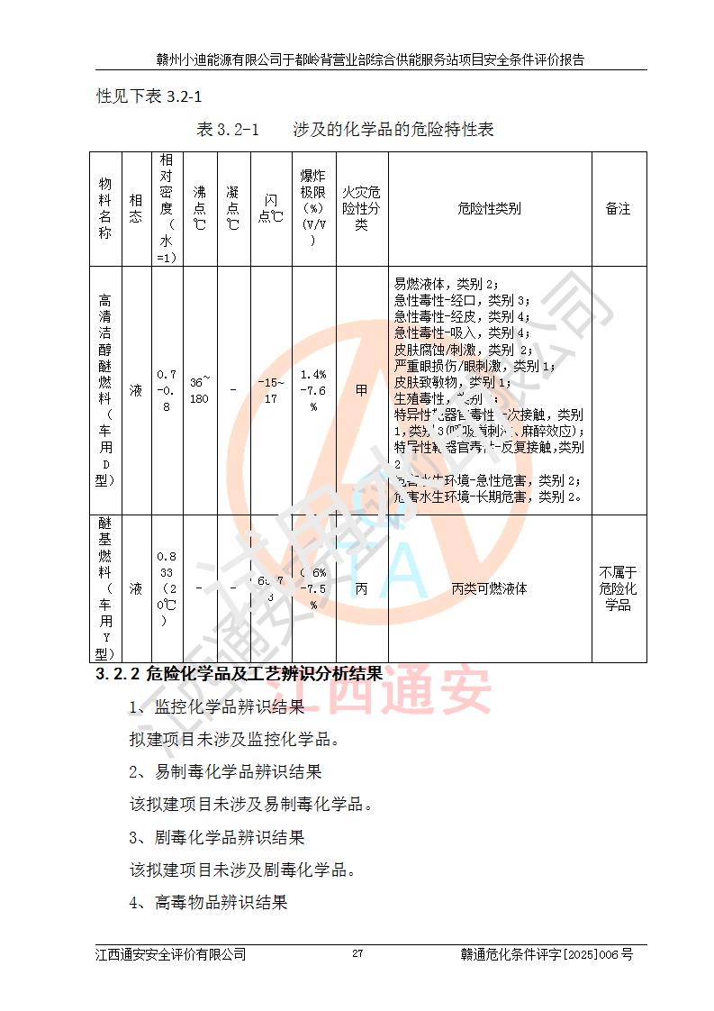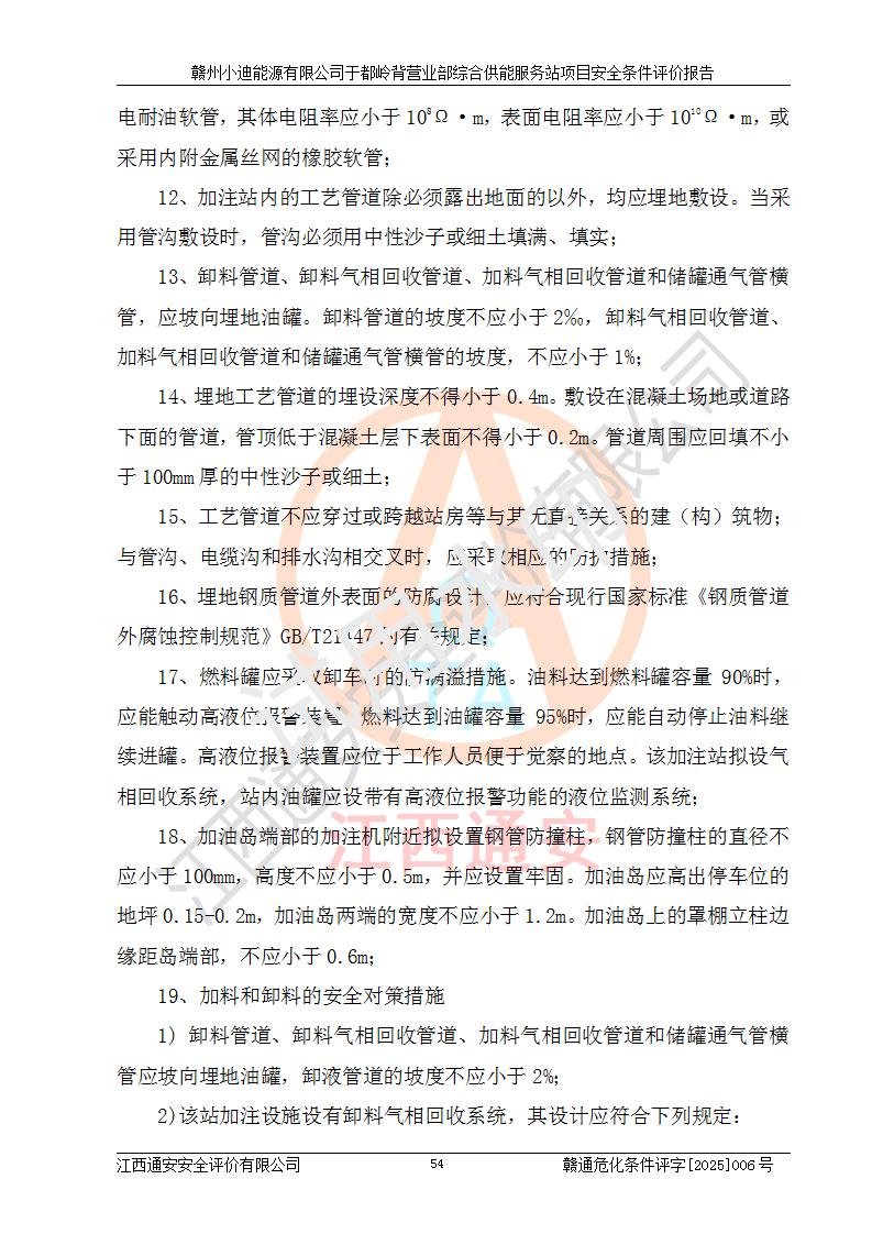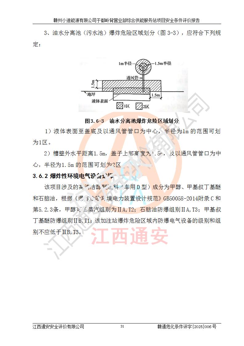 一、安全狀況綜合評(píng)述 通過(guò)對(duì)本項(xiàng)目的危險(xiǎn)、有害因素分析及定性、定量評(píng)價(jià),結(jié)果為: 1)本項(xiàng)目存在的危險(xiǎn)有害因素是火災(zāi)爆炸、**傷害、高處墜落、物體打擊、觸電、機(jī)械傷害、中毒窒息、坍塌等,主要危險(xiǎn)有害因素為火災(zāi)、爆炸等危險(xiǎn)因素。需重點(diǎn)防范的危險(xiǎn)有害因素為火災(zāi)、爆炸。本項(xiàng)目未構(gòu)成危險(xiǎn)化學(xué)品重大危險(xiǎn)源,也不存在劇毒、監(jiān)控、易制毒、易制爆化學(xué)品及高毒物品,高清潔醇醚燃料主要成分甲醇和石腦油為重點(diǎn)監(jiān)管危險(xiǎn)化學(xué)品,應(yīng)按照重點(diǎn)監(jiān)管危險(xiǎn)化學(xué)品相關(guān)規(guī)定管理。 2)預(yù)先危險(xiǎn)性分析表明該加注站儲(chǔ)存、經(jīng)營(yíng)過(guò)程中火災(zāi)、爆炸、觸電的危險(xiǎn)等級(jí)為Ⅲ級(jí),**傷害、高處墜落和中毒窒息等危險(xiǎn)等級(jí)為Ⅱ級(jí)。 3)從作業(yè)條件危險(xiǎn)性分析結(jié)果可以看出,在選定的評(píng)價(jià)單元中卸液作業(yè)、加注作業(yè)、變配電作業(yè)和維修作業(yè)中卸液作業(yè)中火災(zāi)爆炸、**傷害、觸電、中毒、窒息潛在危險(xiǎn)均為一般危險(xiǎn)。 4)從危險(xiǎn)度分析結(jié)果可以看出,燃料罐區(qū)屬中度危險(xiǎn)。 5)根據(jù)選址與總平面布置安全檢查表,該加注站符合《建筑設(shè)計(jì)防火規(guī)范》GB 50016-2014(2018年版)、《汽車加油加氣加氫站技術(shù)標(biāo)準(zhǔn)》GB50156-2021及《車用甲醇燃料加注站建設(shè)規(guī)范》(工信廳節(jié)〔2015〕129號(hào))等有關(guān)標(biāo)準(zhǔn)、規(guī)范的規(guī)定。該站與站外建筑物距離符合規(guī)范要求,站外50m內(nèi)無(wú)重要建筑物和明火設(shè)施。 6)根據(jù)立項(xiàng)批文及于都縣自然資源局出具的建設(shè)用地規(guī)劃許可證,該加注站符合有關(guān)部門的審批。 7)本項(xiàng)目采用成熟的工藝設(shè)備,項(xiàng)目在嚴(yán)格按照**相關(guān)法律、法規(guī)及技術(shù)標(biāo)準(zhǔn)制造、安裝、檢測(cè)檢驗(yàn)的情況下,其安全生產(chǎn)風(fēng)險(xiǎn)程度在可接受范圍。 8)本項(xiàng)目危害物質(zhì)為高清潔醇醚燃料(車用D型,甲類)和醚基燃料(車用Y型,丙類),應(yīng)重點(diǎn)注意火災(zāi)、爆炸危害,做好防火防靜電措施。**加注站罐區(qū)、加注區(qū)無(wú)明火產(chǎn)生;卸液口應(yīng)設(shè)置防靜電報(bào)警器,罐區(qū)法蘭應(yīng)跨接,防止靜電引起火災(zāi)爆炸事故。 四、評(píng)價(jià)結(jié)論 贛州小迪能源有限公司于都嶺背營(yíng)業(yè)部綜合供能服務(wù)站項(xiàng)目總平面布置符合相關(guān)規(guī)范的要求。在項(xiàng)目建設(shè)和運(yùn)行階段,總平面布置設(shè)計(jì)、施工圖設(shè)計(jì)和建設(shè)施工、安裝調(diào)試及生產(chǎn)運(yùn)行中,應(yīng)嚴(yán)格執(zhí)行**有關(guān)安全生產(chǎn)法律、法規(guī)和有關(guān)標(biāo)準(zhǔn)、規(guī)范,將本報(bào)告中提出的安全對(duì)策措施落實(shí)到位,真正做到安全設(shè)施與主體工程同時(shí)設(shè)計(jì)、同時(shí)施工、同時(shí)投入生產(chǎn)和使用,項(xiàng)目建成后危險(xiǎn)、有害因素可以得到**控制,安全風(fēng)險(xiǎn)在可接受范圍,擬建的贛州小迪能源有限公司于都嶺背營(yíng)業(yè)部綜合供能服務(wù)站項(xiàng)目符合法律法規(guī)、標(biāo)準(zhǔn)、規(guī)章和規(guī)范的要求。 |