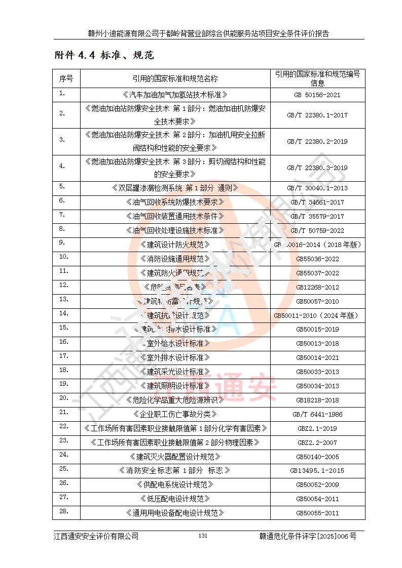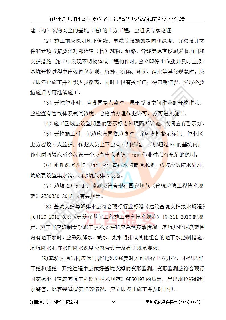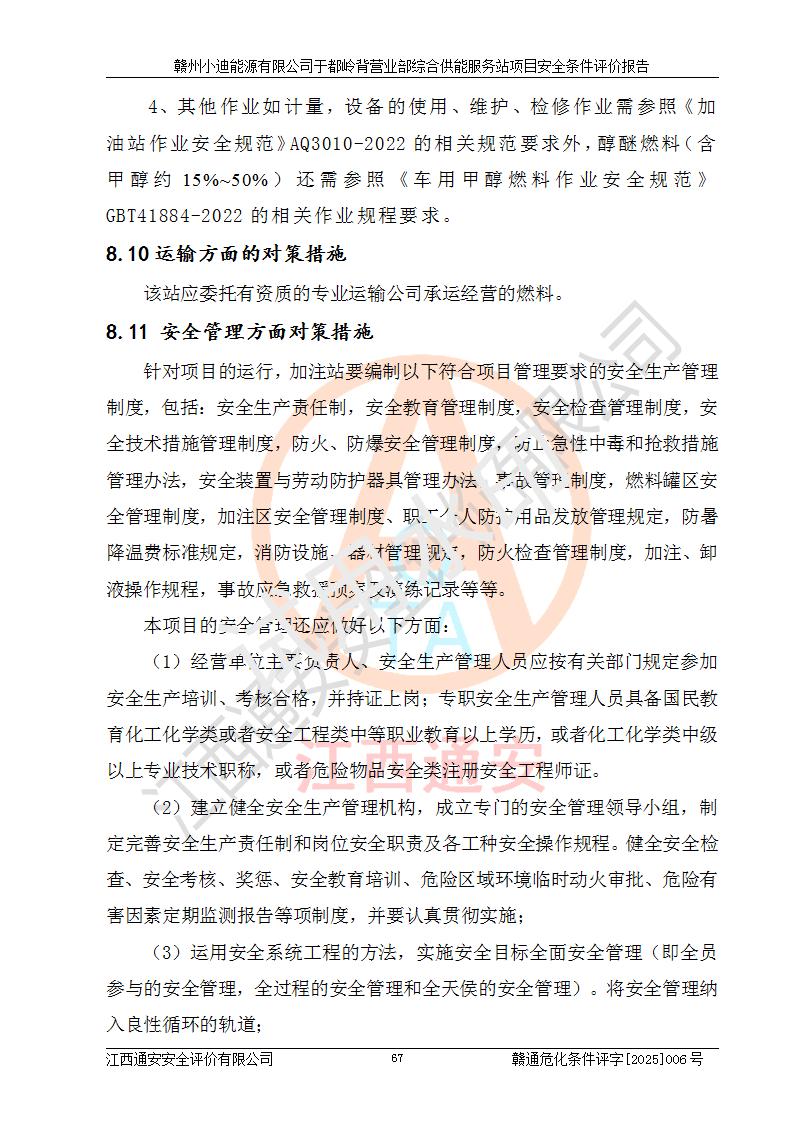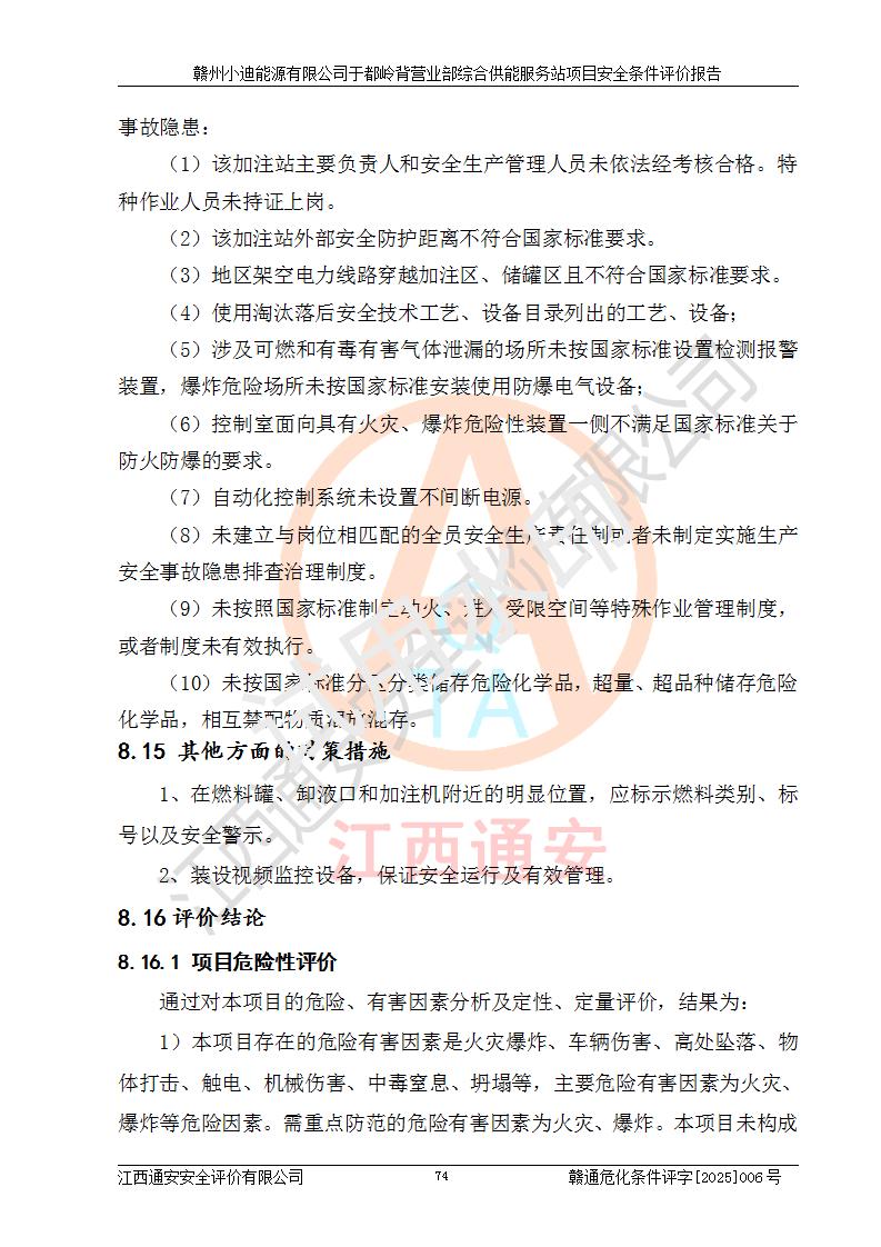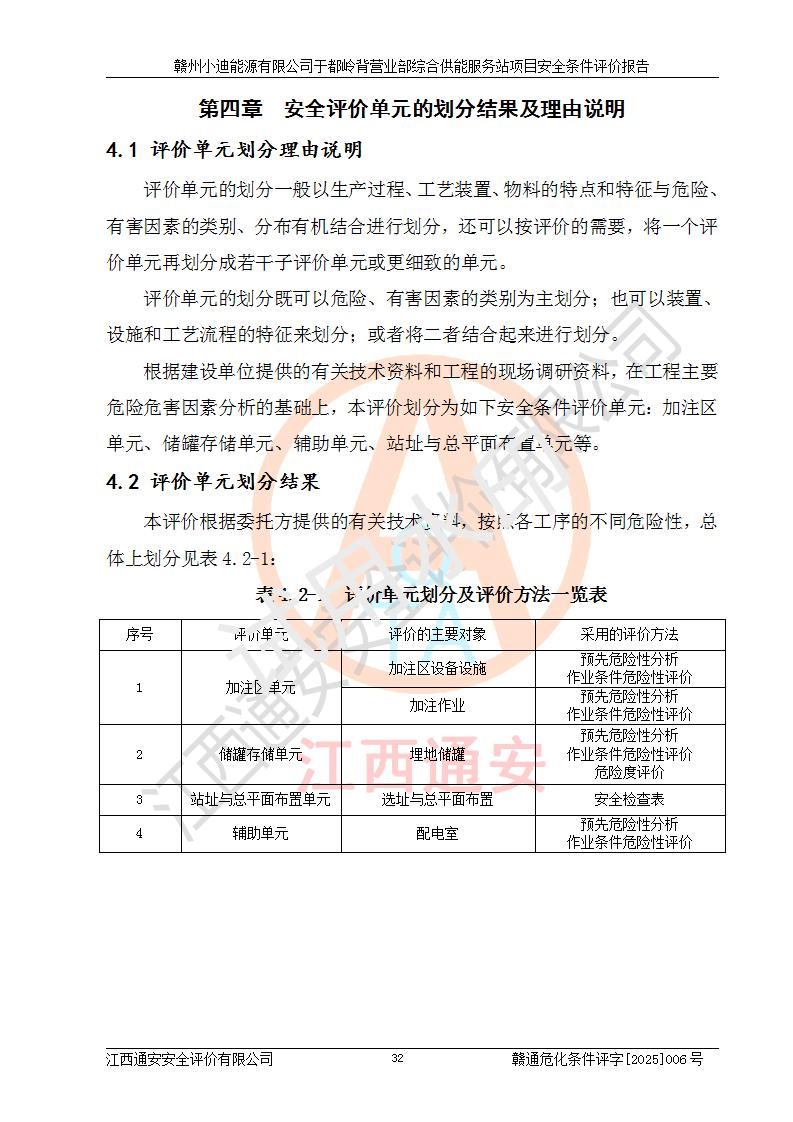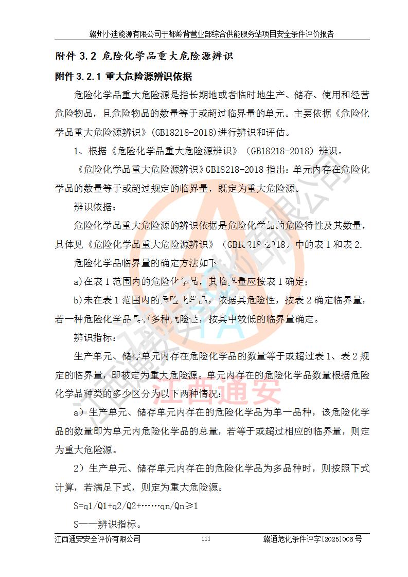 一、安全狀況綜合評(píng)述 通過(guò)對(duì)本項(xiàng)目的危險(xiǎn)、有害因素分析及定性、定量評(píng)價(jià),結(jié)果為: 1)本項(xiàng)目存在的危險(xiǎn)有害因素是火災(zāi)爆炸、**傷害、高處墜落、物體打擊、觸電、機(jī)械傷害、中毒窒息、坍塌等,主要危險(xiǎn)有害因素為火災(zāi)、爆炸等危險(xiǎn)因素。需重點(diǎn)防范的危險(xiǎn)有害因素為火災(zāi)、爆炸。本項(xiàng)目未構(gòu)成危險(xiǎn)化學(xué)品重大危險(xiǎn)源,也不存在劇毒、監(jiān)控、易制毒、易制爆化學(xué)品及高毒物品,高清潔醇醚燃料主要成分甲醇和石腦油為重點(diǎn)監(jiān)管危險(xiǎn)化學(xué)品,應(yīng)按照重點(diǎn)監(jiān)管危險(xiǎn)化學(xué)品相關(guān)規(guī)定管理。 2)預(yù)先危險(xiǎn)性分析表明該加注站儲(chǔ)存、經(jīng)營(yíng)過(guò)程中火災(zāi)、爆炸、觸電的危險(xiǎn)等級(jí)為Ⅲ級(jí),**傷害、高處墜落和中毒窒息等危險(xiǎn)等級(jí)為Ⅱ級(jí)。 3)從作業(yè)條件危險(xiǎn)性分析結(jié)果可以看出,在選定的評(píng)價(jià)單元中卸液作業(yè)、加注作業(yè)、變配電作業(yè)和維修作業(yè)中卸液作業(yè)中火災(zāi)爆炸、**傷害、觸電、中毒、窒息潛在危險(xiǎn)均為一般危險(xiǎn)。 4)從危險(xiǎn)度分析結(jié)果可以看出,燃料罐區(qū)屬中度危險(xiǎn)。 5)根據(jù)選址與總平面布置安全檢查表,該加注站符合《建筑設(shè)計(jì)防火規(guī)范》GB 50016-2014(2018年版)、《汽車加油加氣加氫站技術(shù)標(biāo)準(zhǔn)》GB50156-2021及《車用甲醇燃料加注站建設(shè)規(guī)范》(工信廳節(jié)〔2015〕129號(hào))等有關(guān)標(biāo)準(zhǔn)、規(guī)范的規(guī)定。該站與站外建筑物距離符合規(guī)范要求,站外50m內(nèi)無(wú)重要建筑物和明火設(shè)施。 6)根據(jù)立項(xiàng)批文及于都縣自然資源局出具的建設(shè)用地規(guī)劃許可證,該加注站符合有關(guān)部門的審批。 7)本項(xiàng)目采用成熟的工藝設(shè)備,項(xiàng)目在嚴(yán)格按照**相關(guān)法律、法規(guī)及技術(shù)標(biāo)準(zhǔn)制造、安裝、檢測(cè)檢驗(yàn)的情況下,其安全生產(chǎn)風(fēng)險(xiǎn)程度在可接受范圍。 8)本項(xiàng)目危害物質(zhì)為高清潔醇醚燃料(車用D型,甲類)和醚基燃料(車用Y型,丙類),應(yīng)重點(diǎn)注意火災(zāi)、爆炸危害,做好防火防靜電措施。**加注站罐區(qū)、加注區(qū)無(wú)明火產(chǎn)生;卸液口應(yīng)設(shè)置防靜電報(bào)警器,罐區(qū)法蘭應(yīng)跨接,防止靜電引起火災(zāi)爆炸事故。 四、評(píng)價(jià)結(jié)論 贛州小迪能源有限公司于都嶺背營(yíng)業(yè)部綜合供能服務(wù)站項(xiàng)目總平面布置符合相關(guān)規(guī)范的要求。在項(xiàng)目建設(shè)和運(yùn)行階段,總平面布置設(shè)計(jì)、施工圖設(shè)計(jì)和建設(shè)施工、安裝調(diào)試及生產(chǎn)運(yùn)行中,應(yīng)嚴(yán)格執(zhí)行**有關(guān)安全生產(chǎn)法律、法規(guī)和有關(guān)標(biāo)準(zhǔn)、規(guī)范,將本報(bào)告中提出的安全對(duì)策措施落實(shí)到位,真正做到安全設(shè)施與主體工程同時(shí)設(shè)計(jì)、同時(shí)施工、同時(shí)投入生產(chǎn)和使用,項(xiàng)目建成后危險(xiǎn)、有害因素可以得到**控制,安全風(fēng)險(xiǎn)在可接受范圍,擬建的贛州小迪能源有限公司于都嶺背營(yíng)業(yè)部綜合供能服務(wù)站項(xiàng)目符合法律法規(guī)、標(biāo)準(zhǔn)、規(guī)章和規(guī)范的要求。 |