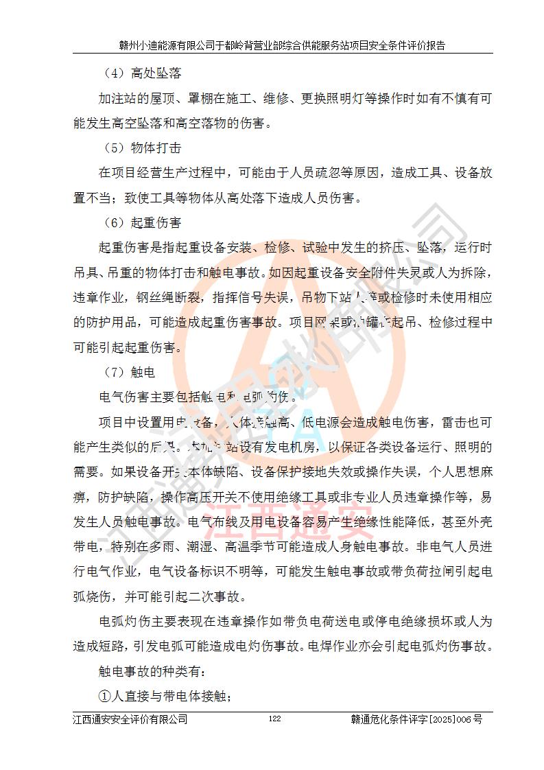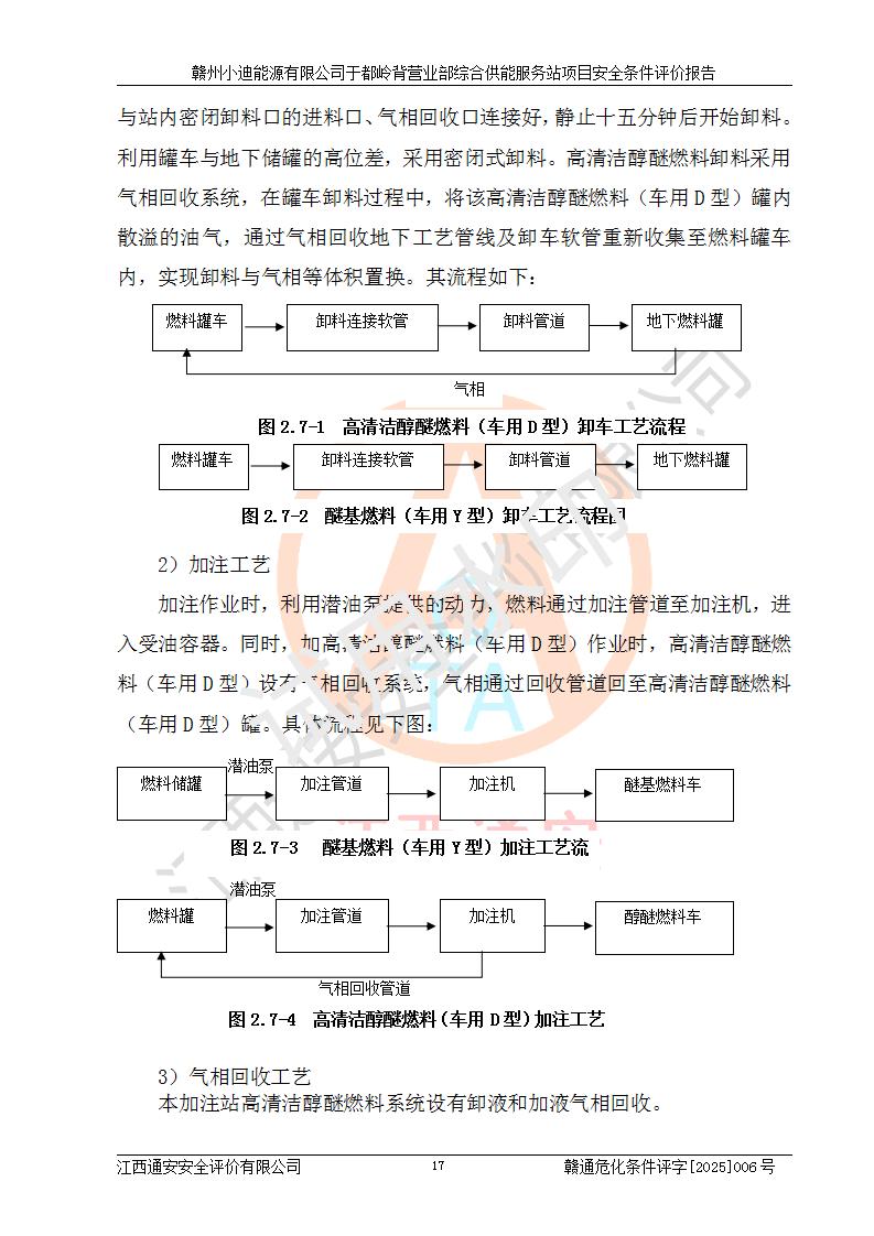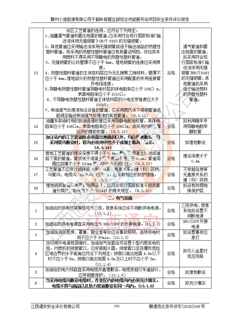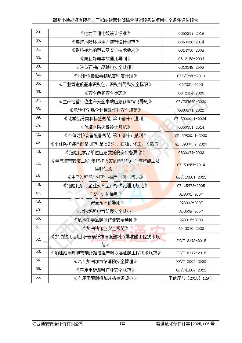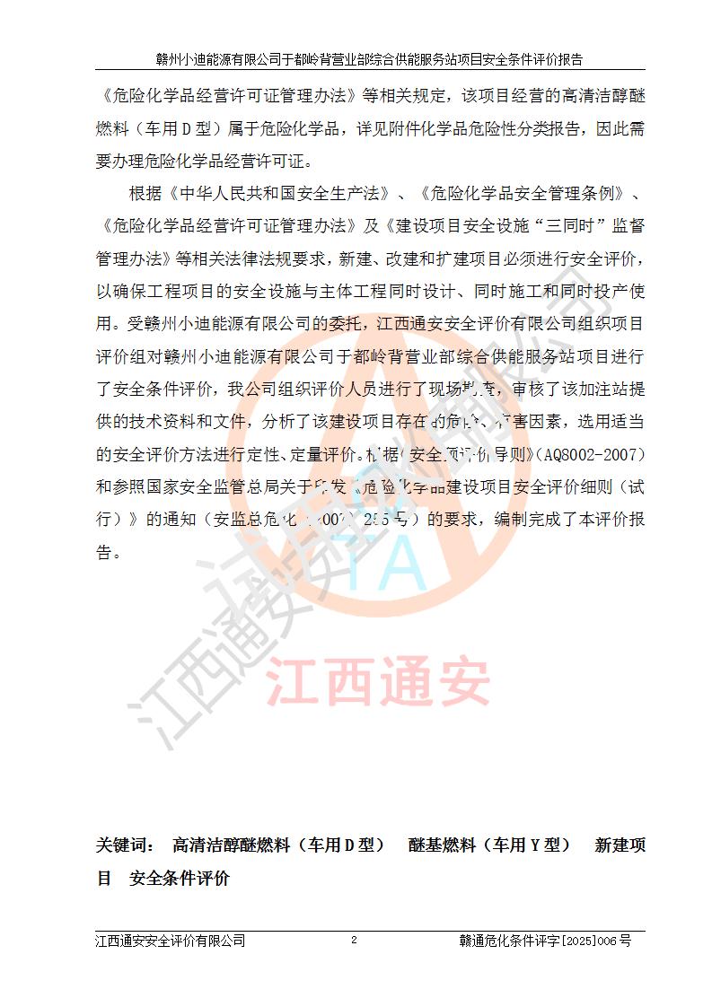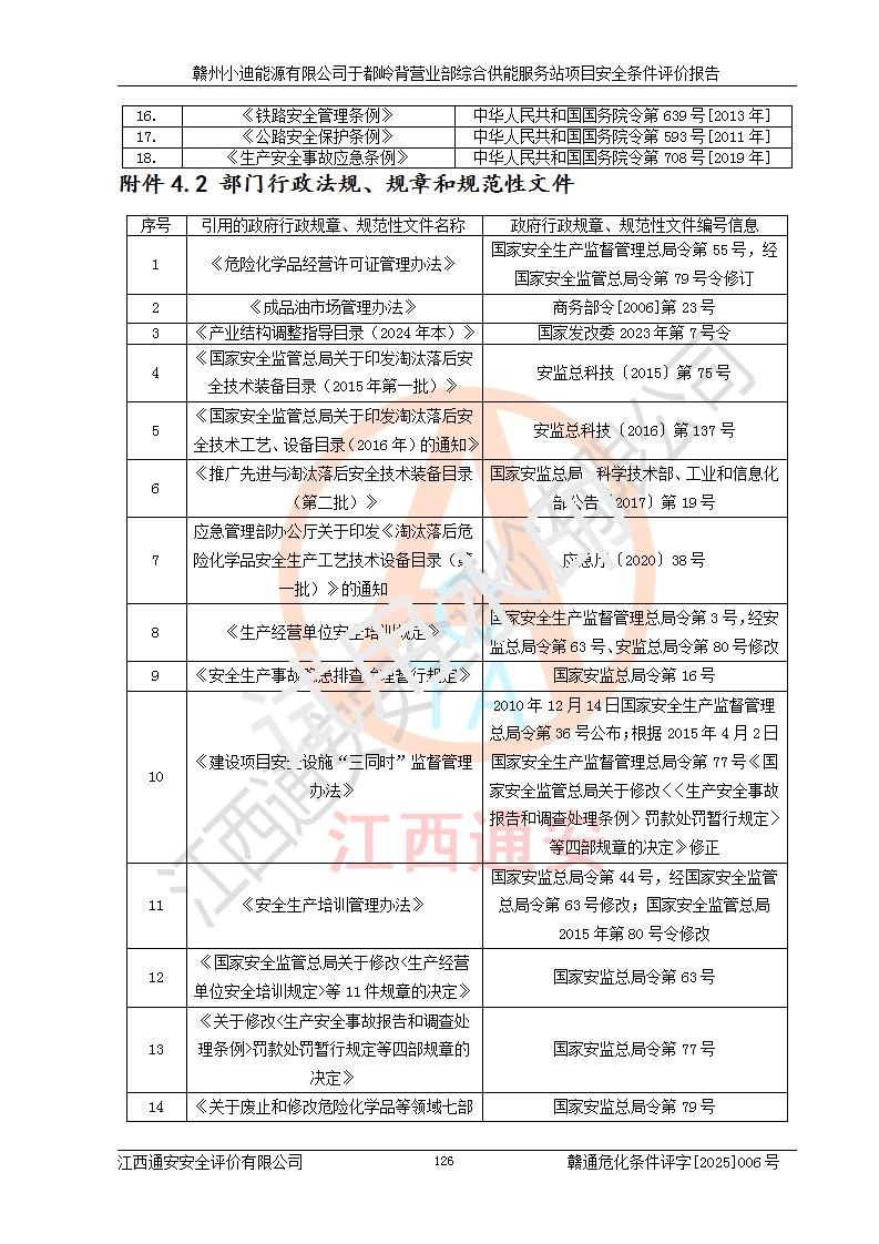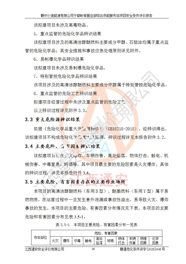 一、安全狀況綜合評(píng)述 通過(guò)對(duì)本項(xiàng)目的危險(xiǎn)、有害因素分析及定性、定量評(píng)價(jià),結(jié)果為: 1)本項(xiàng)目存在的危險(xiǎn)有害因素是火災(zāi)爆炸、**傷害、高處墜落、物體打擊、觸電、機(jī)械傷害、中毒窒息、坍塌等,主要危險(xiǎn)有害因素為火災(zāi)、爆炸等危險(xiǎn)因素。需重點(diǎn)防范的危險(xiǎn)有害因素為火災(zāi)、爆炸。本項(xiàng)目未構(gòu)成危險(xiǎn)化學(xué)品重大危險(xiǎn)源,也不存在劇毒、監(jiān)控、易制毒、易制爆化學(xué)品及高毒物品,高清潔醇醚燃料主要成分甲醇和石腦油為重點(diǎn)監(jiān)管危險(xiǎn)化學(xué)品,應(yīng)按照重點(diǎn)監(jiān)管危險(xiǎn)化學(xué)品相關(guān)規(guī)定管理。 2)預(yù)先危險(xiǎn)性分析表明該加注站儲(chǔ)存、經(jīng)營(yíng)過(guò)程中火災(zāi)、爆炸、觸電的危險(xiǎn)等級(jí)為Ⅲ級(jí),**傷害、高處墜落和中毒窒息等危險(xiǎn)等級(jí)為Ⅱ級(jí)。 3)從作業(yè)條件危險(xiǎn)性分析結(jié)果可以看出,在選定的評(píng)價(jià)單元中卸液作業(yè)、加注作業(yè)、變配電作業(yè)和維修作業(yè)中卸液作業(yè)中火災(zāi)爆炸、**傷害、觸電、中毒、窒息潛在危險(xiǎn)均為一般危險(xiǎn)。 4)從危險(xiǎn)度分析結(jié)果可以看出,燃料罐區(qū)屬中度危險(xiǎn)。 5)根據(jù)選址與總平面布置安全檢查表,該加注站符合《建筑設(shè)計(jì)防火規(guī)范》GB 50016-2014(2018年版)、《汽車加油加氣加氫站技術(shù)標(biāo)準(zhǔn)》GB50156-2021及《車用甲醇燃料加注站建設(shè)規(guī)范》(工信廳節(jié)〔2015〕129號(hào))等有關(guān)標(biāo)準(zhǔn)、規(guī)范的規(guī)定。該站與站外建筑物距離符合規(guī)范要求,站外50m內(nèi)無(wú)重要建筑物和明火設(shè)施。 6)根據(jù)立項(xiàng)批文及于都縣自然資源局出具的建設(shè)用地規(guī)劃許可證,該加注站符合有關(guān)部門的審批。 7)本項(xiàng)目采用成熟的工藝設(shè)備,項(xiàng)目在嚴(yán)格按照**相關(guān)法律、法規(guī)及技術(shù)標(biāo)準(zhǔn)制造、安裝、檢測(cè)檢驗(yàn)的情況下,其安全生產(chǎn)風(fēng)險(xiǎn)程度在可接受范圍。 8)本項(xiàng)目危害物質(zhì)為高清潔醇醚燃料(車用D型,甲類)和醚基燃料(車用Y型,丙類),應(yīng)重點(diǎn)注意火災(zāi)、爆炸危害,做好防火防靜電措施。**加注站罐區(qū)、加注區(qū)無(wú)明火產(chǎn)生;卸液口應(yīng)設(shè)置防靜電報(bào)警器,罐區(qū)法蘭應(yīng)跨接,防止靜電引起火災(zāi)爆炸事故。 四、評(píng)價(jià)結(jié)論 贛州小迪能源有限公司于都嶺背營(yíng)業(yè)部綜合供能服務(wù)站項(xiàng)目總平面布置符合相關(guān)規(guī)范的要求。在項(xiàng)目建設(shè)和運(yùn)行階段,總平面布置設(shè)計(jì)、施工圖設(shè)計(jì)和建設(shè)施工、安裝調(diào)試及生產(chǎn)運(yùn)行中,應(yīng)嚴(yán)格執(zhí)行**有關(guān)安全生產(chǎn)法律、法規(guī)和有關(guān)標(biāo)準(zhǔn)、規(guī)范,將本報(bào)告中提出的安全對(duì)策措施落實(shí)到位,真正做到安全設(shè)施與主體工程同時(shí)設(shè)計(jì)、同時(shí)施工、同時(shí)投入生產(chǎn)和使用,項(xiàng)目建成后危險(xiǎn)、有害因素可以得到**控制,安全風(fēng)險(xiǎn)在可接受范圍,擬建的贛州小迪能源有限公司于都嶺背營(yíng)業(yè)部綜合供能服務(wù)站項(xiàng)目符合法律法規(guī)、標(biāo)準(zhǔn)、規(guī)章和規(guī)范的要求。 |