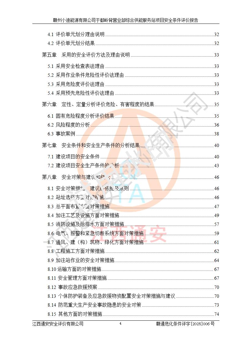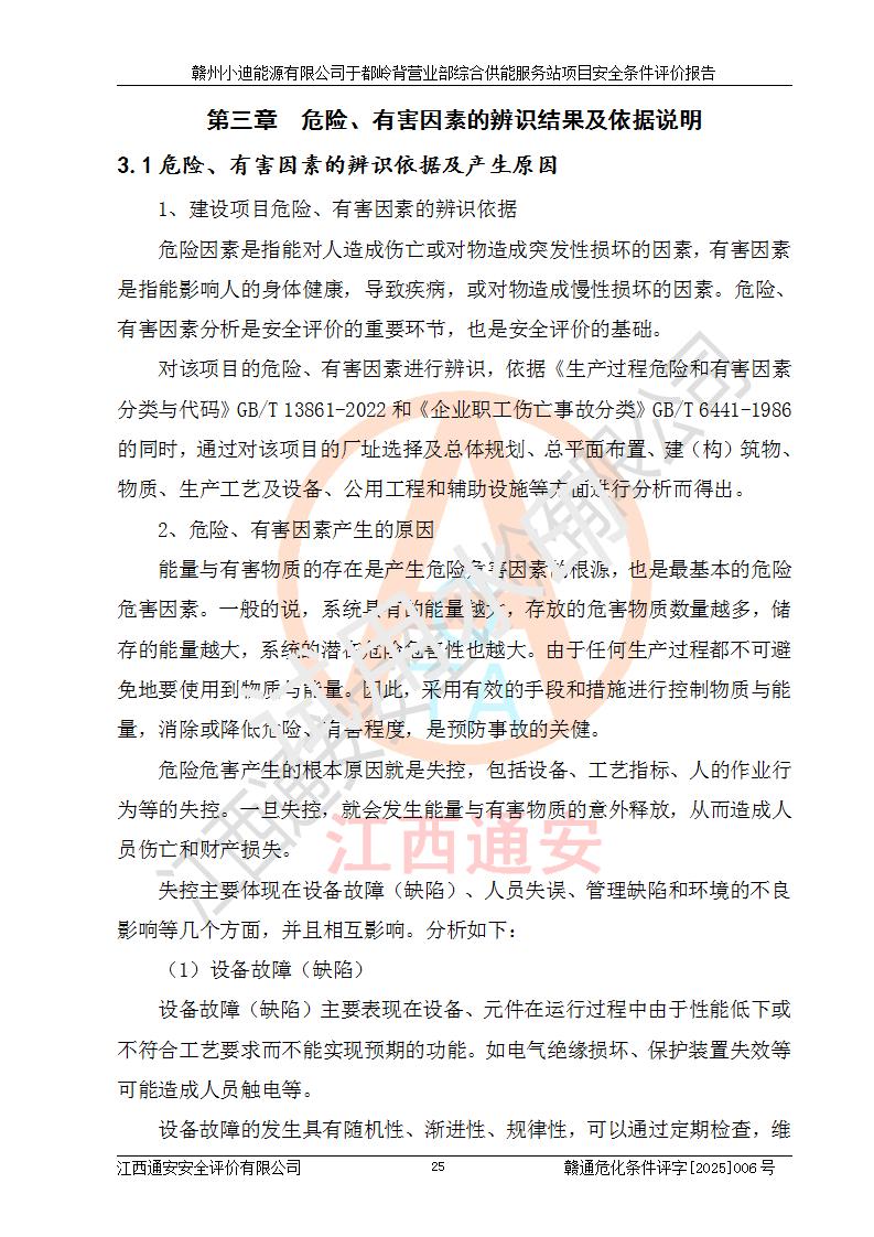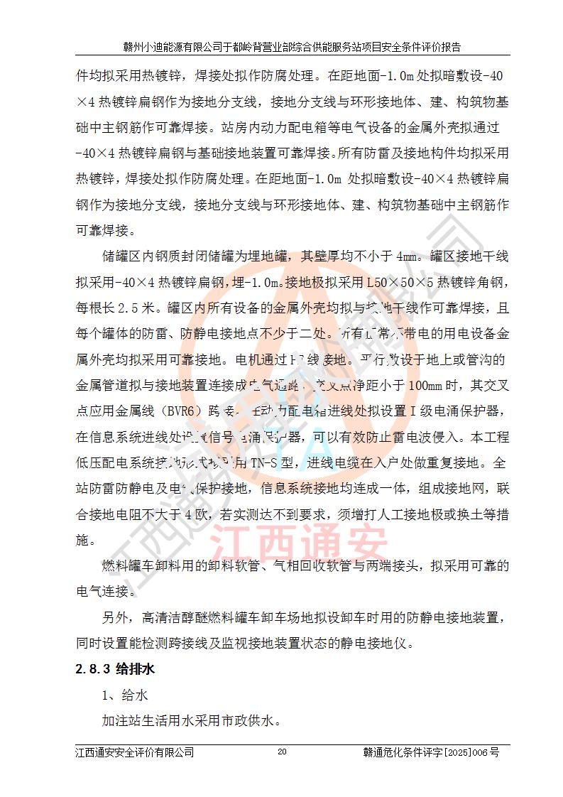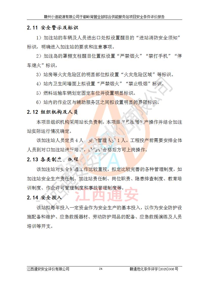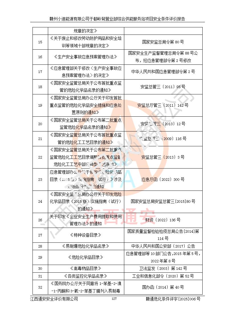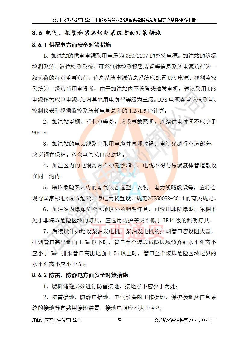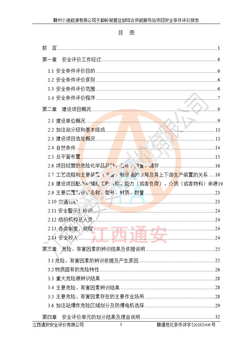 一、安全狀況綜合評(píng)述 通過(guò)對(duì)本項(xiàng)目的危險(xiǎn)、有害因素分析及定性、定量評(píng)價(jià),結(jié)果為: 1)本項(xiàng)目存在的危險(xiǎn)有害因素是火災(zāi)爆炸、**傷害、高處墜落、物體打擊、觸電、機(jī)械傷害、中毒窒息、坍塌等,主要危險(xiǎn)有害因素為火災(zāi)、爆炸等危險(xiǎn)因素。需重點(diǎn)防范的危險(xiǎn)有害因素為火災(zāi)、爆炸。本項(xiàng)目未構(gòu)成危險(xiǎn)化學(xué)品重大危險(xiǎn)源,也不存在劇毒、監(jiān)控、易制毒、易制爆化學(xué)品及高毒物品,高清潔醇醚燃料主要成分甲醇和石腦油為重點(diǎn)監(jiān)管危險(xiǎn)化學(xué)品,應(yīng)按照重點(diǎn)監(jiān)管危險(xiǎn)化學(xué)品相關(guān)規(guī)定管理。 2)預(yù)先危險(xiǎn)性分析表明該加注站儲(chǔ)存、經(jīng)營(yíng)過(guò)程中火災(zāi)、爆炸、觸電的危險(xiǎn)等級(jí)為Ⅲ級(jí),**傷害、高處墜落和中毒窒息等危險(xiǎn)等級(jí)為Ⅱ級(jí)。 3)從作業(yè)條件危險(xiǎn)性分析結(jié)果可以看出,在選定的評(píng)價(jià)單元中卸液作業(yè)、加注作業(yè)、變配電作業(yè)和維修作業(yè)中卸液作業(yè)中火災(zāi)爆炸、**傷害、觸電、中毒、窒息潛在危險(xiǎn)均為一般危險(xiǎn)。 4)從危險(xiǎn)度分析結(jié)果可以看出,燃料罐區(qū)屬中度危險(xiǎn)。 5)根據(jù)選址與總平面布置安全檢查表,該加注站符合《建筑設(shè)計(jì)防火規(guī)范》GB 50016-2014(2018年版)、《汽車加油加氣加氫站技術(shù)標(biāo)準(zhǔn)》GB50156-2021及《車用甲醇燃料加注站建設(shè)規(guī)范》(工信廳節(jié)〔2015〕129號(hào))等有關(guān)標(biāo)準(zhǔn)、規(guī)范的規(guī)定。該站與站外建筑物距離符合規(guī)范要求,站外50m內(nèi)無(wú)重要建筑物和明火設(shè)施。 6)根據(jù)立項(xiàng)批文及于都縣自然資源局出具的建設(shè)用地規(guī)劃許可證,該加注站符合有關(guān)部門的審批。 7)本項(xiàng)目采用成熟的工藝設(shè)備,項(xiàng)目在嚴(yán)格按照**相關(guān)法律、法規(guī)及技術(shù)標(biāo)準(zhǔn)制造、安裝、檢測(cè)檢驗(yàn)的情況下,其安全生產(chǎn)風(fēng)險(xiǎn)程度在可接受范圍。 8)本項(xiàng)目危害物質(zhì)為高清潔醇醚燃料(車用D型,甲類)和醚基燃料(車用Y型,丙類),應(yīng)重點(diǎn)注意火災(zāi)、爆炸危害,做好防火防靜電措施。**加注站罐區(qū)、加注區(qū)無(wú)明火產(chǎn)生;卸液口應(yīng)設(shè)置防靜電報(bào)警器,罐區(qū)法蘭應(yīng)跨接,防止靜電引起火災(zāi)爆炸事故。 四、評(píng)價(jià)結(jié)論 贛州小迪能源有限公司于都嶺背營(yíng)業(yè)部綜合供能服務(wù)站項(xiàng)目總平面布置符合相關(guān)規(guī)范的要求。在項(xiàng)目建設(shè)和運(yùn)行階段,總平面布置設(shè)計(jì)、施工圖設(shè)計(jì)和建設(shè)施工、安裝調(diào)試及生產(chǎn)運(yùn)行中,應(yīng)嚴(yán)格執(zhí)行**有關(guān)安全生產(chǎn)法律、法規(guī)和有關(guān)標(biāo)準(zhǔn)、規(guī)范,將本報(bào)告中提出的安全對(duì)策措施落實(shí)到位,真正做到安全設(shè)施與主體工程同時(shí)設(shè)計(jì)、同時(shí)施工、同時(shí)投入生產(chǎn)和使用,項(xiàng)目建成后危險(xiǎn)、有害因素可以得到**控制,安全風(fēng)險(xiǎn)在可接受范圍,擬建的贛州小迪能源有限公司于都嶺背營(yíng)業(yè)部綜合供能服務(wù)站項(xiàng)目符合法律法規(guī)、標(biāo)準(zhǔn)、規(guī)章和規(guī)范的要求。 |