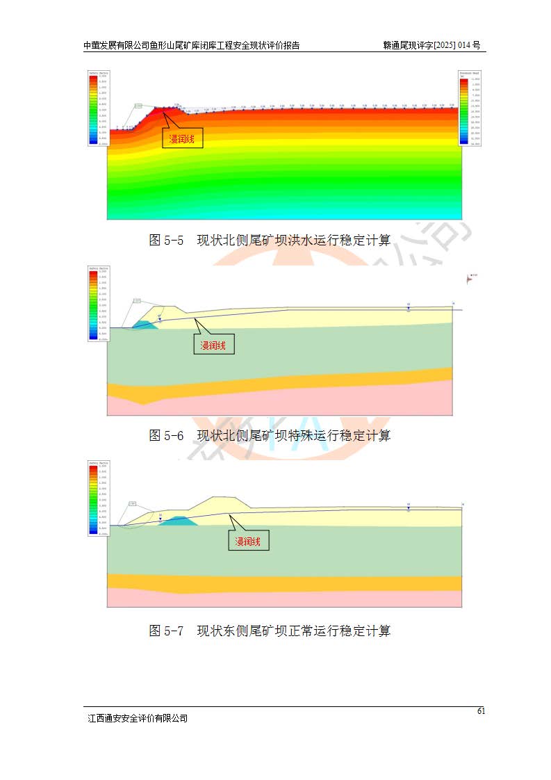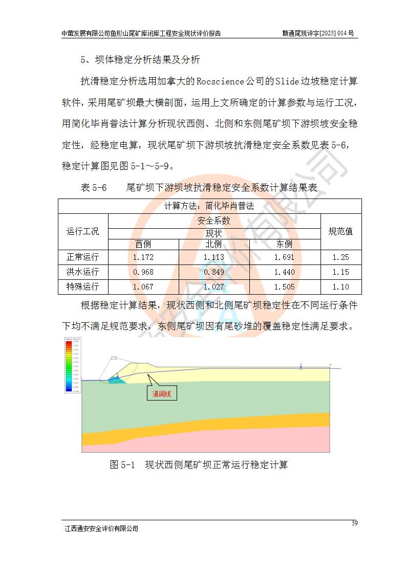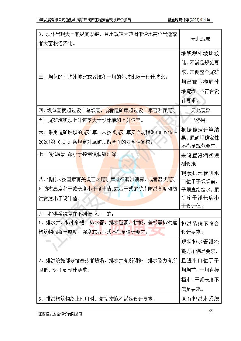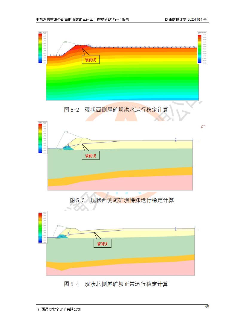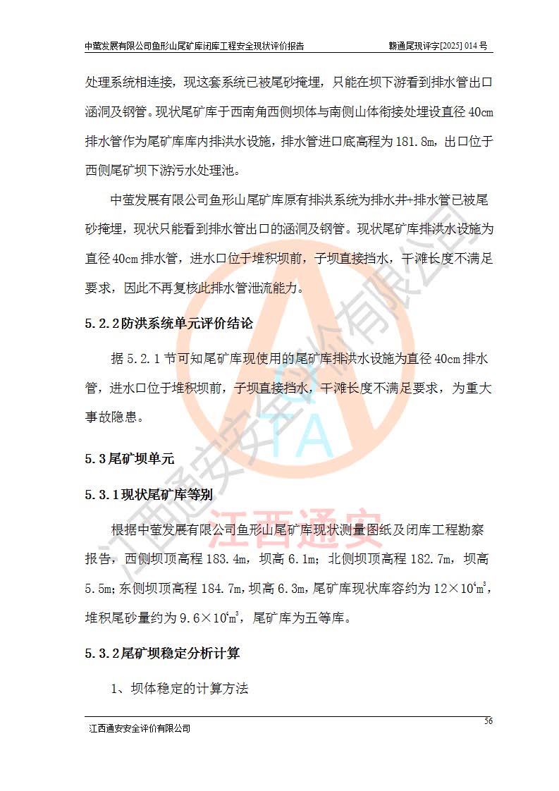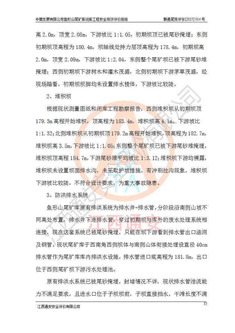 存在的問(wèn)題: 1、初期壩未設(shè)置排水棱體,下游坡比較陡,初期壩壩頂被尾砂掩埋,尾礦壩穩(wěn)定性不滿(mǎn)足規(guī)范要求; 2、堆積壩外坡比較陡,不滿(mǎn)足規(guī)范要求,東側(cè)整個(gè)尾礦壩已被下游尾砂堆掩埋,堆積壩未設(shè)置壩面排水溝,未采取護(hù)坡措施,有沖刷拉溝現(xiàn)象; 3、原有排洪水系統(tǒng)已被尾砂掩埋,封堵情況不詳,現(xiàn)狀排水管泄流能力不滿(mǎn)足要求,且進(jìn)水口位于子壩壩前,子壩直接擋水,干灘長(zhǎng)度不滿(mǎn)足要求; 4、尾礦壩上未設(shè)置安全監(jiān)測(cè)設(shè)施,安全標(biāo)志偏少; 5、未按設(shè)計(jì)進(jìn)行尾砂回采,在庫(kù)內(nèi)形成積水坑,且積水坑內(nèi)積水無(wú)法排出; 6、尾礦庫(kù)不再進(jìn)行尾砂回采,也不再使用,應(yīng)進(jìn)行閉庫(kù)。 整改措施: 1、在初期壩下游增設(shè)干砌塊石貼坡排水體,增加壩體穩(wěn)定性,在北側(cè)和東側(cè)初期壩壩腳增設(shè)壩腳排水溝。 2、對(duì)堆積壩削坡,增加壩體的穩(wěn)定性,削坡后覆土植草皮護(hù)坡,修建壩面壩肩排水溝。 3、新建溢洪道用于閉庫(kù)后尾礦庫(kù)排洪排水,拆除現(xiàn)有排水管;對(duì)原排洪系統(tǒng)進(jìn)行封堵。 4、閉庫(kù)時(shí)在尾礦壩上增設(shè)安全監(jiān)測(cè)設(shè)施,增設(shè)安全標(biāo)志。 5、對(duì)庫(kù)內(nèi)積水坑進(jìn)行平整。 6、應(yīng)進(jìn)行閉庫(kù),整治尾礦庫(kù)庫(kù)內(nèi)干灘面,為防止干灘面水土流失,覆土植草,覆土范圍為整個(gè)庫(kù)區(qū)范圍。在庫(kù)內(nèi)干灘面設(shè)置庫(kù)面排水溝,截洪溝、新建溢洪道,形成庫(kù)內(nèi)排水網(wǎng),能**的將庫(kù)內(nèi)雨水排至庫(kù)外。 |