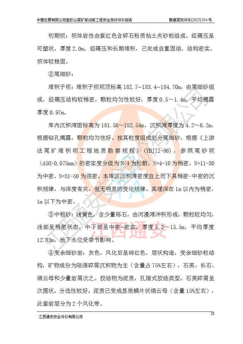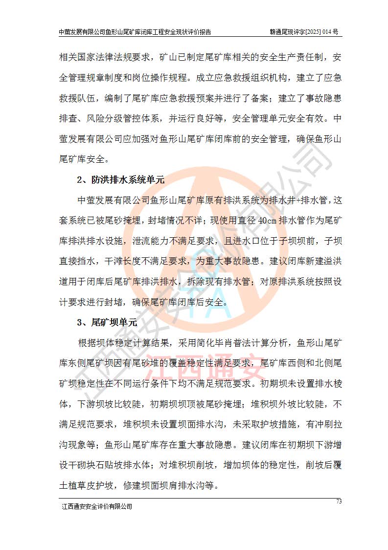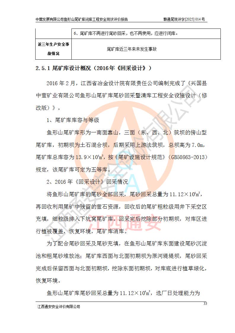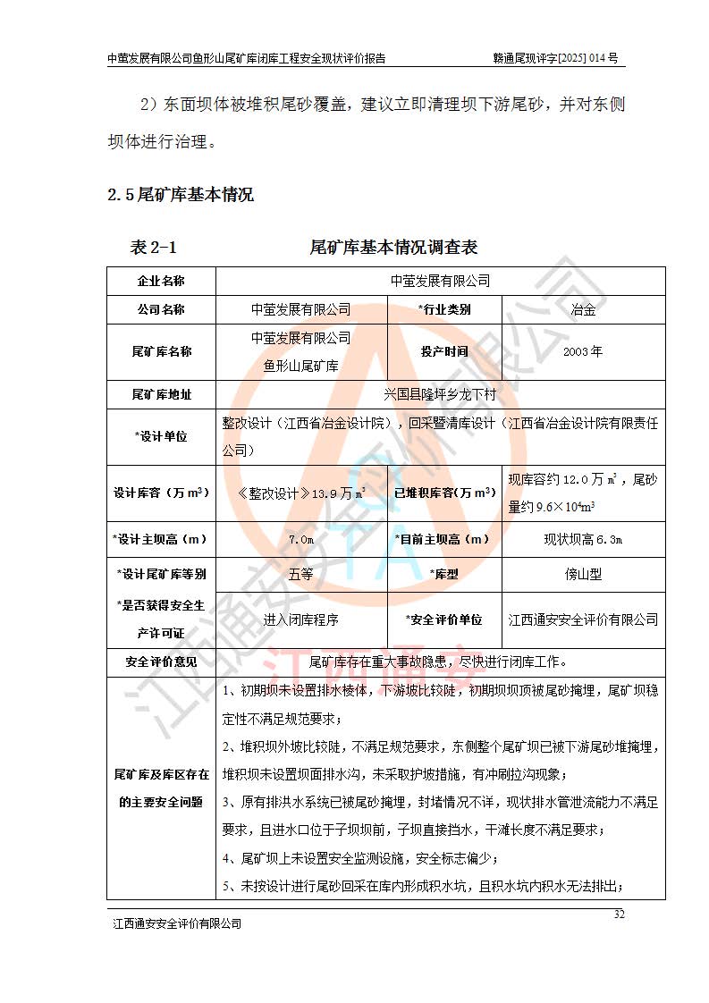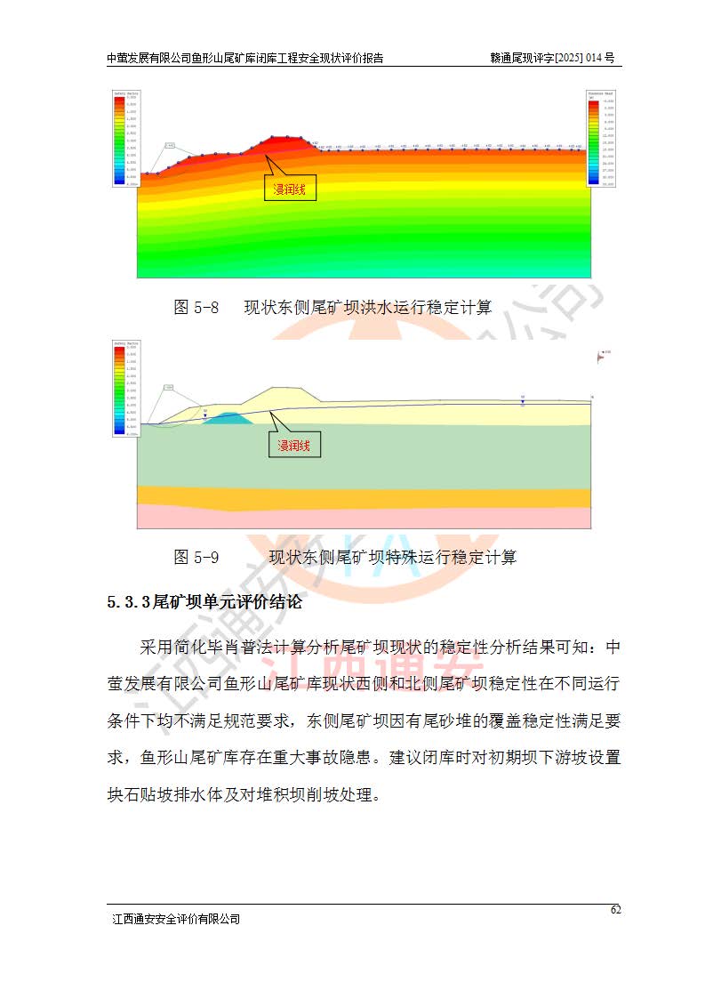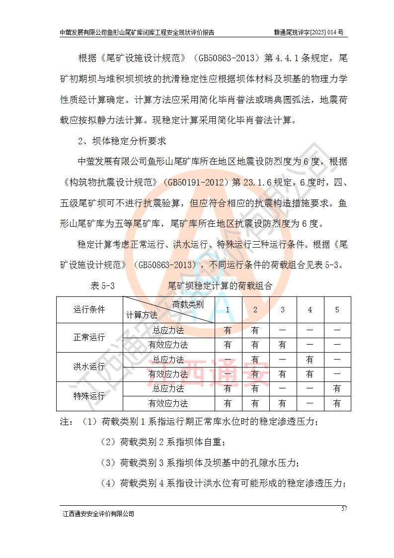 存在的問(wèn)題: 1、初期壩未設(shè)置排水棱體,下游坡比較陡,初期壩壩頂被尾砂掩埋,尾礦壩穩(wěn)定性不滿(mǎn)足規(guī)范要求; 2、堆積壩外坡比較陡,不滿(mǎn)足規(guī)范要求,東側(cè)整個(gè)尾礦壩已被下游尾砂堆掩埋,堆積壩未設(shè)置壩面排水溝,未采取護(hù)坡措施,有沖刷拉溝現(xiàn)象; 3、原有排洪水系統(tǒng)已被尾砂掩埋,封堵情況不詳,現(xiàn)狀排水管泄流能力不滿(mǎn)足要求,且進(jìn)水口位于子壩壩前,子壩直接擋水,干灘長(zhǎng)度不滿(mǎn)足要求; 4、尾礦壩上未設(shè)置安全監(jiān)測(cè)設(shè)施,安全標(biāo)志偏少; 5、未按設(shè)計(jì)進(jìn)行尾砂回采,在庫(kù)內(nèi)形成積水坑,且積水坑內(nèi)積水無(wú)法排出; 6、尾礦庫(kù)不再進(jìn)行尾砂回采,也不再使用,應(yīng)進(jìn)行閉庫(kù)。 整改措施: 1、在初期壩下游增設(shè)干砌塊石貼坡排水體,增加壩體穩(wěn)定性,在北側(cè)和東側(cè)初期壩壩腳增設(shè)壩腳排水溝。 2、對(duì)堆積壩削坡,增加壩體的穩(wěn)定性,削坡后覆土植草皮護(hù)坡,修建壩面壩肩排水溝。 3、新建溢洪道用于閉庫(kù)后尾礦庫(kù)排洪排水,拆除現(xiàn)有排水管;對(duì)原排洪系統(tǒng)進(jìn)行封堵。 4、閉庫(kù)時(shí)在尾礦壩上增設(shè)安全監(jiān)測(cè)設(shè)施,增設(shè)安全標(biāo)志。 5、對(duì)庫(kù)內(nèi)積水坑進(jìn)行平整。 6、應(yīng)進(jìn)行閉庫(kù),整治尾礦庫(kù)庫(kù)內(nèi)干灘面,為防止干灘面水土流失,覆土植草,覆土范圍為整個(gè)庫(kù)區(qū)范圍。在庫(kù)內(nèi)干灘面設(shè)置庫(kù)面排水溝,截洪溝、新建溢洪道,形成庫(kù)內(nèi)排水網(wǎng),能**的將庫(kù)內(nèi)雨水排至庫(kù)外。 |