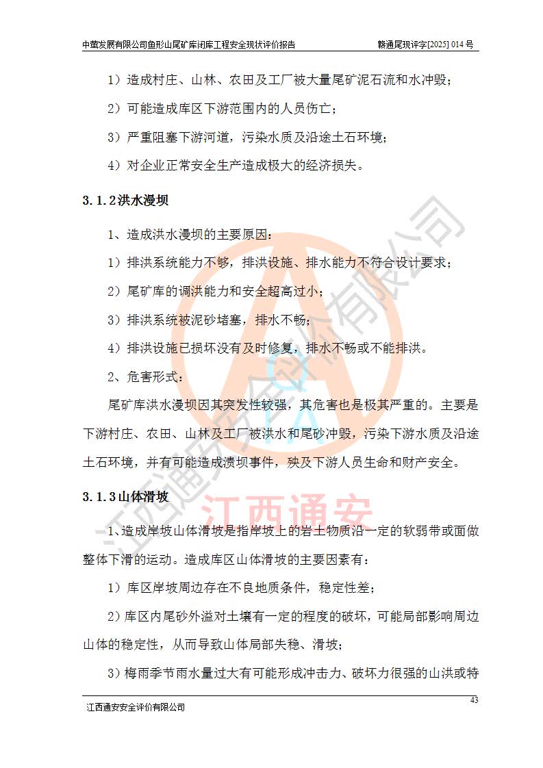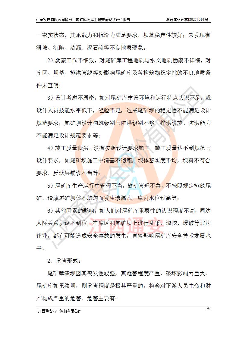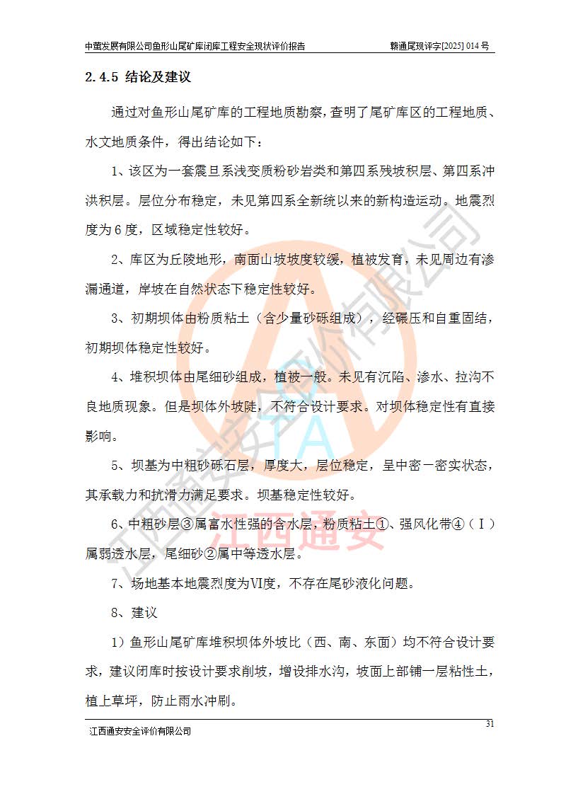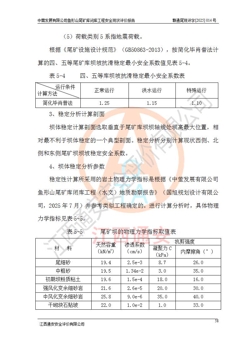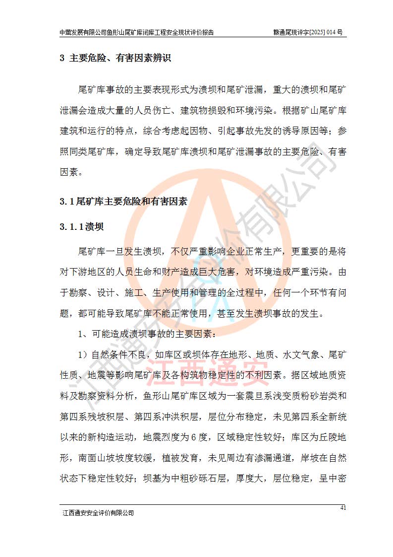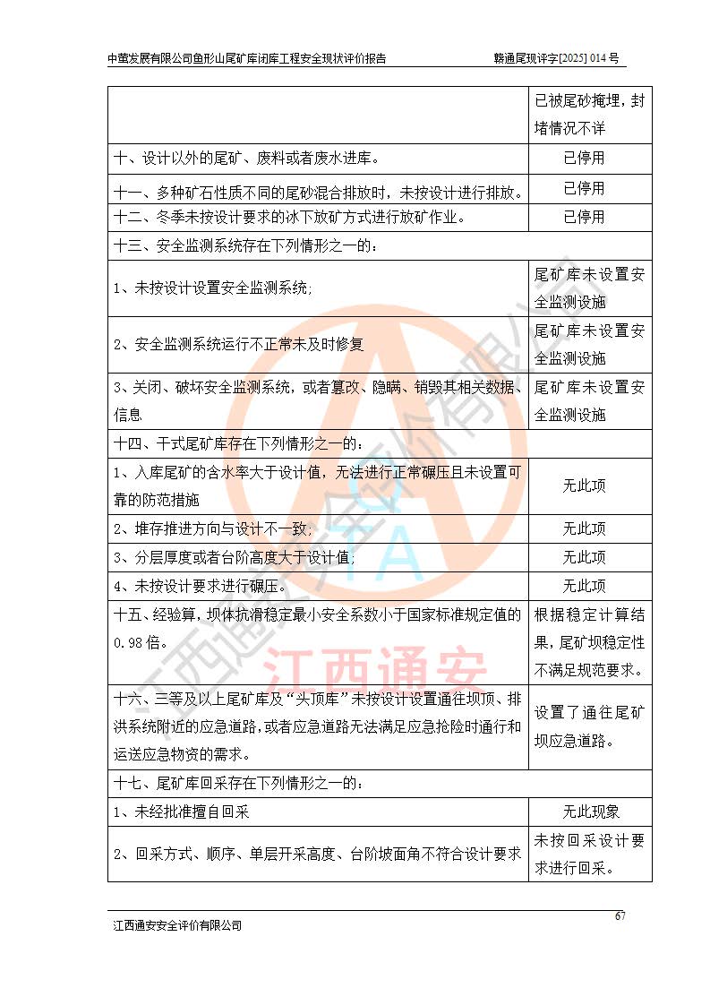 存在的問(wèn)題: 1、初期壩未設(shè)置排水棱體,下游坡比較陡,初期壩壩頂被尾砂掩埋,尾礦壩穩(wěn)定性不滿(mǎn)足規(guī)范要求; 2、堆積壩外坡比較陡,不滿(mǎn)足規(guī)范要求,東側(cè)整個(gè)尾礦壩已被下游尾砂堆掩埋,堆積壩未設(shè)置壩面排水溝,未采取護(hù)坡措施,有沖刷拉溝現(xiàn)象; 3、原有排洪水系統(tǒng)已被尾砂掩埋,封堵情況不詳,現(xiàn)狀排水管泄流能力不滿(mǎn)足要求,且進(jìn)水口位于子壩壩前,子壩直接擋水,干灘長(zhǎng)度不滿(mǎn)足要求; 4、尾礦壩上未設(shè)置安全監(jiān)測(cè)設(shè)施,安全標(biāo)志偏少; 5、未按設(shè)計(jì)進(jìn)行尾砂回采,在庫(kù)內(nèi)形成積水坑,且積水坑內(nèi)積水無(wú)法排出; 6、尾礦庫(kù)不再進(jìn)行尾砂回采,也不再使用,應(yīng)進(jìn)行閉庫(kù)。 整改措施: 1、在初期壩下游增設(shè)干砌塊石貼坡排水體,增加壩體穩(wěn)定性,在北側(cè)和東側(cè)初期壩壩腳增設(shè)壩腳排水溝。 2、對(duì)堆積壩削坡,增加壩體的穩(wěn)定性,削坡后覆土植草皮護(hù)坡,修建壩面壩肩排水溝。 3、新建溢洪道用于閉庫(kù)后尾礦庫(kù)排洪排水,拆除現(xiàn)有排水管;對(duì)原排洪系統(tǒng)進(jìn)行封堵。 4、閉庫(kù)時(shí)在尾礦壩上增設(shè)安全監(jiān)測(cè)設(shè)施,增設(shè)安全標(biāo)志。 5、對(duì)庫(kù)內(nèi)積水坑進(jìn)行平整。 6、應(yīng)進(jìn)行閉庫(kù),整治尾礦庫(kù)庫(kù)內(nèi)干灘面,為防止干灘面水土流失,覆土植草,覆土范圍為整個(gè)庫(kù)區(qū)范圍。在庫(kù)內(nèi)干灘面設(shè)置庫(kù)面排水溝,截洪溝、新建溢洪道,形成庫(kù)內(nèi)排水網(wǎng),能**的將庫(kù)內(nèi)雨水排至庫(kù)外。 |
