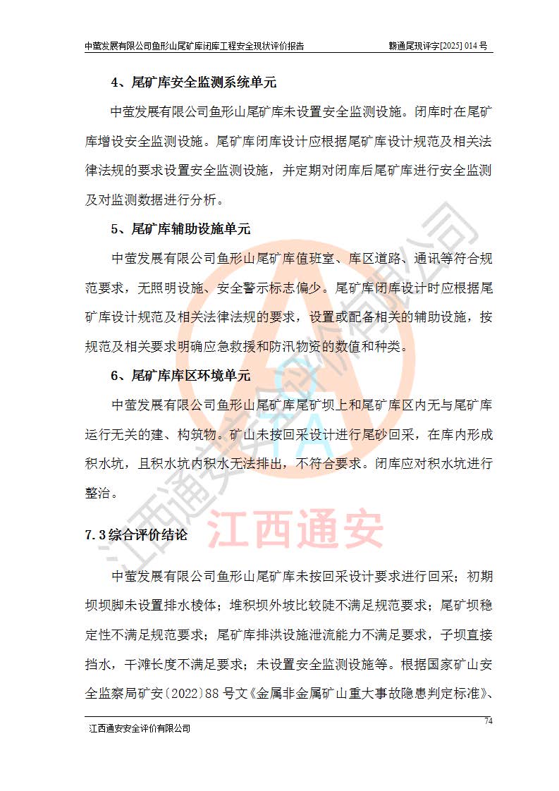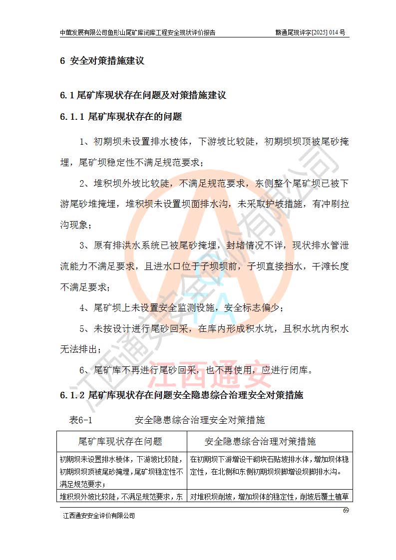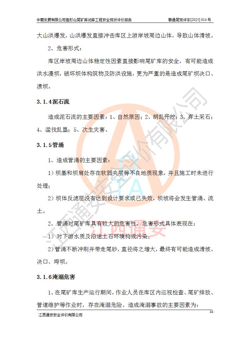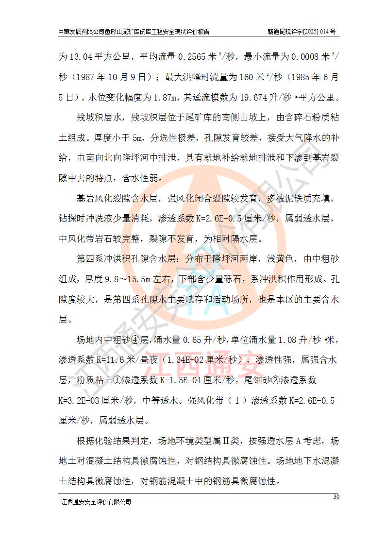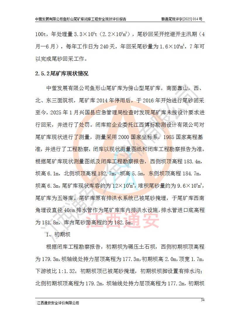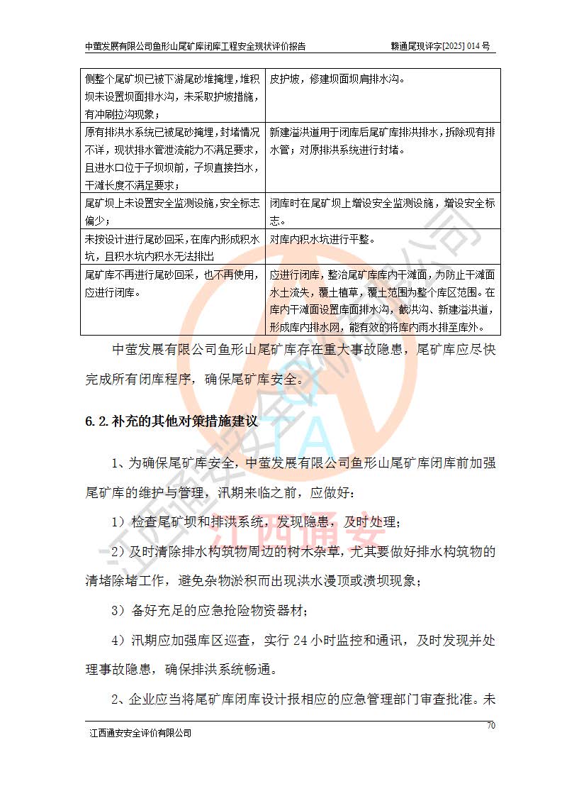 存在的問(wèn)題: 1、初期壩未設(shè)置排水棱體,下游坡比較陡,初期壩壩頂被尾砂掩埋,尾礦壩穩(wěn)定性不滿(mǎn)足規(guī)范要求; 2、堆積壩外坡比較陡,不滿(mǎn)足規(guī)范要求,東側(cè)整個(gè)尾礦壩已被下游尾砂堆掩埋,堆積壩未設(shè)置壩面排水溝,未采取護(hù)坡措施,有沖刷拉溝現(xiàn)象; 3、原有排洪水系統(tǒng)已被尾砂掩埋,封堵情況不詳,現(xiàn)狀排水管泄流能力不滿(mǎn)足要求,且進(jìn)水口位于子壩壩前,子壩直接擋水,干灘長(zhǎng)度不滿(mǎn)足要求; 4、尾礦壩上未設(shè)置安全監(jiān)測(cè)設(shè)施,安全標(biāo)志偏少; 5、未按設(shè)計(jì)進(jìn)行尾砂回采,在庫(kù)內(nèi)形成積水坑,且積水坑內(nèi)積水無(wú)法排出; 6、尾礦庫(kù)不再進(jìn)行尾砂回采,也不再使用,應(yīng)進(jìn)行閉庫(kù)。 整改措施: 1、在初期壩下游增設(shè)干砌塊石貼坡排水體,增加壩體穩(wěn)定性,在北側(cè)和東側(cè)初期壩壩腳增設(shè)壩腳排水溝。 2、對(duì)堆積壩削坡,增加壩體的穩(wěn)定性,削坡后覆土植草皮護(hù)坡,修建壩面壩肩排水溝。 3、新建溢洪道用于閉庫(kù)后尾礦庫(kù)排洪排水,拆除現(xiàn)有排水管;對(duì)原排洪系統(tǒng)進(jìn)行封堵。 4、閉庫(kù)時(shí)在尾礦壩上增設(shè)安全監(jiān)測(cè)設(shè)施,增設(shè)安全標(biāo)志。 5、對(duì)庫(kù)內(nèi)積水坑進(jìn)行平整。 6、應(yīng)進(jìn)行閉庫(kù),整治尾礦庫(kù)庫(kù)內(nèi)干灘面,為防止干灘面水土流失,覆土植草,覆土范圍為整個(gè)庫(kù)區(qū)范圍。在庫(kù)內(nèi)干灘面設(shè)置庫(kù)面排水溝,截洪溝、新建溢洪道,形成庫(kù)內(nèi)排水網(wǎng),能**的將庫(kù)內(nèi)雨水排至庫(kù)外。 |